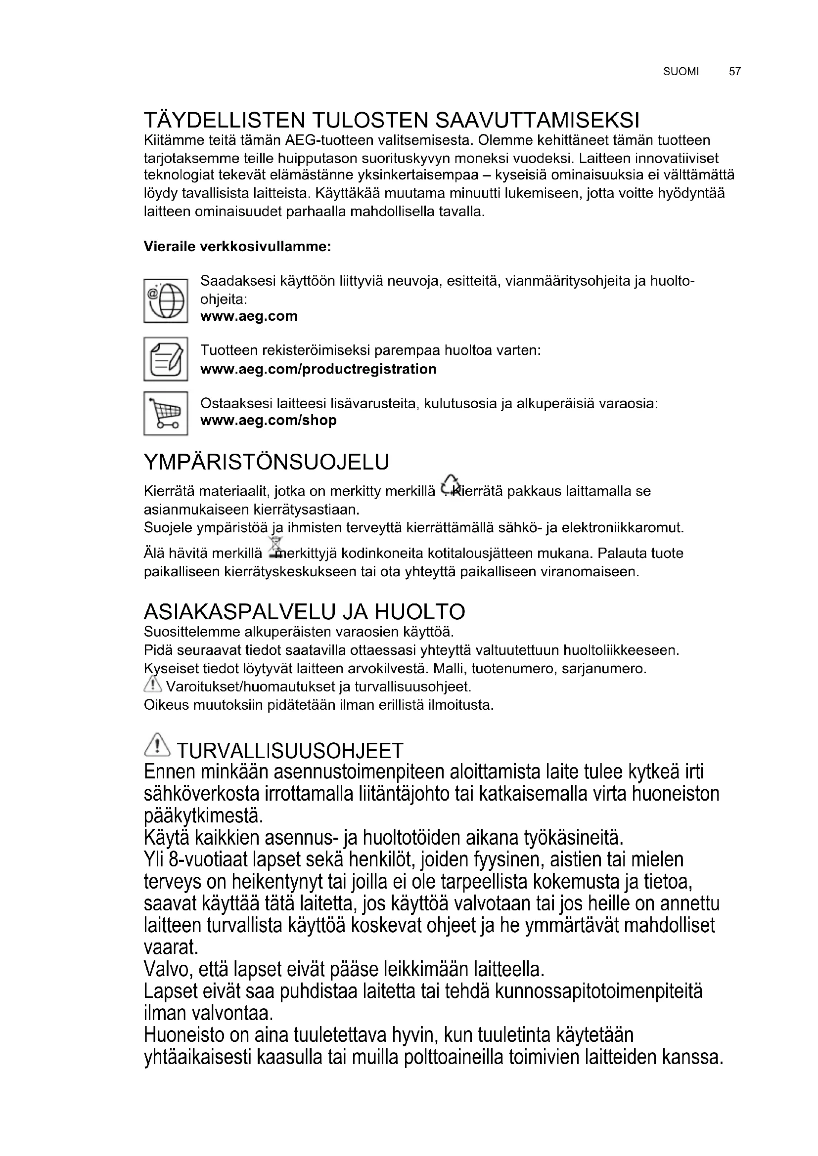 Kiitämme teitä tämän AEG-tuotteen valitsemisesta. Olemme kehittäneet tämän tuotteen tarjotaksemme teille huipputason suorituskyvyn moneksi vuodeksi. Laitteen innovatiiviset teknologiat tekevät elämästänne yksinkertaisempaa – kyseisiä ominaisuuksia ei välttämättä löydy tavallisista laitteista. Käyttäkää muutama minuutti lukemiseen, jotta voitte hyödyntää laitteen ominaisuudet parhaalla mahdollisella tavalla. Vieraile verkkosivullamme: Saadaksesi käyttöön liittyviä neuvoja, esitteitä, vianmääritysohjeita ja huolto- ohjeita: www.aeg.com Tuotteen rekisteröimiseksi parempaa huoltoa varten: www.aeg.com/productregistration Ostaaksesi laitteesi lisävarusteita, kulutusosia ja alkuperäisiä varaosia: www.aeg.com/shop