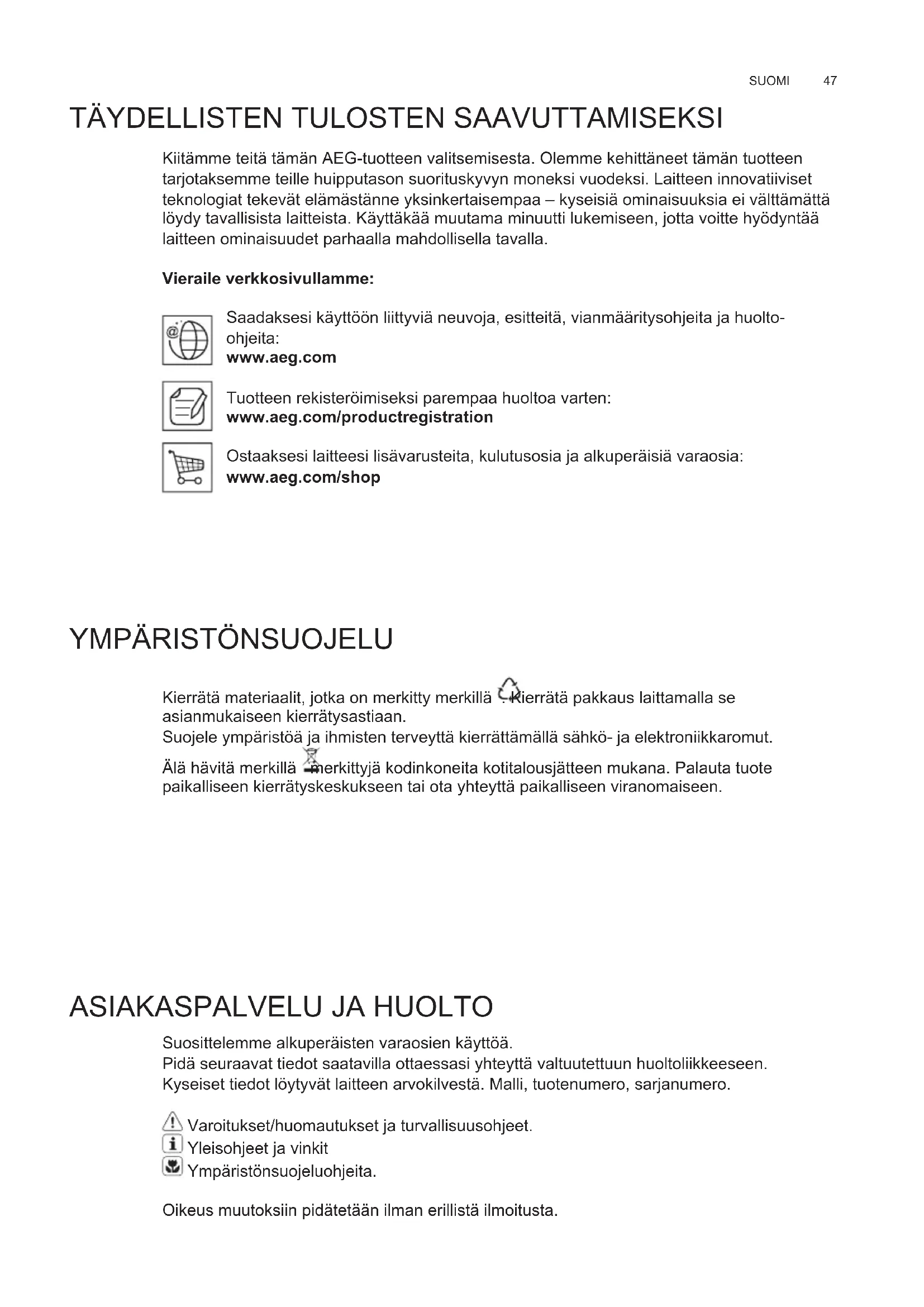 Suosittelemme alkuperäisten varaosien käyttöä. Pidä seuraavat tiedot saatavilla ottaessasi yhteyttä valtuutettuun huoltoliikkeeseen. Kyseiset tiedot löytyvät laitteen arvokilvestä. Malli, tuotenumero, sarjanumero. Varoitukset/huomautukset ja turvallisuusohjeet. Yleisohjeet ja vinkit Ympäristönsuojeluohjeita. Oikeus muutoksiin pidätetään ilman erillistä ilmoitusta. FI KÄYTTÖOHJEETwww.aeg.com