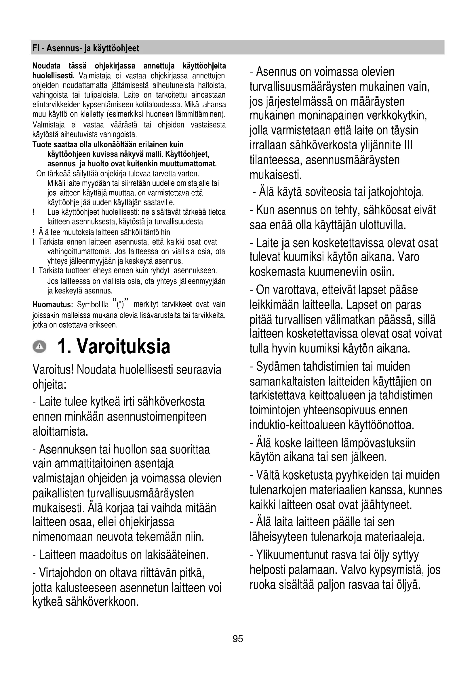 Varoitus! Noudata huolellisesti seuraavia ohjeita: - Laite tulee kytkeä irti sähköverkosta ennen minkään asennustoimenpiteen aloittamista. - Asennuksen tai huollon saa suorittaa vain ammattitaitoinen asentaja valmistajan ohjeiden ja voimassa olevien paikallisten turvallisuusmääräysten mukaisesti. Älä korjaa tai vaihda mitään laitteen osaa, ellei ohjekirjassa nimenomaan neuvota tekemään niin. - Laitteen maadoitus on lakisääteinen. - Virtajohdon on oltava riittävän pitkä, jotta kalusteeseen asennetun laitteen voi kytkeä sähköverkkoon. - Asennus on voimassa olevien turvallisuusmääräysten mukainen vain, jos järjestelmässä on määräysten mukainen moninapainen verkkokytkin, jolla varmistetaan että laite on täysin irrallaan sähköverkosta ylijännite III tilanteessa, asennusmääräysten mukaisesti. - Älä käytä soviteosia tai jatkojohtoja. - Kun asennus on tehty, sähköosat eivät saa enää olla käyttäjän ulottuvilla. - Laite ja sen kosketettavissa olevat osat tulevat kuumiksi käytön aikana. Varo koskemasta kuumeneviin osiin. - On varottava, etteivät lapset pääse leikkimään laitteella. Lapset on paras pitää turvallisen välimatkan päässä, sillä laitteen kosketettavissa olevat osat voivat tulla hyvin kuumiksi käytön aikana. - Sydämen tahdistimien tai muiden samankaltaisten laitteiden käyttäjien on tarkistettava keittoalueen ja tahdistimen toimintojen yhteensopivuus ennen induktio-keittoalueen käyttöönottoa. - Älä koske laitteen lämpövastuksiin käytön aikana tai sen jälkeen. - Vältä kosketusta pyyhkeiden tai muiden tulenarkojen materiaalien kanssa, kunnes kaikki laitteen osat ovat jäähtyneet. - Älä laita laitteen päälle tai sen läheisyyteen tulenarkoja materiaaleja. - Ylikuumentunut rasva tai öljy syttyy helposti palamaan. Valvo kypsymistä, jos ruoka sisältää paljon rasvaa tai öljyä.96 Jos pinnalla esiintyy halkeama, sammuta laite estääksesi sähköiskujen syntymisen mahdollisuutta. - Laite ei ole tarkoitettu käytettäväksi ulkopuolisen ajastimen tai erillisen kauko- ohjauksen kanssa. - Rasvassa tai öljyssä kypsentäminen keittotasolla ilman valvontaa voi olla vaarallista ja se voi aiheuttaa tulipalovaaran. - Älä jätä keittotasoa toimimaan ilman valvontaa. Nopeaa kypsennystä on valvottava koko ajan. - ÄLÄ KOSKAAN yritä sammuttaa tulipaloa vedellä. Kytke sen sijaan laite irti sähköverkosta ja peitä liekit esimerkiksi kannella tai sammutushuovalla. Tulipalovaara: älä jätä esineitä keittotasojen päälle. - Älä käytä höyrypesuria. - Älä laita keittotasolle metalliesineitä kuten veitsiä, haarukoita, lusikoita ja kansia, koska ne voivat kuumentua. - Ennen kuin laitemalli kytketään sähköverkkoon: tarkista tuotekilvestä (joka sijaitsee laitteen alaosassa), että sähköverkon jännite ja teho soveltuvat laitteeseen sekä varmista liitäntäpistorasian soveltuvuus. Epäselvissä tapauksissa ota yhteyttä pätevään sähköasentajaan. Tärkeää: - Kytke keittotaso pois päältä käytön jälkeen sen omasta kytkimestä. Älä luota puuttuvista kattiloista kertoviin merkkivaloihin. - Vältä nesteiden ylikiehumista, kun keität tai lämmität nesteitä, alenna lämpöä. - Älä jätä keittotasoa päälle käyttämättömänä, älä myöskään jätä tyhjiä keittoastioita kuumalle keittotasolle. - Kun olet lopettanut keittotason käytön, sammuta vastaava alue. - Älä käytä kypsentämiseen alumiinifoliota, äläkä koskaan laske alumiinifolioon pakattuja tuotteita suoraan keittotasolle. Alumiinin sulaminen aiheuttaisi sille korjaamattoman vahingon. - Älä koskaan lämmitä ruokaa sisältävää suljettua peltitölkkiä tai säilykepurkkia: se voi räjähtää! Tämä varoitus koskee kaikkia keittotasomalleja. - Korkea tehon käyttö kuten Booster – toiminto ei sovellu joidenkin nesteiden kuumentamiseen kuten käristyksessä käytettävään öljyyn. Liiallinen kuumuus voi olla vaarallinen. Näissä tapauksissa on suositeltavaa käyttää pienempää tehoa. - Keittoastiat tulee asettaa keittotasolle ja niiden on oltava tason keskellä. Älä missään tapauksessa aseta muita esineitä kattilan ja keittotason väliin. - Korkeissa lämpötiloissa laite vähentää automaattisesti keittoalueiden tehoa. Ennen huoltotoimenpiteiden aloittamista, kytke laite irti sähköverkosta irrottamalla pistoke tai kytkemällä huoneiston pääkatkaisin pois päältä.97 Kaikkien asennukseen ja huoltoon liittyvien toimenpiteiden aikana suojaa kädet työkäsineillä. Laitteen käyttö on sallittu vähintään 8- vuotiaille lapsille ja sellaisille henkilöille, joiden fyysinen, aisteihin liittyvä tai hen- kinen toimintakyky on rajoittunut tai joilla ei ole kokemusta tai tietoa laitteen käytöstä sillä ehdolla, että heitä valvo- taan ja opastetaan laitteen turvalliseen käyttöön liittyen ja että he tuntevat sen käyttöön liittyvät vaarat. Lapsia on valvottava sen varmistam- iseksi, etteivät he leiki laitteella. Lapset eivät saa suorittaa puhdistusta ja huoltoa ilman valvontaa. Kun liesituuletinta käytetään samanai- kaisesti muiden kaasua tai muita polt- toaineita käyttävien laitteiden kanssa, huoneessa on oltava riittävä tuuletus. Liesituuletin tulee puhdistaa usein sekä sisä- että ulkopuolelta (VÄHINTÄÄN KERRAN VUODESSA), noudattamalla joka tapauksessa käyttöohjeessa ni- menomaisesti annettuja aikoja. Liesituulettimen puhdistukseen ja vaihtoon sekä suodattimien puhdistuk- seen kuuluvien määräysten noudatta- matta jättäminen aiheuttaa tulipa- lovaaran. On ehdottomasti kiellettyä liekittää ruokia. Avotulen käyttö on vahingollista suodat- timille ja voi aiheuttaa tulipaloja. Näin ol- len sen käyttöä on vältettävä joka tapau- ksessa. Paistaminen on suoritettava yksinomaan valvonnan alla, jotta voidaan välttää yli- kuumentuneen öljyn syttymistä pala- maan. VAROITUS: Kun keittotaso toimii, liesi- tuulettimen osat voivat tulla kuumiksi. Varoitus! Äl