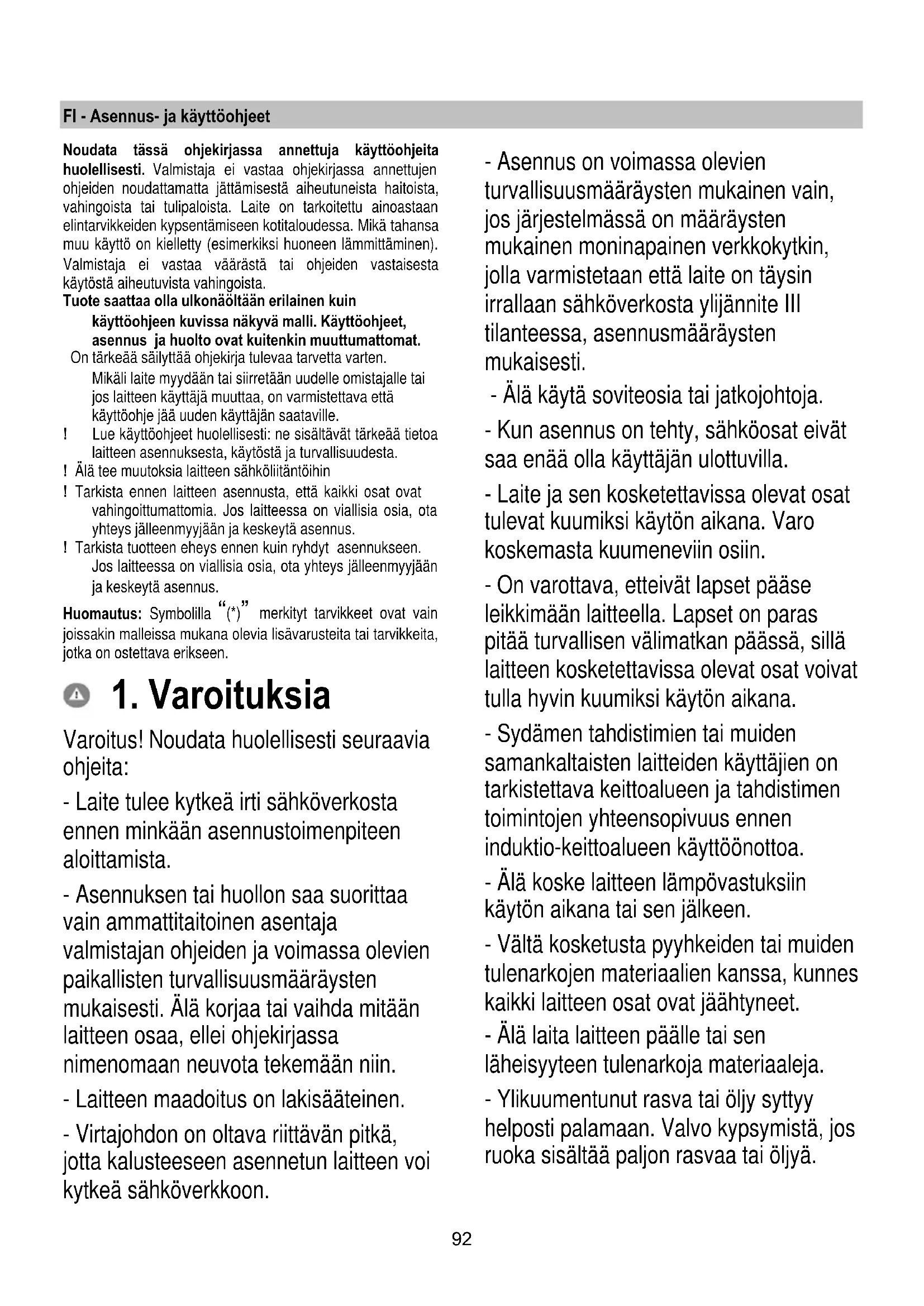 Varoitus! Noudata huolellisesti seuraavia ohjeita: - Laite tulee kytkeä irti sähköverkosta ennen minkään asennustoimenpiteen aloittamista. - Asennuksen tai huollon saa suorittaa vain ammattitaitoinen asentaja valmistajan ohjeiden ja voimassa olevien paikallisten turvallisuusmääräysten mukaisesti. Älä korjaa tai vaihda mitään laitteen osaa, ellei ohjekirjassa nimenomaan neuvota tekemään niin. - Laitteen maadoitus on lakisääteinen. - Virtajohdon on oltava riittävän pitkä, jotta kalusteeseen asennetun laitteen voi kytkeä sähköverkkoon. - Asennus on voimassa olevien turvallisuusmääräysten mukainen vain, jos järjestelmässä on määräysten mukainen moninapainen verkkokytkin, jolla varmistetaan että laite on täysin irrallaan sähköverkosta ylijännite III tilanteessa, asennusmääräysten mukaisesti. - Älä käytä soviteosia tai jatkojohtoja. - Kun asennus on tehty, sähköosat eivät saa enää olla käyttäjän ulottuvilla. - Laite ja sen kosketettavissa olevat osat tulevat kuumiksi käytön aikana. Varo koskemasta kuumeneviin osiin. - On varottava, etteivät lapset pääse leikkimään laitteella. Lapset on paras pitää turvallisen välimatkan päässä, sillä laitteen kosketettavissa olevat osat voivat tulla hyvin kuumiksi käytön aikana. - Sydämen tahdistimien tai muiden samankaltaisten laitteiden käyttäjien on tarkistettava keittoalueen ja tahdistimen toimintojen yhteensopivuus ennen induktio-keittoalueen käyttöönottoa. - Älä koske laitteen lämpövastuksiin käytön aikana tai sen jälkeen. - Vältä kosketusta pyyhkeiden tai muiden tulenarkojen materiaalien kanssa, kunnes kaikki laitteen osat ovat jäähtyneet. - Älä laita laitteen päälle tai sen läheisyyteen tulenarkoja materiaaleja. - Ylikuumentunut rasva tai öljy syttyy helposti palamaan. Valvo kypsymistä, jos ruoka sisältää paljon rasvaa tai öljyä.93 Jos pinnalla esiintyy halkeama, sammuta laite estääksesi sähköiskujen syntymisen mahdollisuutta. - Laite ei ole tarkoitettu käytettäväksi ulkopuolisen ajastimen tai erillisen kauko- ohjauksen kanssa. - Rasvassa tai öljyssä kypsentäminen keittotasolla ilman valvontaa voi olla vaarallista ja se voi aiheuttaa tulipalovaaran. - Älä jätä keittotasoa toimimaan ilman valvontaa. Nopeaa kypsennystä on valvottava koko ajan. - ÄLÄ KOSKAAN yritä sammuttaa tulipaloa vedellä. Kytke sen sijaan laite irti sähköverkosta ja peitä liekit esimerkiksi kannella tai sammutushuovalla. Tulipalovaara: älä jätä esineitä keittotasojen päälle. - Älä käytä höyrypesuria. - Älä laita keittotasolle metalliesineitä kuten veitsiä, haarukoita, lusikoita ja kansia, koska ne voivat kuumentua. - Ennen kuin laitemalli kytketään sähköverkkoon: tarkista tuotekilvestä (joka sijaitsee laitteen alaosassa), että sähköverkon jännite ja teho soveltuvat laitteeseen sekä varmista liitäntäpistorasian soveltuvuus. Epäselvissä tapauksissa ota yhteyttä pätevään sähköasentajaan. Tärkeää: - Kytke keittotaso pois päältä käytön jälkeen sen omasta kytkimestä. Älä luota puuttuvista kattiloista kertoviin merkkivaloihin. - Vältä nesteiden ylikiehumista, kun keität tai lämmität nesteitä, alenna lämpöä. - Älä jätä keittotasoa päälle käyttämättömänä, älä myöskään jätä tyhjiä keittoastioita kuumalle keittotasolle. - Kun olet lopettanut keittotason käytön, sammuta vastaava alue. - Älä käytä kypsentämiseen alumiinifoliota, äläkä koskaan laske alumiinifolioon pakattuja tuotteita suoraan keittotasolle. Alumiinin sulaminen aiheuttaisi sille korjaamattoman vahingon. - Älä koskaan lämmitä ruokaa sisältävää suljettua peltitölkkiä tai säilykepurkkia: se voi räjähtää! Tämä varoitus koskee kaikkia keittotasomalleja. - Korkea tehon käyttö kuten Booster – toiminto ei sovellu joidenkin nesteiden kuumentamiseen kuten käristyksessä käytettävään öljyyn. Liiallinen kuumuus voi olla vaarallinen. Näissä tapauksissa on suositeltavaa käyttää pienempää tehoa. - Keittoastiat tulee asettaa keittotasolle ja niiden on oltava tason keskellä. Älä missään tapauksessa aseta muita esineitä kattilan ja keittotason väliin. - Korkeissa lämpötiloissa laite vähentää automaattisesti keittoalueiden tehoa. Ennen huoltotoimenpiteiden aloittamista, kytke laite irti sähköverkosta irrottamalla pistoke tai kytkemällä huoneiston pääkatkaisin pois päältä.94 Kaikkien asennukseen ja huoltoon liittyvien toimenpiteiden aikana suojaa kädet työkäsineillä. Laitteen käyttö on sallittu vähintään 8- vuotiaille lapsille ja sellaisille henkilöille, joiden fyysinen, aisteihin liittyvä tai hen- kinen toimintakyky on rajoittunut tai joilla ei ole kokemusta tai tietoa laitteen käytö- stä sillä ehdolla, että heitä valvotaan ja opastetaan laitteen turvalliseen käyttöön liittyen ja että he tuntevat sen käyttöön liittyvät vaarat. Lapsia on valvottava sen varmistamise- ksi, etteivät he leiki laitteella. Lapset eivät saa suorittaa puhdistusta ja huoltoa ilman valvontaa. Kun liesituuletinta käytetään samanaikai- sesti muiden kaasua tai muita polttoai- neita käyttävien laitteiden kanssa, huo- neessa on oltava riittävä tuuletus. Liesituuletin tulee puhdistaa usein sekä sisä- että ulkopuolelta (VÄHINTÄÄN KERRAN VUODESSA), noudattamalla joka tapauksessa käyttöohjeessa nime- nomaisesti annettuja aikoja. Liesituulettimen puhdistukseen ja vai- htoon sekä suodattimien puhdistukseen kuuluvien määräysten noudattamatta jättäminen aiheuttaa tulipalovaaran. On ehdottomasti kiellettyä liekittää ruo- kia. Avotulen käyttö on vahingollista suodat- timille ja voi aiheuttaa tulipaloja. Näin ol- len sen käyttöä on vältettävä joka tapau- ksessa. Paistaminen on suoritettava yksinomaan valvonnan alla, jotta voidaan välttää yli- kuumentuneen öljyn syttymistä pala- maan. VAROITUS: Kun keittotaso toimii, liesi- tuulettimen osat voivat tulla kuumiksi. Varoitus! Äl
