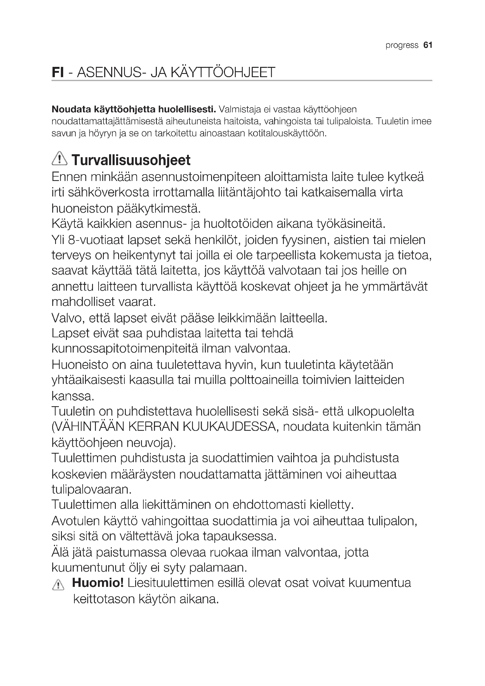 Noudata käyttöohjetta huolellisesti. Valmistaja ei vastaa käyttöohjeen noudattamattajättämisestä aiheutuneista haitoista, vahingoista tai tulipaloista. Tuuletin imee savun ja höyryn ja se on tarkoitettu ainoastaan kotitalouskäyttöön. Turvallisuusohjeet Ennen minkään asennustoimenpiteen aloittamista laite tulee kytkeä irti sähköverkosta irrottamalla liitäntäjohto tai katkaisemalla virta huoneiston pääkytkimestä. Käytä kaikkien asennus ja huoltotöiden aikana työkäsineitä. Yli 8vuotiaat lapset sekä henkilöt, joiden fyysinen, aistien tai mielen terveys on heikentynyt tai joilla ei ole tarpeellista kokemusta ja tietoa, saavat käyttää tätä laitetta, jos käyttöä valvotaan tai jos heille on annettu laitteen turvallista käyttöä koskevat ohjeet ja he ymmärtävät mahdolliset vaarat. Valvo, että lapset eivät pääse leikkimään laitteella. Lapset eivät saa puhdistaa laitetta tai tehdä kunnossapitotoimenpiteitä ilman valvontaa. Huoneisto on aina tuuletettava hyvin, kun tuuletinta käytetään yhtäaikaisesti kaasulla tai muilla polttoaineilla toimivien laitteiden kanssa. Tuuletin on puhdistettava huolellisesti sekä sisä että ulkopuolelta (VÄHINTÄÄN KERRAN KUUKAUDESSA, noudata kuitenkin tämän käyttöohjeen neuvoja). Tuulettimen puhdistusta ja suodattimien vaihtoa ja puhdistusta koskevien määräysten noudattamatta jättäminen voi aiheuttaa tulipalovaaran. Tuulettimen alla liekittäminen on ehdottomasti kielletty. Avotulen käyttö vahingoittaa suodattimia ja voi aiheuttaa tulipalon, siksi sitä on vältettävä joka tapauksessa. Älä jätä paistumassa olevaa ruokaa ilman valvontaa, jotta kuumentunut öljy ei syty palamaan. Huomio! Liesituulettimen esillä olevat osat voivat kuumentua keittotason käytön aikana.62 progress Turvaohjeet Käytä ainoastaan lamppujen huolto/vaihto ohjeessa ilmoitettuja vaihtolamppuja. Huomio! Älä yhdistä laitetta sähköverkkoon ennenkuin asennus on täysin valmis. Noudata huolellisesti paikallisten viranomaisten antamia savunpoiston teknisiä ja turvatoimenpiteitä koskevia määräyksiä. Poistoilmaa ei saa johtaa kaasulla tai muilla polttoaineilla toimivien laitteiden savunpoistohormiin. Älä käytä liesituuletinta, jos lamppu ei ole paikallaan tai jos lamppuja ei ole asennettu oikein, sillä seurauksena voi olla sähköisku. Älä koskaan käytä tuuletinta, jos sen verkkoa ei ole asennettu oikealla tavalla! Tuuletinta ei saa KOSKAAN käyttää tukipintana, jollei niin ole erikseen mainittu. Käytä vain laitteen mukana tulevia asennukseen tarkoitettuja kiinnitysruuveja, tai hanki oikeanlaisia ruuveja jos ne eivät kuulu varustukseen. Käytä Asennusohjeen mukaisia oikean pituisia ruuveja. Epäselvissä tapauksissa ota yhteys tekniseen tukeen tai vastaavaan asiantuntijaan. Huomio! Kiinnitysruuvien ja –laitteiden ohjeiden vastainen asennus voi vaikuttaa sähköturvallisuuteen. Ympäristönsuojelu Kierrätä materiaalit, jotka on merkitty merkillä . Kierrätä pakkaus laittamalla se asianmukaiseen kierrätysastiaan. Suojele ympäristöä ja ihmisten terveyttä kierrättämällä sähkö ja elektroniikkaromut. Älä hävitä merkillä merkittyjä kodinkoneita kotitalousjätteen mukana. Palauta tuote paikalliseen kierrätyskeskukseen tai ota yhteyttä paikalliseen viranomaiseen. Käyttö Tuuletin on tarkoitettu käytettäväksi joko imukupuversiona ulkoisella poistolla tai suodatinversiona sisäiseen kiertoon. Asennus Verkon jännitteen on oltava sama kuin tuulettimen sisäpuolella olevassa tyyppikilvessä ilmoitettu jännite. Jos laitteessa on pistoke, liitä tuuletin voimassaolevien normien mukaiseen pistorasiaan, joka sijaitsee sellaisessa paikassa, että siihen pääsee käsiksi myös asennuksen jälkeen. Jos laitteessa ei ole pistoketta (suora liitos verkkoon) tai pistoke ei ole sellaisessa paikassa että siihen pääsee käsiksi myös asennuksen jälkeen, käytä normien mukaista kaksinapaista katkaisijaa, jolla varmistetaan että laite saadaan kokonaan irti sähköverkosta, jos ylijännite kategoria on III, asennussääntöjen mukaisesti. Huomio! Tarkista aina, että verkkokaapeli on asennettu oikealla tavalla ennen kuin yhdistät tuulettimen sähköverkkoon ja tarkistat että se toimii oikein.progress 63 Tuulettimessa on erityinen sähköjohto; jos johto rikkoutuu, pyydä uusi johto tekniseltä tuelta. Lieden keittotason tukipinnan ja keit- tiötuulettimen alimman osan välinen minimietäisyys on oltava vähintään 50cm sähköliesien osalta ja 65cm kaasu ja seka- liesien osalta. Jos kaasulieden käyttöohjeissa vaadi- taan suurempi etäisyys, on se otettava huomioon. Toiminta Käytä maksiminopeutta jos keittiössä on erityisen paljon höyryä. On suositeltavaa käynnistää tuuletus 5 minuuttia ennen ruoanlaiton aloittamista ja antaa sen toimia noin 15 minuuttia ruoanlaiton lopettamis- esta.