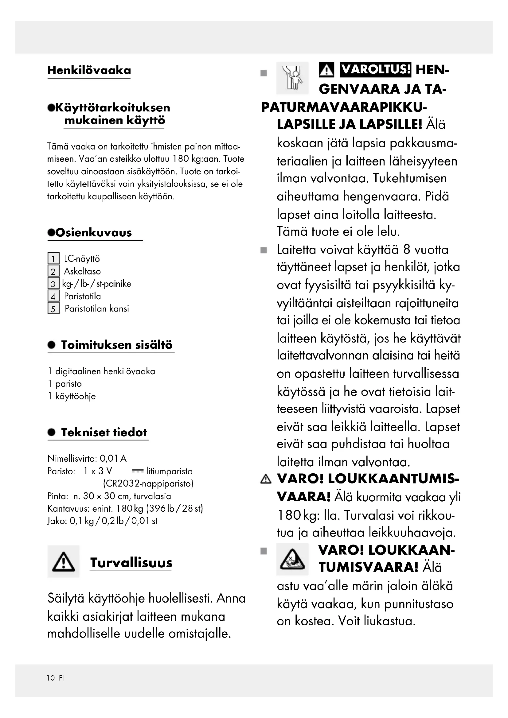 Paristotilan kansi Toimituksen sisältö 1 digitaalinen henkilövaaka 1 paristo 1 käyttöohje Tekniset tiedot Nimellisvirta: 0,01 A Paristo: 1 x 3 V litiumparisto (CR2032-nappiparisto) Pinta: n. 30 x 30 cm, turvalasia Kantavuus: enint. 180 kg (396 lb / 28 st) Jako: 0,1 kg / 0,2 lb / 0,01 st Turvallisuus Säilytä käyttöohje huolellisesti. Anna kaikki asiakirjat laitteen mukana mahdolliselle uudelle omistajalle.