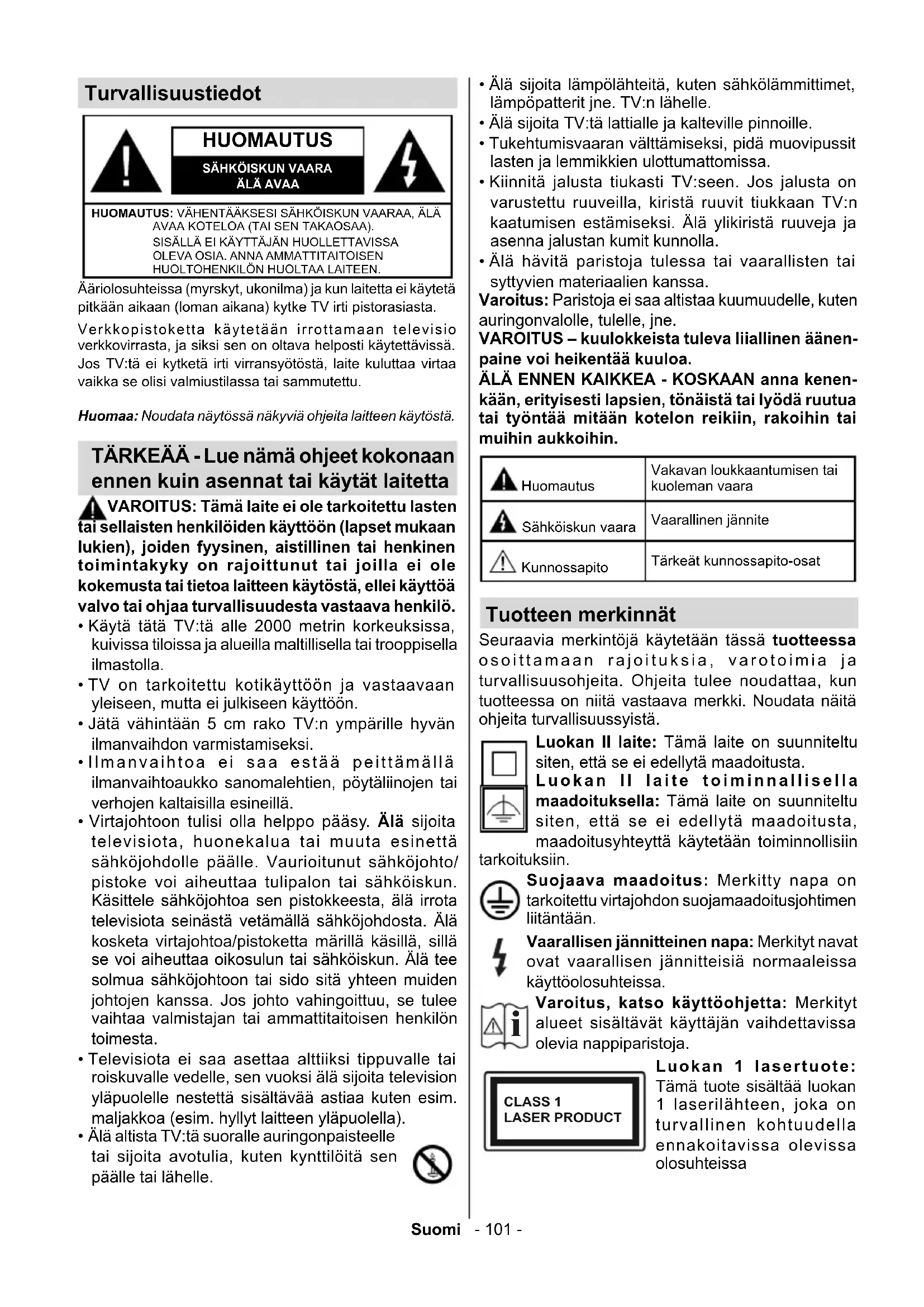 ......................................................................106Suomi - 101 - Turvallisuustiedot HUOMAUTUS SÄHKÖISKUN VAARAÄLÄ AVAAHUOMAUTUS: VÄHENTÄÄKSESI SÄHKÖISKUN VAARAA, ÄLÄ AVAA KOTELOA (TAI SEN TAKAOSAA). SISÄLLÄ EI KÄYTTÄJÄN HUOLLETTAVISSA OLEV A OSIA. ANNA AMMATTITAITOISEN HUOLTOHENKILÖN HUOLTAA LAITEEN. Huomaa: Noudata näytössä näkyviä ohjeita laitteen käytöstä. Ääriolosuhteissa (myrskyt, ukonilma) ja kun laitetta ei käytetä pitkään aikaan (loman aikana) kytke TV irti pistorasiasta. Verkkopistoketta käytetään irrottamaan televisio verkkovirrasta, ja siksi sen on oltava helposti käytettävissä. Jos TV:tä ei kytketä irti virransyötöstä, laite kuluttaa virtaa vaikka se olisi valmiustilassa tai sammutettu. TÄRKEÄÄ - Lue nämä ohjeet kokonaan ennen kuin asennat tai käytät laitetta VAROITUS: Tämä laite ei ole tarkoitettu lasten tai sellaisten henkilöiden käyttöön (lapset mukaan lukien), joiden fyysinen, aistillinen tai henkinen toimintakyky on rajoittunut tai joilla ei ole kokemusta tai tietoa laitteen käytöstä, ellei käyttöä valvo tai ohjaa turvallisuudesta vastaava henkilö.