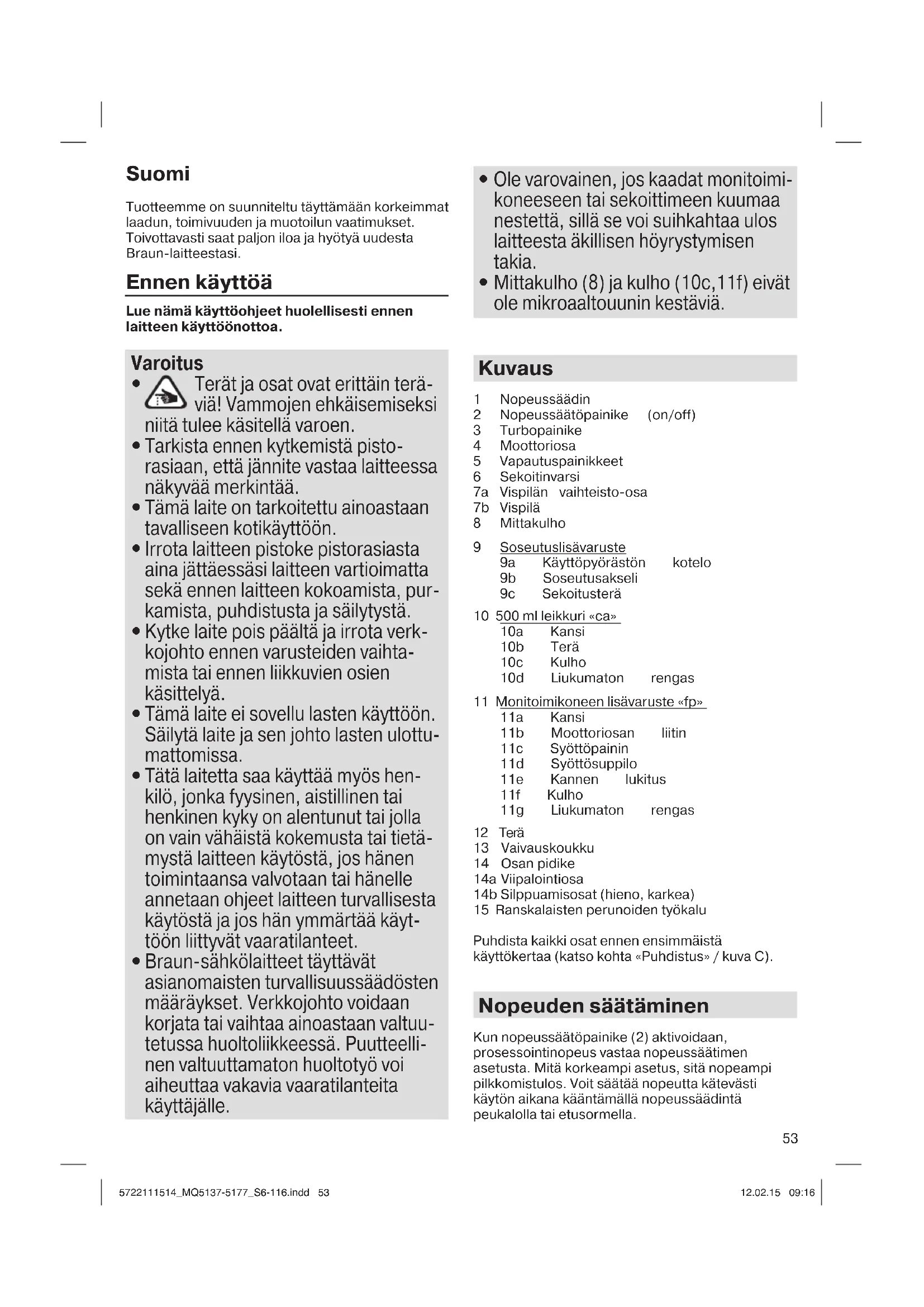 Mittakulho (8) ja kulho (10c,11f) eivät ole mikroaaltouunin kestäviä. Kuvaus 1 Nopeussäädin 2 Nopeussäätöpainike (on/off) 3 Turbopainike 4 Moottoriosa 5 Vapautuspainikkeet 6 Sekoitinvarsi 7a Vispilän vaihteisto-osa 7b Vispilä 8 Mittakulho 9 Soseutuslisävaruste 9a Käyttöpyörästön kotelo 9b Soseutusakseli 9c Sekoitusterä 10 500 ml leikkuri «ca» 10a Kansi 10b Terä 10c Kulho 10d Liukumaton rengas 11 Monitoimikoneen lisävaruste «fp» 11a Kansi 11b Moottoriosan liitin 11c Syöttöpainin 11d Syöttösuppilo 11e Kannen lukitus 11f Kulho 11g Liukumaton rengas 12 Terä 13 Vaivauskoukku 14 Osan pidike 14a Viipalointiosa 14b Silppuamisosat (hieno, karkea) 15 Ranskalaisten perunoiden työkalu Puhdista kaikki osat ennen ensimmäistä käyttökertaa (katso kohta «Puhdistus» / kuva C). Nopeuden säätäminen Kun nopeussäätöpainike (2) aktivoidaan, prosessointinopeus vastaa nopeussäätimen asetusta. Mitä korkeampi asetus, sitä nopeampi pilkkomistulos. Voit säätää nopeutta kätevästi käytön aikana kääntämällä nopeussäädintä peukalolla tai etusormella. 5722111514_MQ5137-5177_S6-116.indd 535722111514_MQ5137-5177_S6-116.indd 53 12.02.15 09:1612.02.15 09:1654 Maksiminopeus saavutetaan kuitenkin vain painamalla turbopainiketta (3). Turbopainiketta voidaan käyttää myös tehokkaisiin pikapulsseihin ilman että nopeussäätimeen tarvitsee koskea. Pikasekoitin (A) Pikasekoitin soveltuu erinomaisesti dippien, kastik- keiden, keittojen, majoneesin ja vauvanruokien val- mistukseen sekä juomien ja pirtelöiden sekoituk- seen. Saat parhaan sekoitustuloksen käyttämällä maksi- minopeutta.