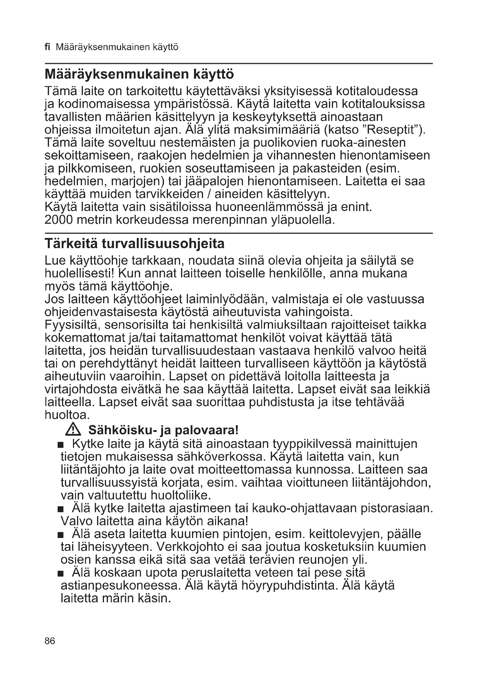 texten nns hos din handlare. Spar kvittot. Rätt till ändringar förbehålls.86 Määräyksenmukainen käyttö Määräyksenmukainen käyttö Tämä laite on tarkoitettu käytettäväksi yksityisessä kotitaloudessa ja kodinomaisessa ympäristössä. Käytä laitetta vain kotitalouksissa tavallisten määrien käsittelyyn ja keskeytyksettä ainoastaan ohjeissa ilmoitetun ajan. Älä ylitä maksimimääriä (katso ”Reseptit”). Tämä laite soveltuu nestemäisten ja puolikovien ruoka-ainesten sekoittamiseen, raakojen hedelmien ja vihannesten hienontamiseen ja pilkkomiseen, ruokien soseuttamiseen ja pakasteiden (esim. hedelmien, marjojen) tai jääpalojen hienontamiseen. Laitetta ei saa käyttää muiden tarvikkeiden / aineiden käsittelyyn. Käytä laitetta vain sisätiloissa huoneenlämmössä ja enint. 2000 metrin korkeudessa merenpinnan yläpuolella. Tärkeitä turvallisuusohjeita Lue käyttöohje tarkkaan, noudata siinä olevia ohjeita ja säilytä se huolellisesti! Kun annat laitteen toiselle henkilölle, anna mukana myös tämä käyttöohje. Jos laitteen käyttöohjeet laiminlyödään, valmistaja ei ole vastuussa ohjeidenvastaisesta käytöstä aiheutuvista vahingoista. Fyysisiltä, sensorisilta tai henkisiltä valmiuksiltaan rajoitteiset taikka kokemattomat ja/tai taitamattomat henkilöt voivat käyttää tätä laitetta, jos heidän turvallisuudestaan vastaava henkilö valvoo heitä tai on perehdyttänyt heidät laitteen turvalliseen käyttöön ja käytöstä aiheutuviin vaaroihin. Lapset on pidettävä loitolla laitteesta ja virtajohdosta eivätkä he saa käyttää laitetta. Lapset eivät saa leikkiä laitteella. Lapset eivät saa suorittaa puhdistusta ja itse tehtävää huoltoa. W Sähköisku- ja palovaara! ■ Kytke laite ja käytä sitä ainoastaan tyyppikilvessä mainittujen tietojen mukaisessa sähköverkossa. Käytä laitetta vain, kun liitäntäjohto ja laite ovat moitteettomassa kunnossa. Laitteen saa turvallisuussyistä korjata, esim. vaihtaa vioittuneen liitäntäjohdon, vain valtuutettu huoltoliike. ■ Älä kytke laitetta ajastimeen tai kauko-ohjattavaan pistorasiaan. Valvo laitetta aina käytön aikana! ■ Älä aseta laitetta kuumien pintojen, esim. keittolevyjen, päälle tai läheisyyteen. Verkkojohto ei saa joutua kosketuksiin kuumien osien kanssa eikä sitä saa vetää terävien reunojen yli. ■ Älä koskaan upota peruslaitetta veteen tai pese sitä astianpesukoneessa. Älä käytä höyrypuhdistinta. Älä käytä laitetta märin käsin.87
