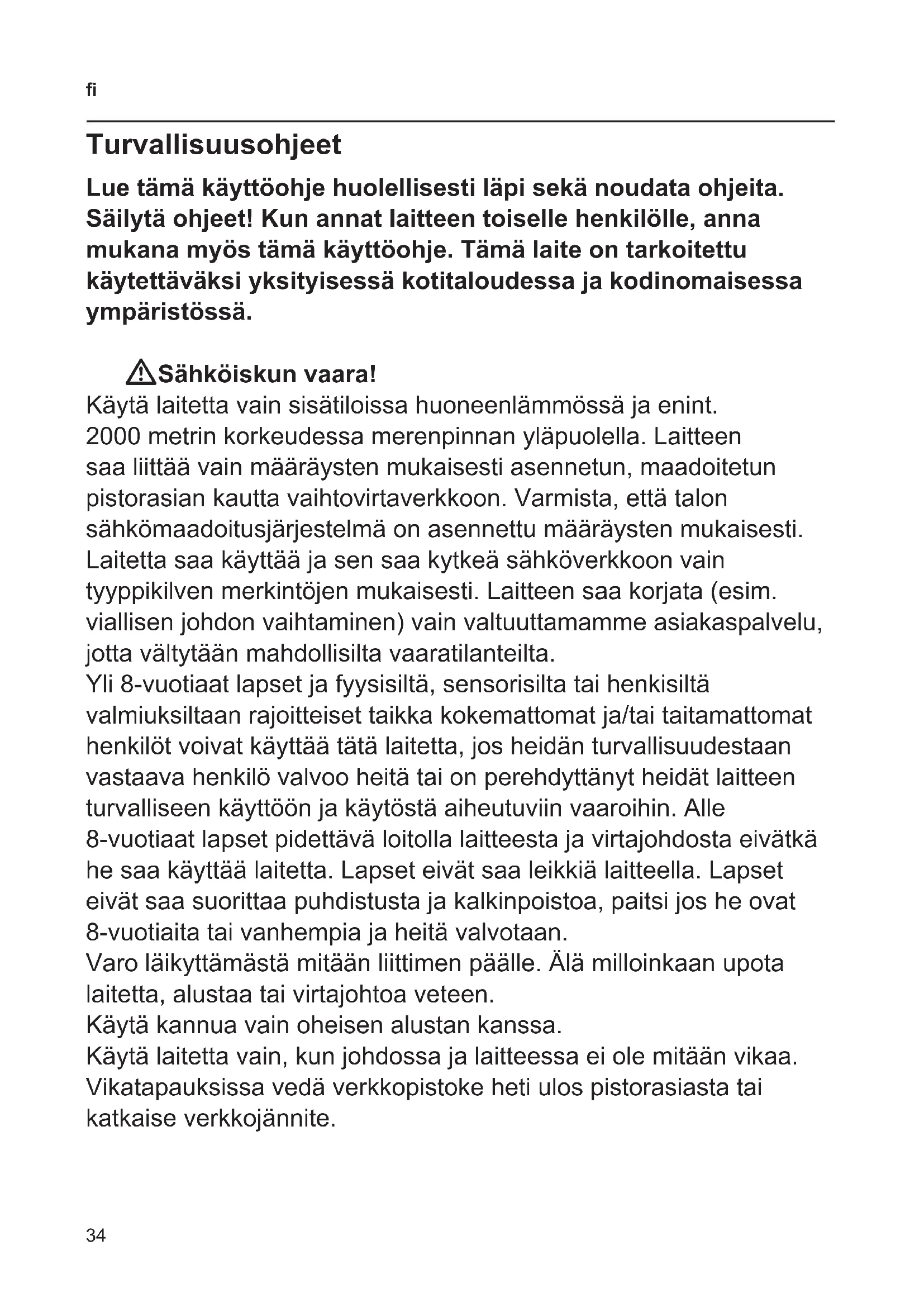 VAROITUS: Tätä laitetta ei saa käyttää kylpyammeiden, suihkujen, pesualtaiden tai muiden vettä sisältävien astioiden läheisyydessä. WTukehtumisvaara! Älä anna lasten leikkiä pakkausmateriaalilla. WLoukkaantumisvaara! Laitteen väärinkäyttö voi johtaa loukkaantumisiin. WHuomio! Elintarvikkeiden kanssa kosketuksissa olevien pintojen puhdistus! Käyttöoppaassa annettuja erityisiä puhdistusohjeita on noudatettava.36