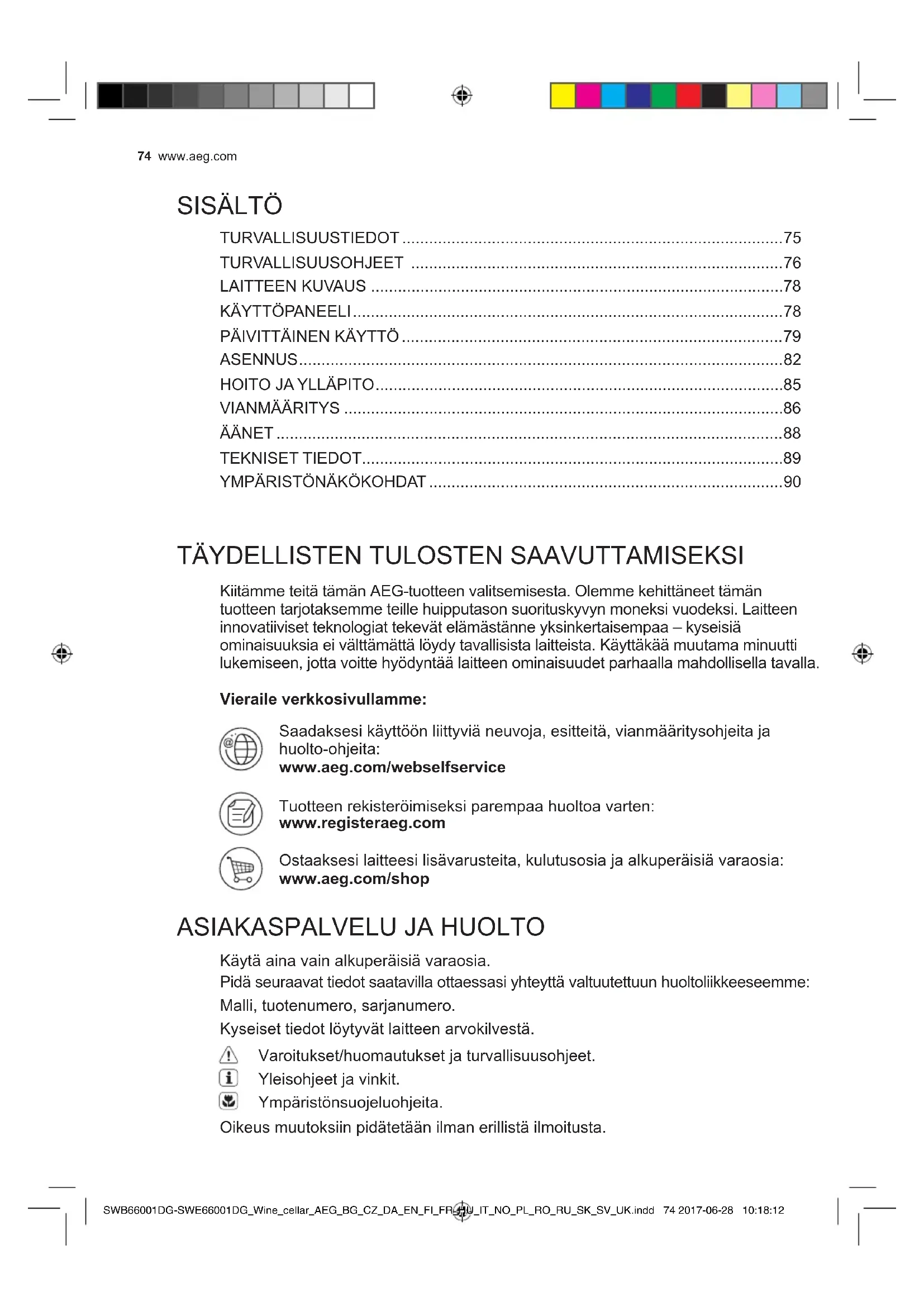 SISÄLTÖ KiitämmeteitätämänAEG-tuotteenvalitsemisesta.Olemmekehittäneettämän tuotteentarjotaksemmeteillehuipputasonsuorituskyvynmoneksivuodeksi.Laitteen innovatiivisetteknologiattekevätelämästänneyksinkertaisempaa–kyseisiä ominaisuuksiaeivälttämättälöydytavallisistalaitteista.Käyttäkäämuutamaminuutti lukemiseen,jottavoittehyödyntäälaitteenominaisuudetparhaallamahdollisellatavalla. Vieraile verkkosivullamme: Saadaksesikäyttöönliittyviäneuvoja,esitteitä,vianmääritysohjeitaja huolto-ohjeita: www.aeg.com/webselfservice Tuotteenrekisteröimiseksiparempaahuoltoavarten: www.registeraeg.com Ostaaksesilaitteesilisävarusteita,kulutusosiajaalkuperäisiävaraosia: www.aeg.com/shop TÄYDELLISTENTULOSTENSAAVUTTAMISEKSI ASIAKASPALVELUJAHUOLTO Käytäainavainalkuperäisiävaraosia. Pidäseuraavattiedotsaatavillaottaessasiyhteyttävaltuutettuunhuoltoliikkeeseemme: Malli,tuotenumero,sarjanumero. Kyseisettiedotlöytyvätlaitteenarvokilvestä. Varoitukset/huomautuksetjaturvallisuusohjeet. Yleisohjeetjavinkit. Ympäristönsuojeluohjeita. Oikeusmuutoksiinpidätetäänilmanerillistäilmoitusta. SWB66001DG-SWE66001DG_Wine_cellar_AEG_BG_CZ_DA_EN_FI_FR_HU_IT_NO_PL_RO_RU_SK_SV_UK.indd 74 2017-06-28 10:18:12SUOMI