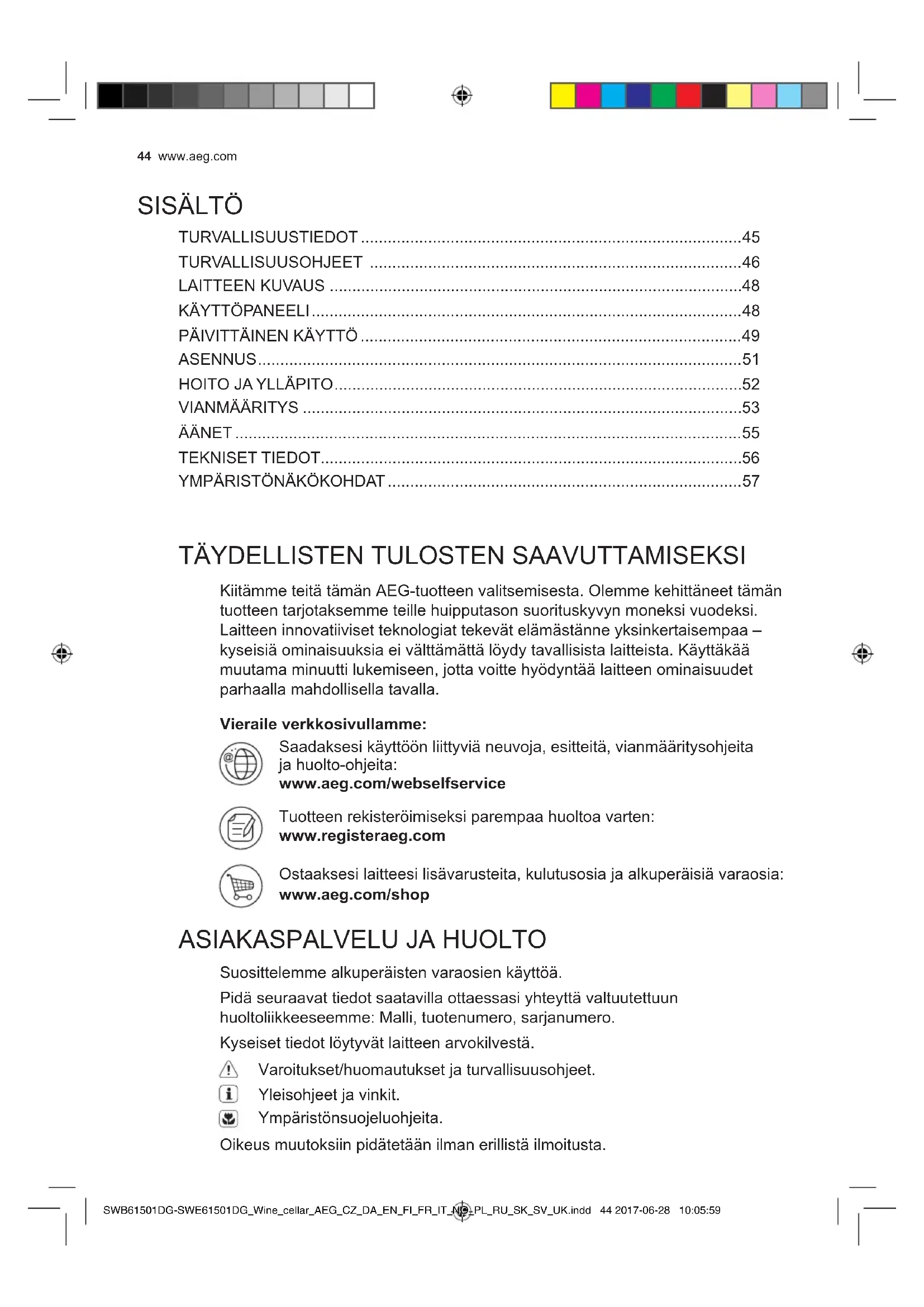 - Jos virtajohto vaurioituu, sen saa vaaratilanteiden välttämiseksi vaihtaa vain valmistaja, huoltoliike tai vastaava ammattitaitoinen henkilö. SWB61501DG-SWE61501DG_Wine_cellar_AEG_CZ_DA_EN_FI_FR_IT_NO_PL_RU_SK_SV_UK.indd 46 2017-06-28 10:06:0047 SUOMI