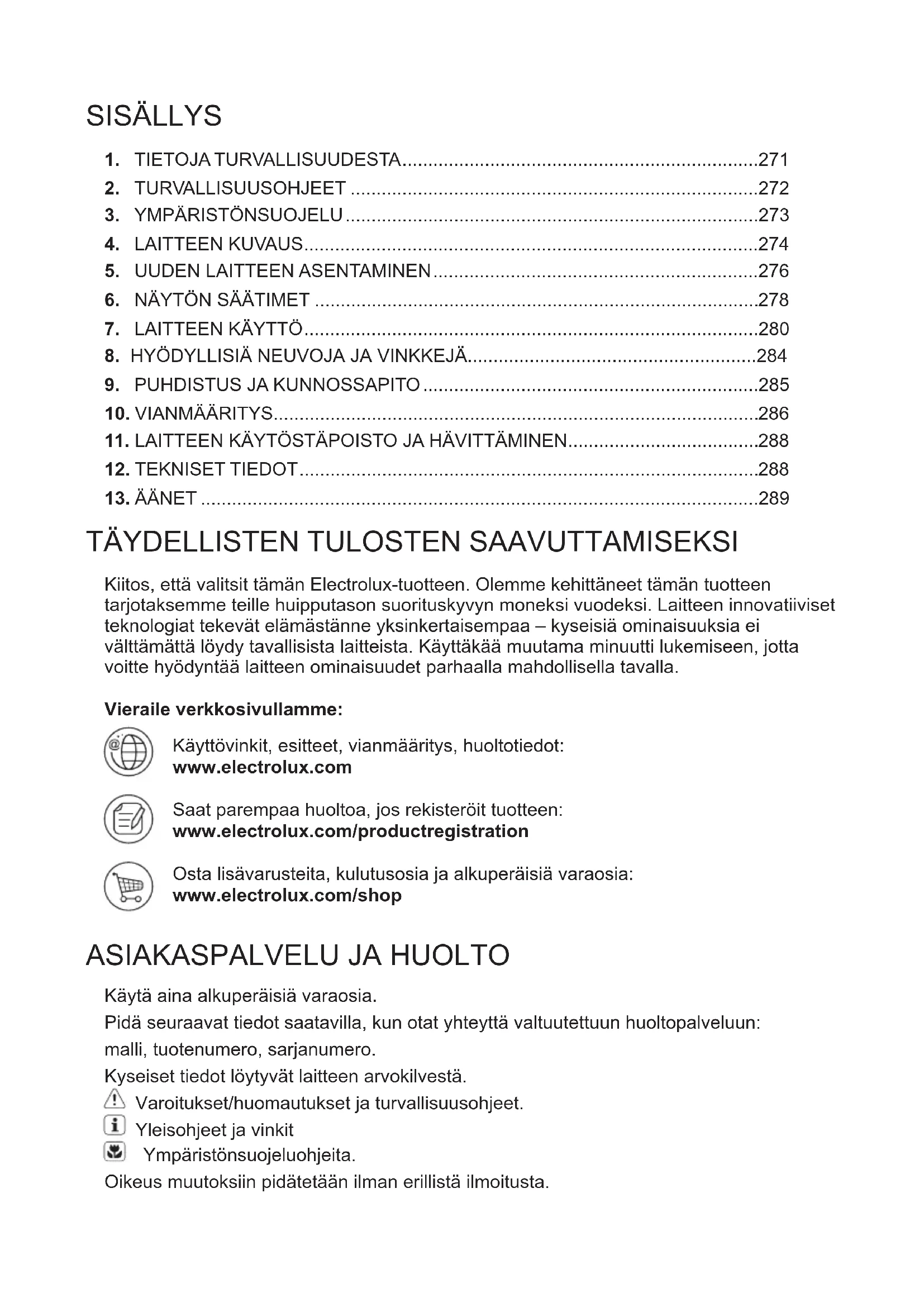 Der kommer lyde under normal drift (kompressor, kølekredsløb).268 www.electrolux.com269 DANSKTÄYDELLISTEN TULOSTEN SAAVUTTAMISEKSI Kiitos, että valitsit tämän Electrolux-tuotteen. Olemme kehittäneet tämän tuotteen tarjotaksemme teille huipputason suorituskyvyn moneksi vuodeksi. Laitteen innovatiiviset teknologiat tekevät elämästänne yksinkertaisempaa – kyseisiä ominaisuuksia ei välttämättä löydy tavallisista laitteista. Käyttäkää muutama minuutti lukemiseen, jotta voitte hyödyntää laitteen ominaisuudet parhaalla mahdollisella tavalla. Vieraile verkkosivullamme: Käyttövinkit, esitteet, vianmääritys, huoltotiedot: www.electrolux.com Saat parempaa huoltoa, jos rekisteröit tuotteen: www.electrolux.com/productregistration Osta lisävarusteita, kulutusosia ja alkuperäisiä varaosia: www.electrolux.com/shop
