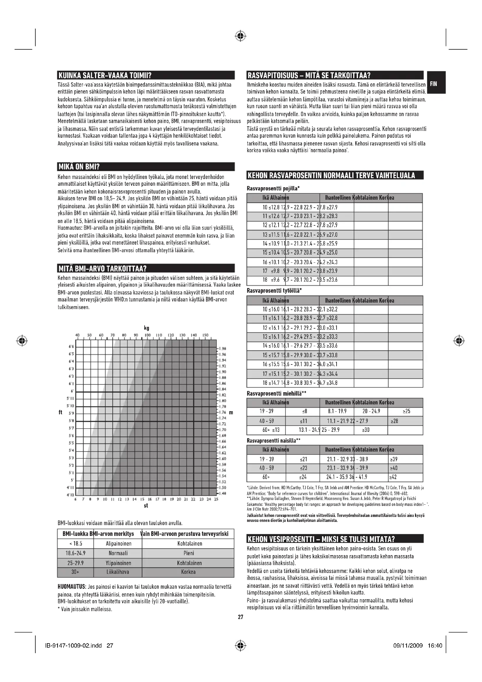 d = 0,1 % spiermassa IB-9147-1009-02.indd 26 09/11/2009 16:4027 FIN KUINKA SALTER-VAAKA TOIMII? Tässä Salter-vaa’assa käytetään bioimpedanssimittaustekniikkaa (BIA), mikä johtaa erittäin pienen sähköimpulssin kehon läpi määrittääkseen rasvan rasvattomasta kudoksesta. Sähköimpulssia ei tunne, ja menetelmä on täysin vaaraton. Kosketus kehoon tapahtuu vaa’an alustalla olevien ruostumattomasta teräksestä valmistettujen laattojen (tai lasipinnalla olevan lähes näkymättömän ITO-pinnoituksen kautta*). Menetelmällä lasketaan samanaikaisesti kehon paino, BMI, rasvaprosentti, vesipitoisuus ja lihasmassa. Näin saat entistä tarkemman kuvan yleisestä terveydentilastasi ja kunnostasi. Vaakaan voidaan tallentaa jopa 4 käyttäjän henkilökohtaiset tiedot. Analyysivaa’an lisäksi tätä vaakaa voidaan käyttää myös tavallisena vaakana. RASVAPITOISUUS – MITÄ SE TARKOITTAA? Ihmiskeho koostuu muiden aineiden lisäksi rasvasta. Tämä on elintärkeää terveellisen ja toimivan kehon kannalta. Se toimii pehmusteena nivelille ja suojaa elintärkeitä elimiä, auttaa säätelemään kehon lämpötilaa, varastoi vitamiineja ja auttaa kehoa toimimaan, kun ruoan saanti on vähäistä. Mutta liian suuri tai liian pieni määrä rasvaa voi olla vahingollista terveydelle. On vaikea arvioida, kuinka paljon kehossamme on rasvaa pelkästään katsomalla peiliin. Tästä syystä on tärkeää mitata ja seurata kehon rasvaprosenttia. Kehon rasvaprosentti antaa paremman kuvan kunnosta kuin pelkkä painolukema. Painon pudotus voi tarkoittaa, että lihasmassa pienenee rasvan sijasta. Kehosi rasvaprosentti voi silti olla korkea vaikka vaaka näyttäisi ’normaalia painoa’. KEHON VESIPROSENTTI – MIKSI SE TULISI MITATA? Kehon vesipitoisuus on tärkein yksittäinen kehon paino-osista. Sen osuus on yli puolet koko painostasi ja lähes kaksikolmasosaa rasvattomasta kehon massasta (pääasiassa lihaksista). Vedellä on useita tärkeitä tehtäviä kehossamme: Kaikki kehon solut, olivatpa ne ihossa, rauhasissa, lihaksissa, aivoissa tai missä tahansa muualla, pystyvät toimimaan ainoastaan, jos ne saavat riittävästi vettä. Vedellä on myös tärkeä tehtävä kehon lämpötasapainon sääntelyssä, erityisesti hikoilun kautta. Paino- ja rasvalukemasi yhdistelmä saattaa vaikuttaa normaalilta, mutta kehosi vesipitoisuus voi olla riittämätön terveellisen hyvinvoinnin kannalta.