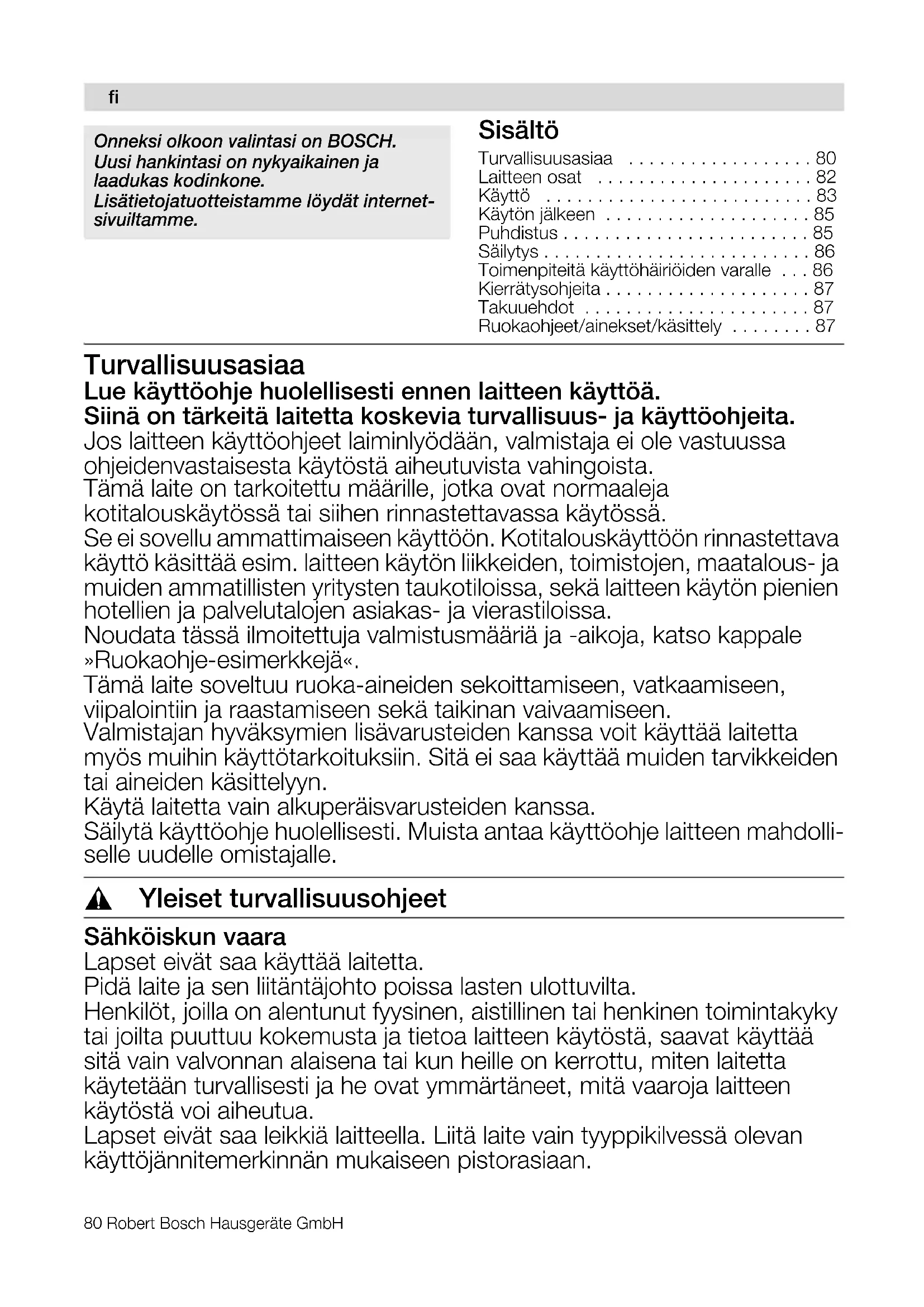 - Ruokaohjeet/ainekset/käsittely Turvallisuusasiaa Lue käyttöohje huolellisesti ennen laitteen käyttöä. Siinä on tärkeitä laitetta koskevia turvallisuus- ja käyttöohjeita. Jos laitteen käyttöohjeet laiminlyödään, valmistaja ei ole vastuussa ohjeidenvastaisesta käytöstä aiheutuvista vahingoista. Tämä laite on tarkoitettu määrille, jotka ovat normaaleja kotitalouskäytössä tai siihen rinnastettavassa käytössä. Se ei sovellu ammattimaiseen käyttöön. Kotitalouskäyttöön rinnastettava käyttö käsittää esim. laitteen käytön liikkeiden, toimistojen, maatalous- ja muiden ammatillisten yritysten taukotiloissa, sekä laitteen käytön pienien hotellien ja palvelutalojen asiakas- ja vierastiloissa. Noudata tässä ilmoitettuja valmistusmääriä ja -aikoja, katso kappale »Ruokaohje-esimerkkejä«. Tämä laite soveltuu ruoka-aineiden sekoittamiseen, vatkaamiseen, viipalointiin ja raastamiseen sekä taikinan vaivaamiseen. Valmistajan hyväksymien lisävarusteiden kanssa voit käyttää laitetta myös muihin käyttötarkoituksiin. Sitä ei saa käyttää muiden tarvikkeiden tai aineiden käsittelyyn. Käytä laitetta vain alkuperäisvarusteiden kanssa. Säilytä käyttöohje huolellisesti. Muista antaa käyttöohje laitteen mahdolli- selle uudelle omistajalle. , Yleiset turvallisuusohjeet Sähköiskun vaara Lapset eivät saa käyttää laitetta. Pidä laite ja sen liitäntäjohto poissa lasten ulottuvilta. Henkilöt, joilla on alentunut fyysinen, aistillinen tai henkinen toimintakyky tai joilta puuttuu kokemusta ja tietoa laitteen käytöstä, saavat käyttää sitä vain valvonnan alaisena tai kun heille on kerrottu, miten laitetta käytetään turvallisesti ja he ovat ymmärtäneet, mitä vaaroja laitteen käytöstä voi aiheutua. Lapset eivät saa leikkiä laitteella. Liitä laite vain tyyppikilvessä olevan käyttöjännitemerkinnän mukaiseen pistorasiaan. p. 87