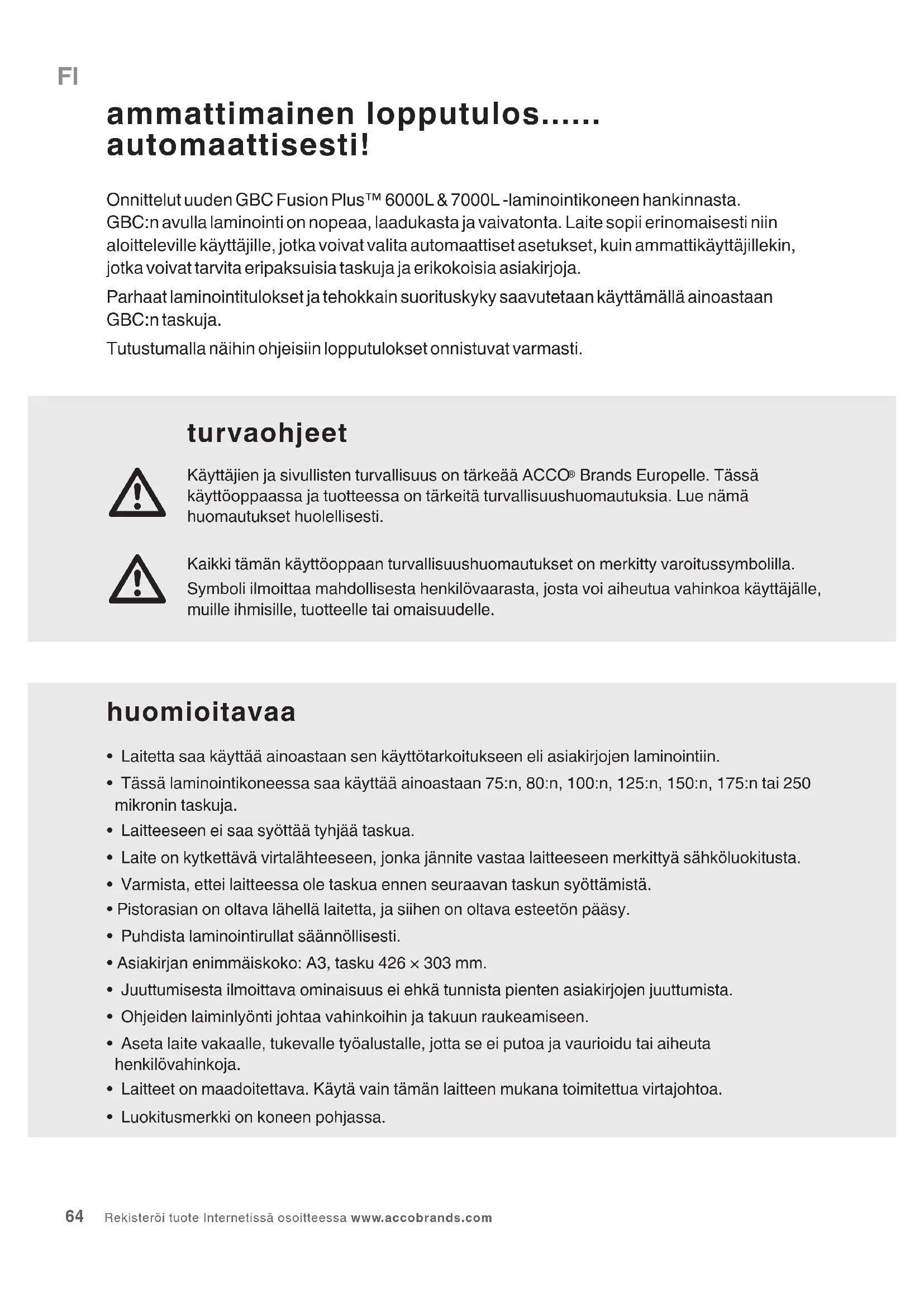 - Laitetta saa käyttää ainoastaan sen käyttötarkoitukseen eli asiakirjojen laminointiin.• Tässä laminointikoneessa saa käyttää ainoastaan 75:n, 80:n, 100:n, 125:n, 150:n, 175:n tai 250 mikronin taskuja.• Laitteeseen ei saa syöttää tyhjää taskua.• Laite on kytkettävä virtalähteeseen, jonka jännite vastaa laitteeseen merkittyä sähköluokitusta.• Varmista, ettei laitteessa ole taskua ennen seuraavan taskun syöttämistä.• Pistorasian on oltava lähellä laitetta, ja siihen on oltava esteetön pääsy.• Puhdista laminointirullat säännöllisesti.• Asiakirjan enimmäiskoko: A3, tasku 426 × 303 mm.• Juuttumisesta ilmoittava ominaisuus ei ehkä tunnista pienten asiakirjojen juuttumista.• Ohjeiden laiminlyönti johtaa vahinkoihin ja takuun raukeamiseen.• Aseta laite vakaalle, tukevalle työalustalle, jotta se ei putoa ja vaurioidu tai aiheuta henkilövahinkoja.• Laitteet on maadoitettava. Käytä vain tämän laitteen mukana toimitettua virtajohtoa.• Luokitusmerkki on koneen pohjassa. ammattimainen lopputulos...... automaattisesti! Onnittelut uuden GBC Fusion Plus™ 6000L & 7000L -laminointikoneen hankinnasta. GBC:n avulla laminointi on nopeaa, laadukasta ja vaivatonta. Laite sopii erinomaisesti niin aloitteleville käyttäjille, jotka voivat valita automaattiset asetukset, kuin ammattikäyttäjillekin, jotka voivat tarvita eripaksuisia taskuja ja erikokoisia asiakirjoja. Parhaat laminointitulokset ja tehokkain suorituskyky saavutetaan käyttämällä ainoastaan GBC:n taskuja. Tutustumalla näihin ohjeisiin lopputulokset onnistuvat varmasti.FI huolto Taskulaminointikonetta ei saa yrittää huoltaa tai korjata itse. Jos laite vaatii korjausta, irrota laite virtalähteestä ja ota yhteys valtuutettuun GBC-huoltoedustajaan. FUSION PLUS