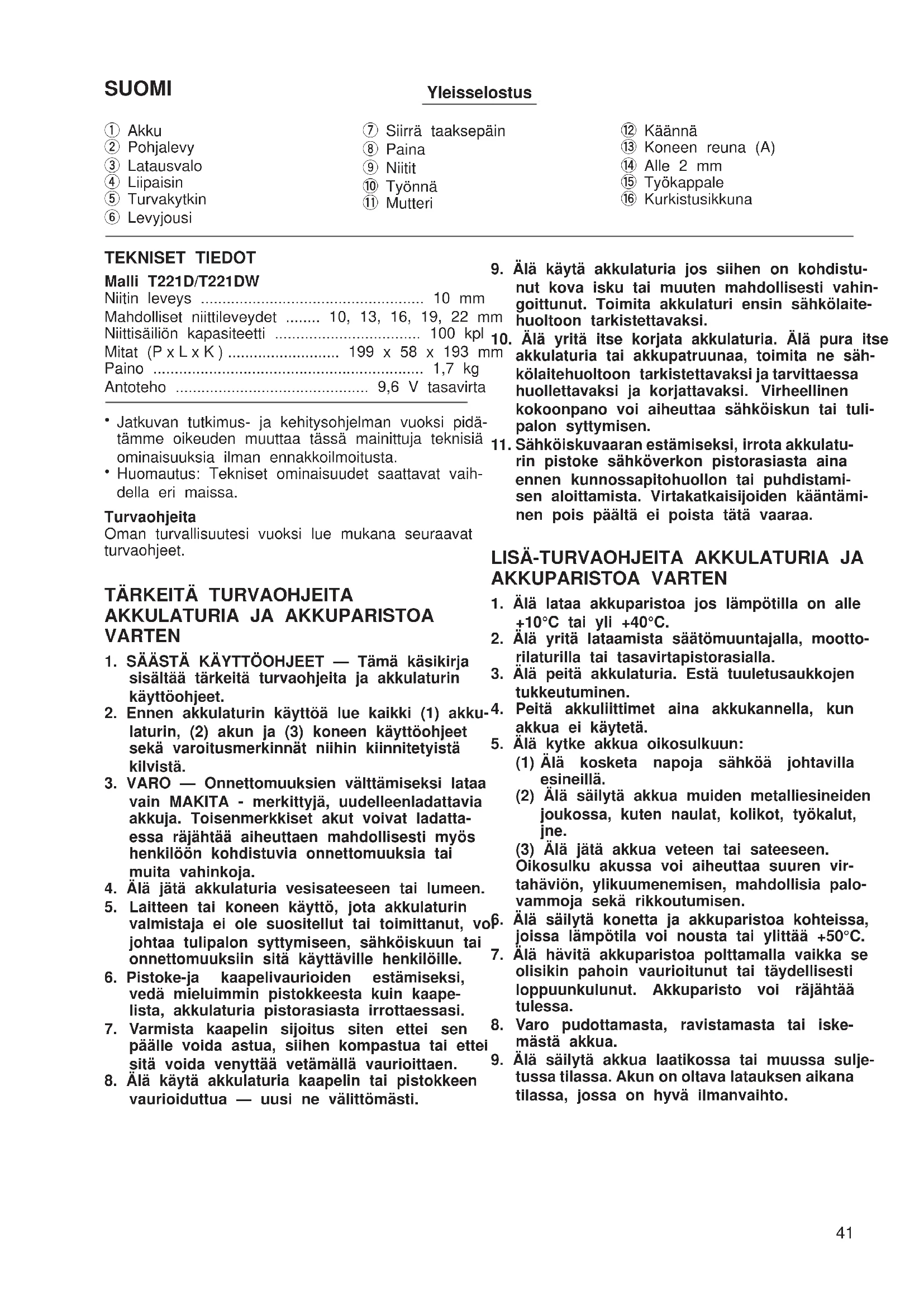 Älä käytä niittejä, jotka vaikuttavat vahingoittuneilta, vääntyneiltä, ruosteisilta tai syöpyneiltä. HUOLTO VARO: Varmistaudu aina ennen kaikkia koneelle suoritettavia töitä, että kone on pysäytetty ja akku irrotettu. Laitteen käyttövarmuuden ja turvallisuuden vuoksi korjaukset ja muut huolto- ja säätötyöt saa suorittaa ainoastaan Makitan hyväksymä huoltopiste. TAKUU Takaamme Makita-laitteet kunkin maan lakisääteisten määräysten mukaisesti. Takuu ei kata normaalista kulumisesta, ylikuormituksesta tai virheellisestä käsit- telystä johtuvia vaurioita. Jos valittamisen aihetta ilmenee, pyydämme lähettämään purkamattoman laitteen yhdessä oheisen TAKUUTODISTUKSEN kanssa kauppiaallesi tai Makitan huoltokeskukseen. T221D (Fin) (’100. 3. 17) 43∂§§∏¡π∫∞ ¶ÂÚÈÁÚ·ˇ‹ ÁÂÓÈ΋˜ ¿Ô„˘ 1 ∫·Û¤Ù· Ì·Ù·Ú›·˜ 2 ¶Ï¿Î· Ú‡ıÌÈÛ˘ 3 ºˆÙ¿ÎÈ ˇfiÚÙÈÛ˘ 4 ™Î·Ó‰¿ÏË 5 ªÔ¯Ïfi˜ ·Ûˇ·Ï›·˜ 6 ¶Ï¿Î· ÂÏ·ÙËÚ›Ô˘ 7 ∆Ú·‚‹ÍÂÙ ÚÔ˜ Ù· ›Ûˆ 8 ¶·Ù‹ÛÙ 9 ™˘Ó‰ÂÙ‹Ú˜ 0 ™ÚÒÍÂÙ q ¶·ÍÈÌ¿‰È w ™ÙÚÔˇ‹ e ∞ÎÚË Ì˯·Ó‹Ì·ÙÔ˜ (A) r §ÈÁfiÙÂÚÔ ·fi 2 ¯ÈÏ. t ÀÏÈÎfi y ¶·Ú¿ı˘ÚÔ ·Ú·Ù‹ÚËÛ˘ ∆∂áπ∫∞ Ã∞ƒ∞∫∆∏ƒπ™∆π∫∞