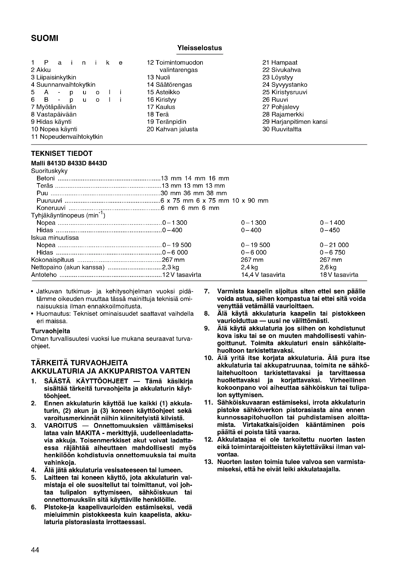 - Jos konetta käytetään jatkuvasti, kunnes akku on tyh- jentynyt, anna koneen levätä 15 minuutin ajan, ennen kuin jatkat työskentelyä uudella akulla. Vasaraporaaminen Käännä ensin toimintomuodon valintarengasta siten, että koneen rungossa oleva nuoli osoittaa X-merkkiä. Sää- törengas voidaan kohdistaa mihin tahansa kiinnitysmo- menttiin tämän toiminnon ajaksi. Aseta terä haluamaasi porauskohtaan ja paina sitten lii- paisinta. Älä pakota konetta. Parhaaseen tulokseen päästään kevyellä painamisella. Pidä kone paikallaan ja estä sitä luiskahtamasta reiästä. Älä paina voimakkaam- min, jos reikä tukkeutuu lastuista tai roskista. Anna koneen sen sijaan käydä tyhjäkäynnillä ja vedä terä osit- tain ulos reiästä. Kun toistat tämän muutamia kertoja, reikä puhdistuu ja voit jatkaa poraamista normaaliin tapaan. VARO: Läpiporautumisen hetkellä, reiän tukkeutuessa lastuista tai roskista tai osuttaessa betonin sisällä oleviin tukirau- toihin koneeseen/terään kohdistuu suuri vääntövoima. Käytä aina sivukahvaa (lisäkädensijaa) ja pitele konetta käytön aikana tiukasti sekä sivukahvasta että kytkimen kädensijasta. Jos et toimi näin, saatat menettää koneen hallinnan, mikä voi johtaa vakavaan loukkaantumiseen. Puhallin (Kuva 12) Käytä puhallinta reiän puhdistamiseen. Puuruuvin nimellishal- kaisija (mm) Koereiän suositeltava koko (mm) 3,1 2,0–2,2 3,5 2,2–2,5 3,8 2,5–2,8 4,5 2,9–3,2 4,8 3,1–3,4 5,1 3,3–3,6 5,5 3,6–3,9 5,8 4,0–4,2 6,1 4,2–4,447 Pohjalevyn kiinnittäminen (Kuva13) Malli 8413D Kiinnitä aina pohjalevy käyttäessäsi akkua 1200, 1202 tai 1202A. Kiinnitä pohjalevy koneeseen varusteisiin kuulu- valla ruuvilla. HUOLTO VARO: Varmistaudu aina ennen kaikkia koneelle suoritettavia töitä, että kone on pysäytetty ja akku irrotettu. Hiilien vaihto (Kuva14 ja 15) Hiilet on vaihdettava kun ne ovat kuluneet kulumisrajaan. Hiilet on vaihdettava aina parittain. Laitteen käyttövarmuuden ja turvallisuuden vuoksi korja- ukset ja muut huolto- ja säätötyöt saa suorittaa ainoas- taan Makitan hyväksymä huoltopiste.48