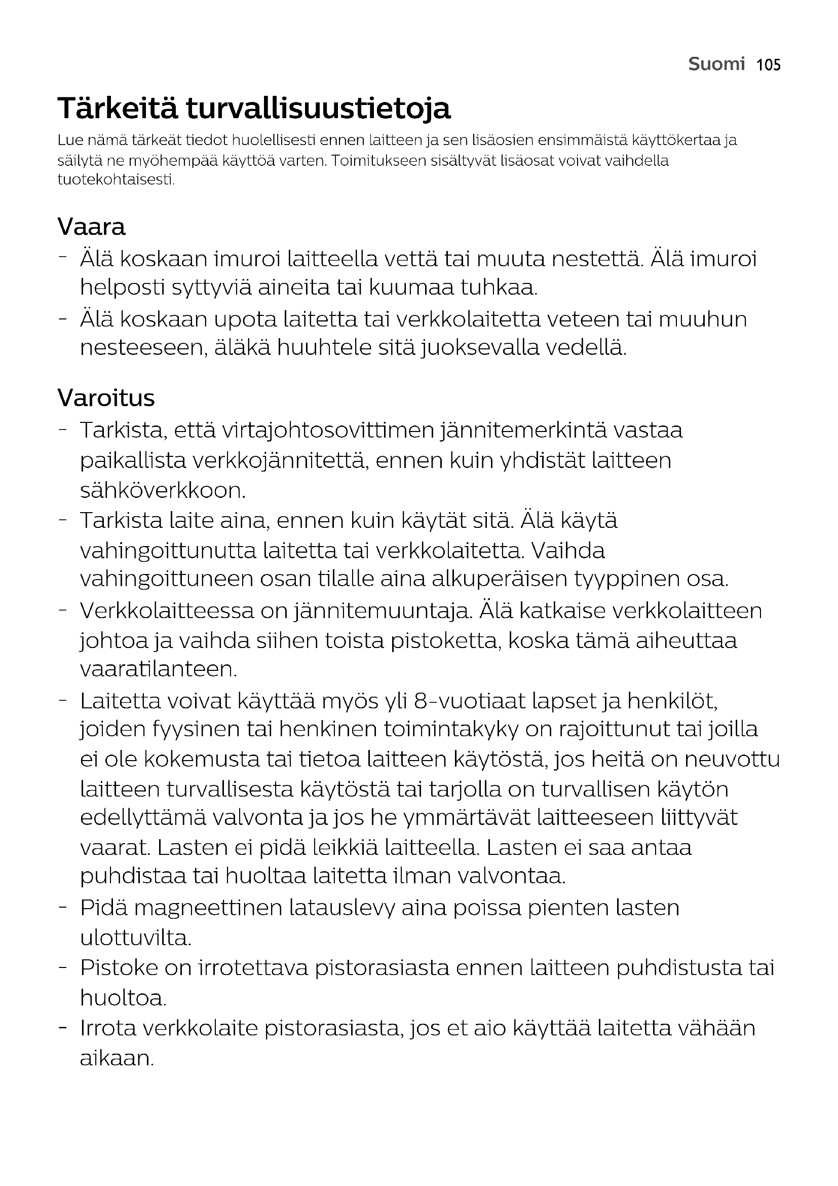 Suomi Tärkeitä turvallisuustietoja Lue nämä tärkeät tiedot huolellisesti ennen laitteen ja sen lisäosien ensimmäistä käyttökertaa jasäilytä ne myöhempää käyttöä varten. Toimitukseen sisältyvät lisäosat voivat vaihdellatuotekohtaisesti. Vaara
