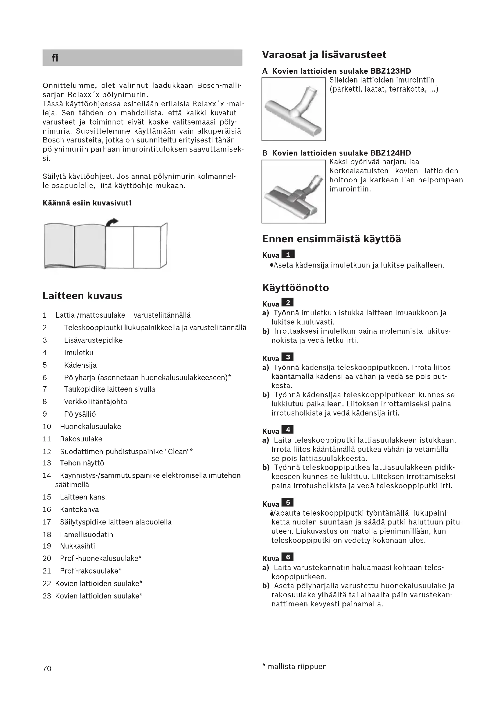Obs! Använd inte skurmedel, fönsterputs eller all- rent. Sänk aldrig ner dammsugaren i vatten. Med förbehåll för tekniska ändringar.70 Onnittelumme, olet valinnut laadukkaan Bosch-malli- sarjan Relaxx´x pölynimurin. Tässä käyttöohjeessa esitellään erilaisia Relaxx´x -mal- leja. Sen tähden on mahdollista, että kaikki kuvatut varusteet ja toiminnot eivät koske valitsemaasi pöly- nimuria. Suosittelemme käyttämään vain alkuperäisiä Bosch-varusteita, jotka on suunniteltu erityisesti tähän pölynimuriin parhaan imurointituloksen saavuttamisek- si. Säilytä käyttöohjeet. Jos annat pölynimurin kolmannel- le osapuolelle, liitä käyttöohje mukaan. Käännä esiin kuvasivut! Laitteen kuvaus 1 Lattia-/mattosuulake varusteliitännällä 2 Teleskooppiputki liukupainikkeella ja varusteliitännällä 3 Lisävarustepidike 4 Imuletku 5 Kädensija 6 Pölyharja (asennetaan huonekalusuulakkeeseen)* 7 Taukopidike laitteen sivulla 8 Verkkoliitäntäjohto 9 Pölysäiliö 10 Huonekalusuulake 11 Rakosuulake 12 Suodattimen puhdistuspainike "Clean"* 13 Tehon näyttö 14 Käynnistys-/sammutuspainike elektronisella imutehon säätimellä 15 Laitteen kansi 16 Kantokahva 17 Säilytyspidike laitteen alapuolella 18 Lamellisuodatin 19 Nukkasihti 20 Profi-huonekalusuulake* 21 Profi-rakosuulake* 22 Kovien lattioiden suulake* 23 Kovien lattioiden suulake* Varaosat ja lisävarusteet A Kovien lattioiden suulake BBZ123HD Sileiden lattioiden imurointiin (parketti, laatat, terrakotta, ...) B Kovien lattioiden suulake BBZ124HD Kaksi pyörivää harjarullaa Korkealaatuisten kovien lattioiden hoitoon ja karkean lian helpompaan imurointiin. Ennen ensimmäistä käyttöä Kuva