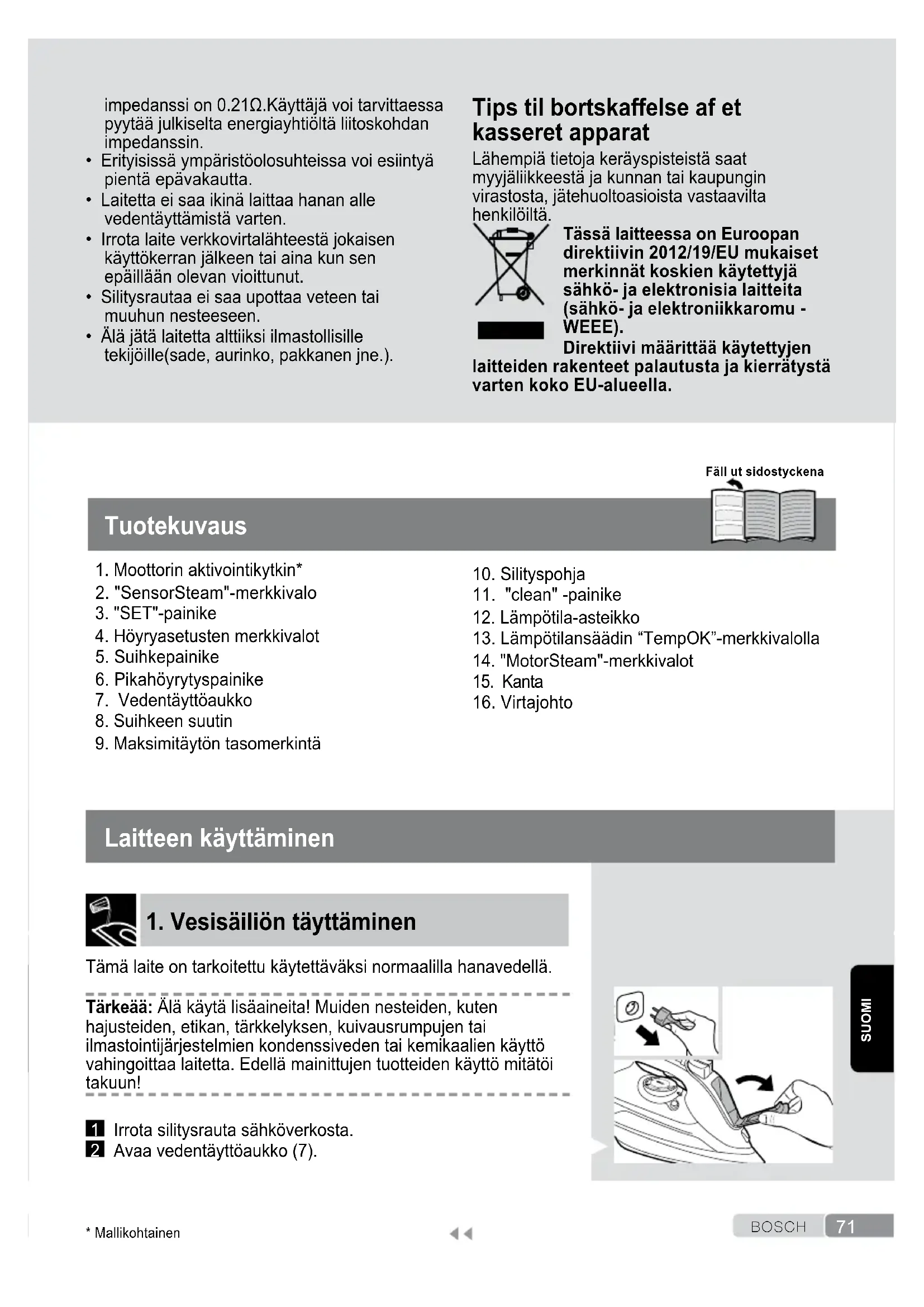 - Mallikohtainen Fäll ut sidostyckena72 BOSCH SUOMI 3 Täytä vesisäiliö. Älä milloinkaan täytä säiliötä maksimitason yli (9)! 4 Sulje vedentäyttöaukon kansi. Vinkki: Sekoita hanavettä tislattuun tai demineralisoituun veteen suhteessa 1:1 höyrytystoiminnon tehon optimoimiseksi. Jos alueesi hanavesi on erittäin kovaa, sekoita hanavettä tislattuun tai demineralisoituun veteen suhteessa 1:2.