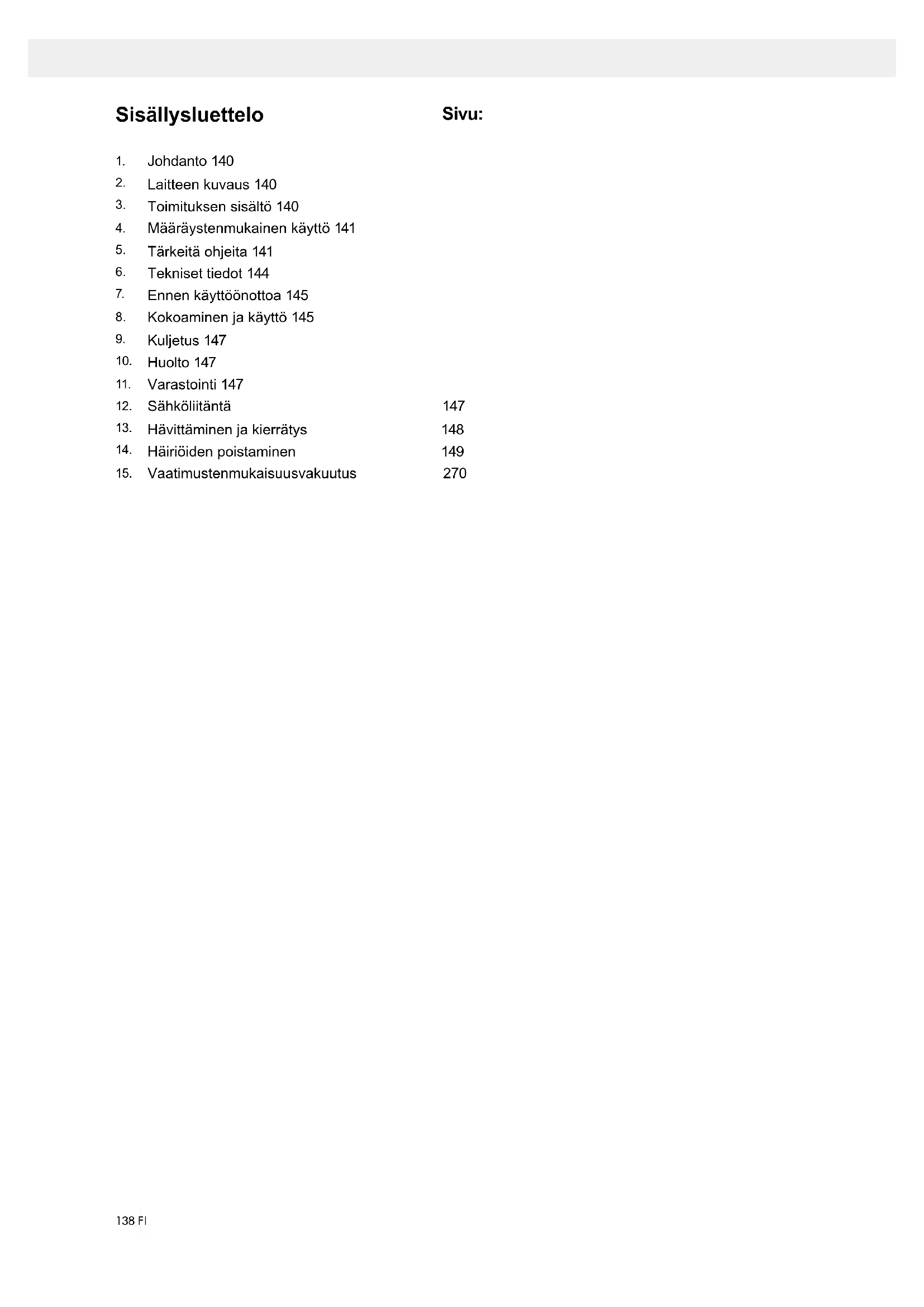 - Säilytä pakkaus jos mahdollista takuuajan päättymiseen asti.141FI HUOMIO Laite ja pakkausmateriaalit eivät ole lasten leikkikaluja! Lapset eivät saa leikkiä muovipussien, kalvojen tai pienosien kanssa! Vaarana osien joutuminen nieluun sekä tukehtumisen vaara!