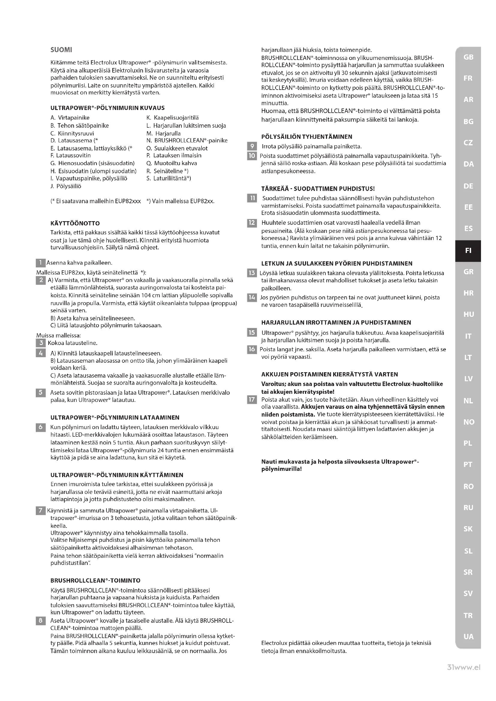 Electrolux pidättää oikeuden muuttaa tuotteita, tietoja ja teknisiä tietoja ilman ennakkoilmoitusta. SUOMI Kiitämme teitä Electrolux Ultrapower® -pölynimurin valitsemisesta. Käytä aina alkuperäisiä Elektroluxin lisävarusteita ja varaosia parhaiden tuloksien saavuttamiseksi. Ne on suunniteltu erityisesti pölynimuriisi. Laite on suunniteltu ympäristöä ajatellen. Kaikki muoviosat on merkitty kierrätystä varten.