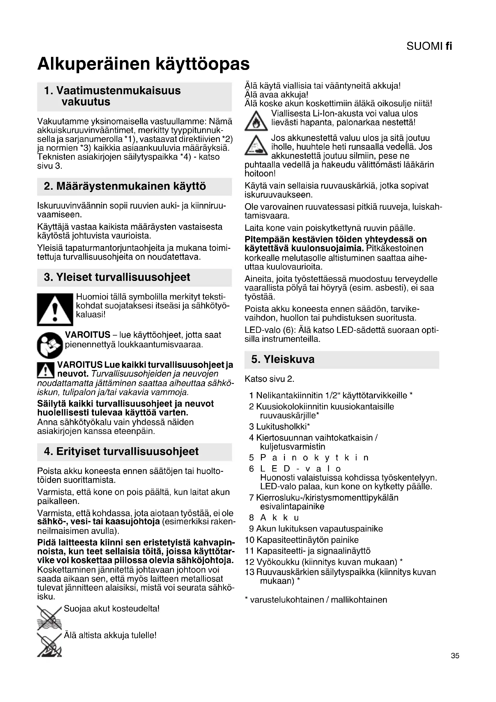 Alkuperäinen käyttöopas Vakuutamme yksinomaisella vastuullamme: Nämä akkuiskuruuvinvääntimet, merkitty tyyppitunnuk- sella ja sarjanumerolla *1), vastaavat direktiivien *2) ja normien *3) kaikkia asiaankuuluvia määräyksiä. Teknisten asiakirjojen säilytyspaikka *4) - katso sivu 3. Iskuruuvinväännin sopii ruuvien auki- ja kiinniruu- vaamiseen. Käyttäjä vastaa kaikista määräysten vastaisesta käytöstä johtuvista vaurioista. Yleisiä tapaturmantorjuntaohjeita ja mukana toimi- tettuja turvallisuusohjeita on noudatettava. Huomioi tällä symbolilla merkityt teksti- kohdat suojataksesi itseäsi ja sähkötyö- kaluasi! VAROITUS – lue käyttöohjeet, jotta saat pienennettyä loukkaantumisvaaraa. VAROITUS Lue kaikki turvallisuusohjeet ja neuvot. Turvallisuusohjeiden ja neuvojen noudattamatta jättäminen saattaa aiheuttaa sähkö- iskun, tulipalon ja/tai vakavia vammoja. Säilytä kaikki turvallisuusohjeet ja neuvot huolellisesti tulevaa käyttöä varten. Anna sähkötyökalu vain yhdessä näiden asiakirjojen kanssa eteenpäin. Poista akku koneesta ennen säätöjen tai huolto- töiden suorittamista. Varmista, että kone on pois päältä, kun laitat akun paikalleen. Varmista, että kohdassa, jota aiotaan työstää, ei ole sähkö-, vesi- tai kaasujohtoja (esimerkiksi raken- neilmaisimen avulla). Pidä laitteesta kiinni sen eristetyistä kahvapin- noista, kun teet sellaisia töitä, joissa käyttötar- vike voi koskettaa piilossa olevia sähköjohtoja. Koskettaminen jännitettä johtavaan johtoon voi saada aikaan sen, että myös laitteen metalliosat tulevat jännitteen alaisiksi, mistä voi seurata sähkö- isku. Suojaa akut kosteudelta! Älä altista akkuja tulelle! Älä käytä viallisia tai vääntyneitä akkuja! Älä avaa akkuja! Älä koske akun koskettimiin äläkä oikosulje niitä! Viallisesta Li-Ion-akusta voi valua ulos lievästi hapanta, palonarkaa nestettä! Jos akkunestettä valuu ulos ja sitä joutuu iholle, huuhtele heti runsaalla vedellä. Jos akkunestettä joutuu silmiin, pese ne puhtaalla vedellä ja hakeudu välittömästi lääkärin hoitoon! Käytä vain sellaisia ruuvauskärkiä, jotka sopivat iskuruuvaukseen. Ole varovainen ruuvatessasi pitkiä ruuveja, luiskah- tamisvaara. Laita kone vain poiskytkettynä ruuvin päälle. Pitempään kestävien töiden yhteydessä on käytettävä kuulonsuojaimia. Pitkäkestoinen korkealle melutasolle altistuminen saattaa aihe- uttaa kuulovaurioita. Aineita, joita työstettäessä muodostuu terveydelle vaarallista pölyä tai höyryä (esim. asbesti), ei saa työstää. Poista akku koneesta ennen säädön, tarvike- vaihdon, huollon tai puhdistuksen suoritusta. LED-valo (6): Älä katso LED-sädettä suoraan opti- silla instrumenteilla. Katso sivu 2. 1 Nelikantakiinnitin 1/2“ käyttötarvikkeille * 2 Kuusiokolokiinnitin kuusiokantaisille ruuvauskärjille* 3 Lukitusholkki* 4 Kiertosuunnan vaihtokatkaisin / kuljetusvarmistin 5Painokytkin 6LED-valo Huonosti valaistuissa kohdissa työskentelyyn. LED-valo palaa, kun kone on kytketty päälle. 7 Kierrosluku-/kiristysmomenttipykälän esivalintapainike 8Akku 9 Akun lukituksen vapautuspainike 10 Kapasiteettinäytön painike 11 Kapasiteetti- ja signaalinäyttö 12 Vyökoukku (kiinnitys kuvan mukaan) * 13 Ruuvauskärkien säilytyspaikka (kiinnitys kuvan mukaan) *