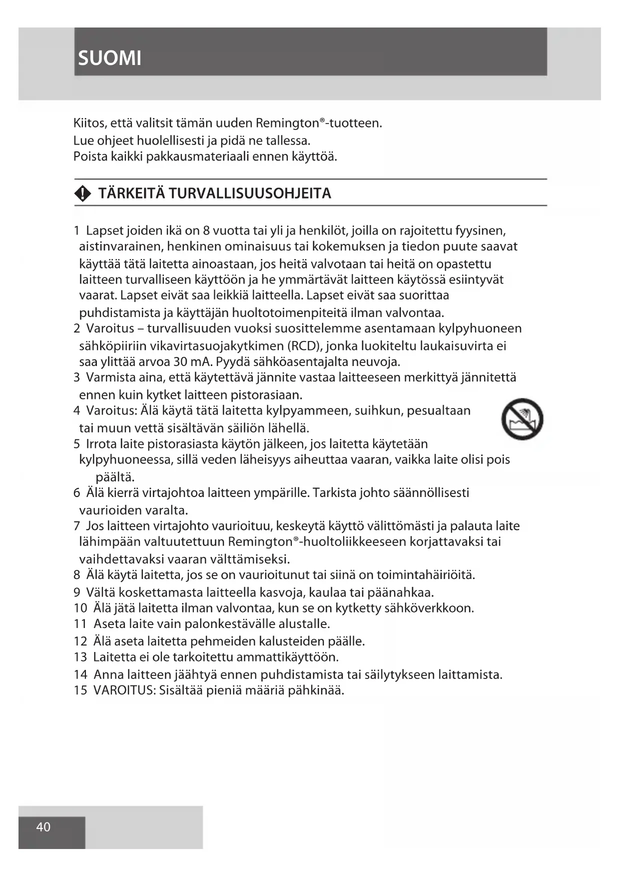 1 Lapset joiden ikä on 8 vuotta tai yli ja henkilöt, joilla on rajoitettu fyysinen, aistinvarainen, henkinen ominaisuus tai kokemuksen ja tiedon puute saavat käyttää tätä laitetta ainoastaan, jos heitä valvotaan tai heitä on opastettu laitteen turvalliseen käyttöön ja he ymmärtävät laitteen käytössä esiintyvät vaarat. Lapset eivät saa leikkiä laitteella. Lapset eivät saa suorittaa puhdistamista ja käyttäjän huoltotoimenpiteitä ilman valvontaa. 2 Varoitus – turvallisuuden vuoksi suosittelemme asentamaan kylpyhuoneen sähköpiiriin vikavirtasuojakytkimen (RCD), jonka luokiteltu laukaisuvirta ei saa ylittää arvoa 30 mA. Pyydä sähköasentajalta neuvoja. 3 Varmista aina, että käytettävä jännite vastaa laitteeseen merkittyä jännitettä ennen kuin kytket laitteen pistorasiaan. 4 Varoitus: Älä käytä tätä laitetta kylpyammeen, suihkun, pesualtaan tai muun vettä sisältävän säiliön lähellä. 5 Irrota laite pistorasiasta käytön jälkeen, jos laitetta käytetään kylpyhuoneessa, sillä veden läheisyys aiheuttaa vaaran, vaikka laite olisi pois päältä. 6 Älä kierrä virtajohtoa laitteen ympärille. Tarkista johto säännöllisesti vaurioiden varalta. 7 Jos laitteen virtajohto vaurioituu, keskeytä käyttö välittömästi ja palauta laite lähimpään valtuutettuun Remington®-huoltoliikkeeseen korjattavaksi tai vaihdettavaksi vaaran välttämiseksi. 8 Älä käytä laitetta, jos se on vaurioitunut tai siinä on toimintahäiriöitä. 9 Vältä koskettamasta laitteella kasvoja, kaulaa tai päänahkaa. 10 Älä jätä laitetta ilman valvontaa, kun se on kytketty sähköverkkoon. 11 Aseta laite vain palonkestävälle alustalle. 12 Älä aseta laitetta pehmeiden kalusteiden päälle. 13 Laitetta ei ole tarkoitettu ammattikäyttöön. 14 Anna laitteen jäähtyä ennen puhdistamista tai säilytykseen laittamista. 15 VAROITUS: Sisältää pieniä määriä pähkinää.41 SUOMI GBDNLFEIDKSFINPSKCZ HUN PLRUTRROGRSIBG HRUAAE