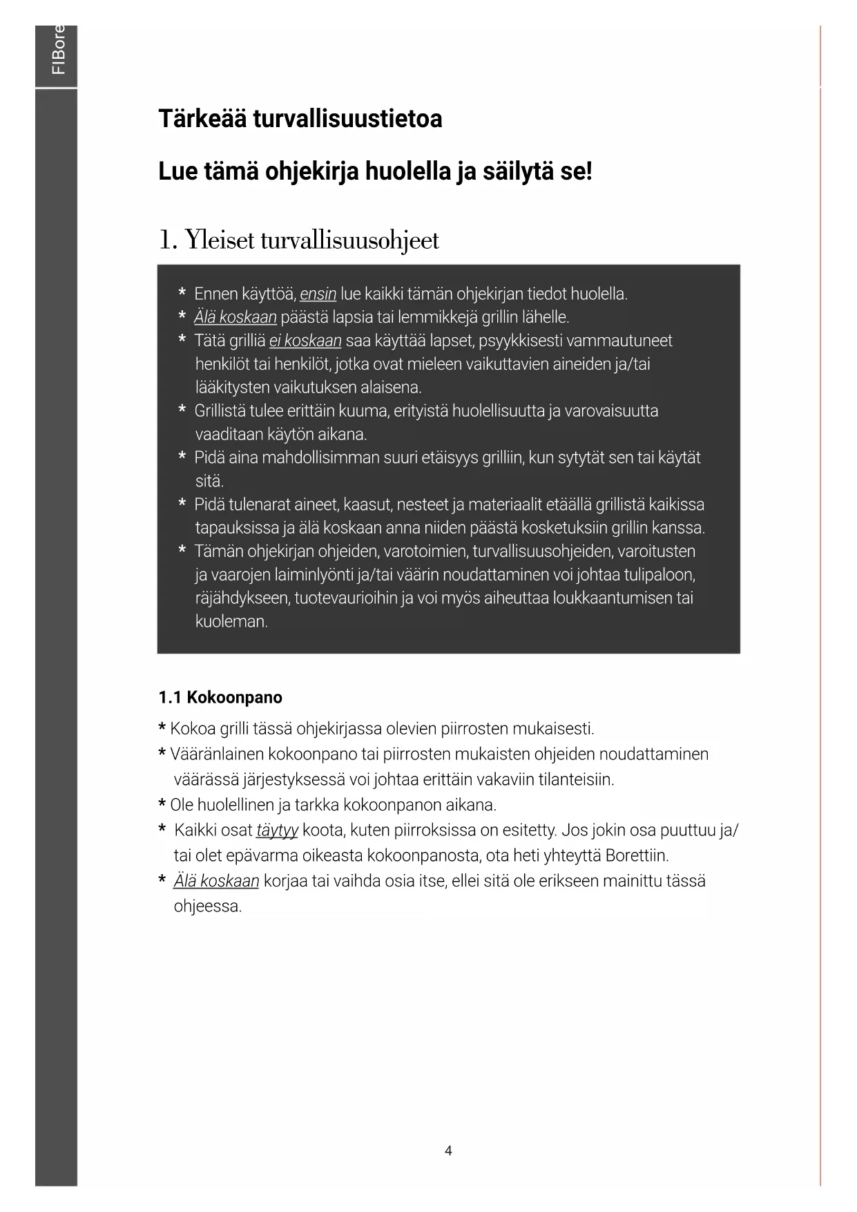 - Denne grill er mærket ifølge den europæiske retningslinje 2002/96EG, vedrørende kasseret apparatur. Denne retningslinje fastlægger normerne for indsamling og genbrug af kasseret apparatur, som er gældende for hele den europæiske union. For grilltilbehør, garanti-, servicebetingelser og øvrige spørgsmål, henviser vi dig til www.boretti.com Du kan sende dine spørgsmål og forslag til info@boretti.com BARILO FI | OHJEKIRJASSA www.boretti.com 16BARILO FI | OHJEKIRJASSA www.boretti.comFIBoretti Maggiore / Käyttöopas – Asennusohje Esittely Onnittelut uuden grillin ostamisesta. Olemme varmoja siitä, että intohimosi grillaukseen ja ulkoilmaelämäntyyliin tekee tavallisesta kesäillasta kauniin buona seran ja pihastasi giardinon. Squadra Boretti Lue tämä ohjekirja huolella ja säilytä se! Tässä ohjekirjassa on tarkkoja ohjeita koskien turvallisuuttasi, grillin kokoonpanoa, käyttöä ja huoltoa. Käytä grilliä ainoastaan ohjekirjan ohjeiden mukaisesti. Terve järki ja varovaisuus käytön aikana ovat pakollisia! 2FIBoretti Maggiore / Käyttöopas – Asennusohje Sisältö