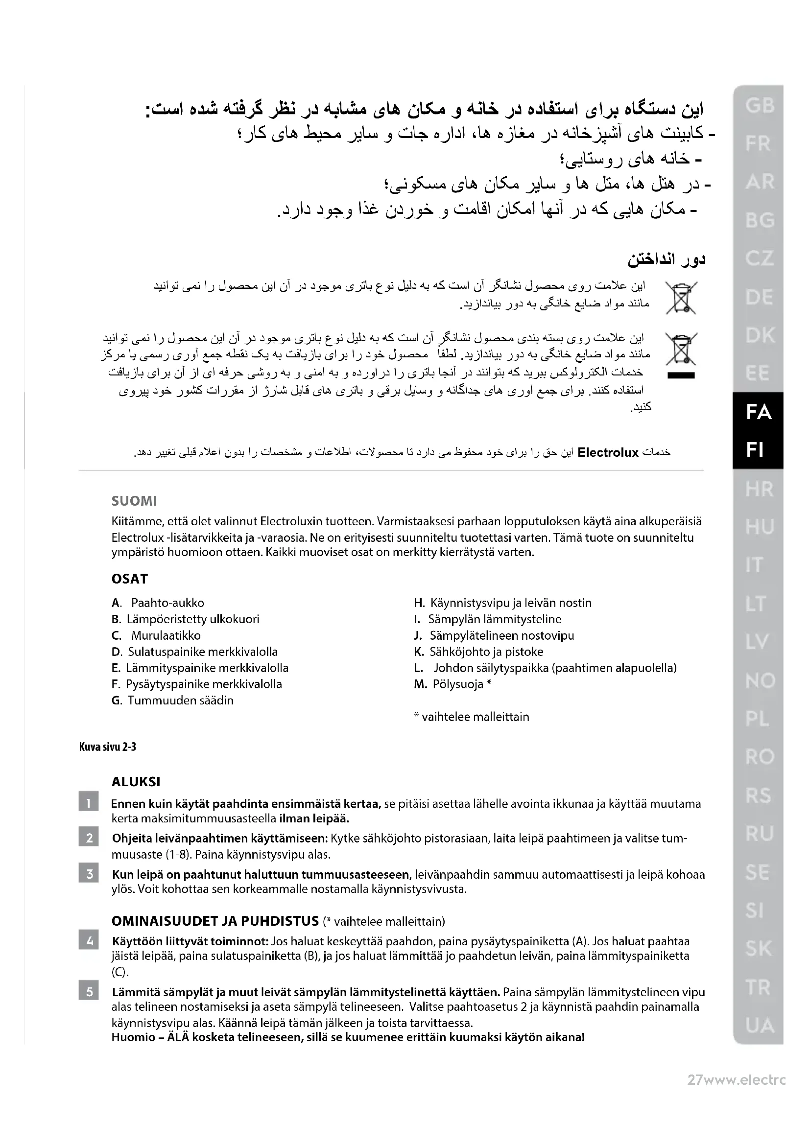 - vaihtelee malleittain Kuva sivu 2-3 ALUKSI 1 Ennen kuin käytät paahdinta ensimmäistä kertaa, se pitäisi asettaa lähelle avointa ikkunaa ja käyttää muutama kerta maksimitummuusasteella ilman leipää. 2 Ohjeita leivänpaahtimen käyttämiseen: Kytke sähköjohto pistorasiaan, laita leipä paahtimeen ja valitse tum- muusaste (1-8). Paina käynnistysvipu alas. 3 Kun leipä on paahtunut haluttuun tummuusasteeseen, leivänpaahdin sammuu automaattisesti ja leipä kohoaa ylös. Voit kohottaa sen korkeammalle nostamalla käynnistysvivusta. OMINAISUUDET JA PUHDISTUS (* vaihtelee malleittain) 4 Käyttöön liittyvät toiminnot: Jos haluat keskeyttää paahdon, paina pysäytyspainiketta (A). Jos haluat paahtaa jäistä leipää, paina sulatuspainiketta (B), ja jos haluat lämmittää jo paahdetun leivän, paina lämmityspainiketta (C). 5 Lämmitä sämpylät ja muut leivät sämpylän lämmitystelinettä käyttäen. Paina sämpylän lämmitystelineen vipu alas telineen nostamiseksi ja aseta sämpylä telineeseen. Valitse paahtoasetus 2 ja käynnistä paahdin painamalla käynnistysvipu alas. Käännä leipä tämän jälkeen ja toista tarvittaessa. Huomio – ÄLÄ kosketa telineeseen, sillä se kuumenee erittäin kuumaksi käytön aikana!28 www.electrolux.com 6 Puhdistus ja hoito: irrota virtajohto pistorasiasta ja anna paahtimen jäähtyä. Tyhjennä murulaatikko. Pyyhi ulkopinnat kostealla liinalla. Älä koskaan käytä syövyttäviä tai hankaavia puhdistusaineita äläkä upota laitetta nesteeseen. Nauti uudesta Electrolux-tuotteestasi! TURVALLISUUSOHJEITA Lue seuraavat ohjeet huolellisesti ennen kuin käytät laitetta ensimmäisen kerran.