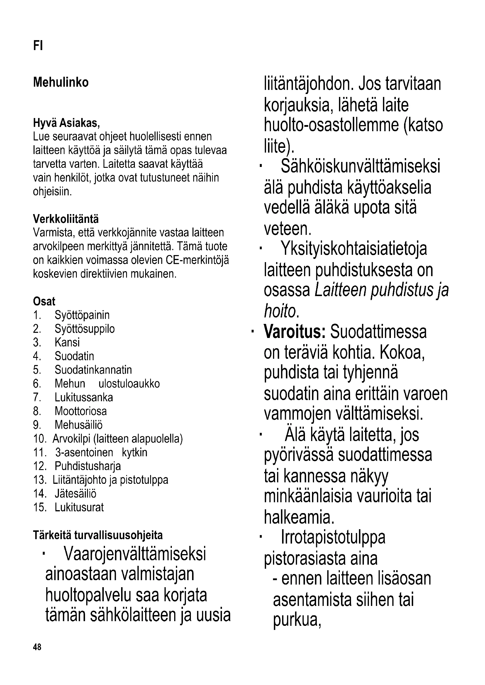 Tärkeitä turvallisuusohjeita ∙ Vaarojen välttämiseksi ainoastaan valmistajan huoltopalvelu saa korjata tämän sähkölaitteen ja uusia liitäntäjohdon. Jos tarvitaan korjauksia, lähetä laite huolto-osastollemme (katso liite). ∙ Sähköiskun välttämiseksi älä puhdista käyttöakselia vedellä äläkä upota sitä veteen. ∙ Yksityiskohtaisia tietoja laitteen puhdistuksesta on osassa Laitteen puhdistus ja hoito. ∙ Varoitus: Suodattimessa on teräviä kohtia. Kokoa, puhdista tai tyhjennä suodatin aina erittäin varoen vammojen välttämiseksi. ∙ Älä käytä laitetta, jos pyörivässä suodattimessa tai kannessa näkyy minkäänlaisia vaurioita tai halkeamia. ∙ Irrota pistotulppa pistorasiasta aina - ennen laitteen lisäosan asentamista siihen tai purkua, FI49 - käytön jälkeen, - jos laitteessa on käyttöhäiriö, - ennen kuin avaat kannen, - kun laite ei ole valvottuna, - ennen laitteen puhdistamista. ∙ Tämä laite on tarkoitettu kotitalouskäyttöön tai vastaavaan, kuten - ruokalat, toimistot ja muut kaupalliset ympäristöt - maatalousyritykset - hotellien, motellien jne. ja vastaavien yritysten asiakkaat - aamiaisen ja majoituksen tarjoavat majatalot. ∙ Varoitus: Väärinkäytöstä saattaa seurata vakavia henkilövammoja. ∙ Henkilö, jolla on fyysisesti, aistillisesti tai henkisesti rajoittunut toimintakyky tai jolla on puuttuvat tai vajavaiset tiedot laitteen toiminnasta, saa käyttää laitetta vain siinä tapauksessa, että hän on valvonnan alaisena tai hänelle on annettu tarkat ohjeet laitteen käyttämiseen. Lisäksi hän ymmärtää täysin laitteen käyttöön liittyvät vaarat ja noudattaa tarvittavia turvatoimia. ∙ Lasten ei saa antaa käyttää laitetta. Laite ja sen liitäntäjohto on pidettävä poissa lasten ulottuvilta. ∙ Lasten ei saa antaa leikkiä laitteella. ∙ Varoitus: Pidä lapset poissa pakkausmateriaalien luota potentiaalisen vaaratilanteen esim. tukehtumisvaaran vuoksi. ∙ Tarkasta aina ennen laitteen käyttöä huolellisesti laitteen runko, liitäntäjohto ja mahdolliset asennetut lisäosat vaurioiden varalta. Jos laite on esimerkiksi pudonnut kovalle pinnalle tai liitäntäjohdon vetämiseen on käytetty liikaa voimaa, laitetta ei saa enää käyttää: näkymättömätkin vauriot voivat aiheuttaa laitetta käytettäessä vaaratilanteita. ∙ Turvallisuuden takia on syöttöpaininta käytettävä aina, kun raaka-aineita syötetään syöttösuppiloon. Älä koskaan syötä aineksia käsin. ∙ Kun laitteesta on katkaistu virta, odota50 aina, kunnes moottori on pysähtynyt täysin ennen kannen avaamista. ∙ Älä anna laitteen tai liitäntäjohdon koskettaa kuumia pintoja tai joutua kosketuksiin lämmönlähteiden kanssa. ∙ Kun irrotat pistokkeen pistorasiasta, älä vedä liitäntäjohdosta vaan tartu aina pistokkeeseen. Älä kosketa pistoketta märin käsin. ∙ Älä jätä liitäntäjohtoa riippumaan vapaana. ∙ Jos laite vahingoittuu väärinkäytön seurauksena tai siksi, että annettuja ohjeita ei ole noudatettu, valmistaja ei vastaa aiheutuneista vahingoista. Käyttötarkoitus ∙ Tätä laitetta saa käyttää ainoastaan mehun uuttamiseen hedelmistä ja vihanneksista kuten omenista, porkkanoista, kurkusta, tomaateista tms. ∙ Seuraavat marjat, hedelmät ja vihannekset eivät sovellu mehustettaviksi: viikunat, avokadot, munakoisot, seljamarjat, raparperi, karpalot, jne. ∙ Kuorittuja banaaneja lisätään vain antamaan makua, sillä niistä saa vain vähän mehua. ∙ Kaikki muu kuin näissä ohjeissa kuvailtu käyttö on määräysten vastaista ja voi aiheuttaa henkilövammoja tai aineellisia vahinkoja. Lyhytaikainen käyttö Laite on tarkoitettu vain lyhytaikaiseen käyttöön, joten sitä ei pidä käyttää yhtäjaksoisesti yhtä (1) minuuttia pidempään. Anna laitteen jäähtyä 1 minuutin ajan käytön jälkeen. Anna laitteen jäähtyä 3 tällaisen jakson jälkeen 15 minuutin ajan ennen kuin käynnistät sen uudelleen. Ylikuumenemissuojaus Tämä laite kytkeytyy automaattisesti pois päältä ylikuumenemistilanteessa. Jos näin käy, irrota laitteen pistotulppa pistorasiasta ja anna laitteen jäähtyä 30 minuutin ajan, jonka jälkeen se on taas käyttövalmis. Ennen ensikäyttöä Laite on puhdistettava jaksossa Laitteen puhdistus ja hoito kuvatulla tavalla ennen kuin sitä käytetään ensimmäisen kerran. Kytkin Laitteessa on 3-asentoinen kytkin. 0 laite on kytketty pois toiminnasta I hidas mehustus II nopea mehustus Vihje! Hitaan mehustuksen asetus I soveltuu pehmeille, mehukkaille hedelmille ja vihanneksille kuten meloneille (kuorituille), tomaateille yms. Suosittelemme kovempia hedelmiä ja vihanneksia, kuten omenia ja porkkanoita, varten nopean mehustuksen asetusta II. Toiminta Ainesten valmistelu ∙ Pese ja paloittele hedelmä tai vihannes tarvittaessa niin, että palat sopivat syöttösuppiloon. Poista kivet, siemenet ja siemenkodat, jotta laite ei vahingoittuisi.51 Laitteen valmistelu ∙ Varmista, että kytkin on asetettu asentoon