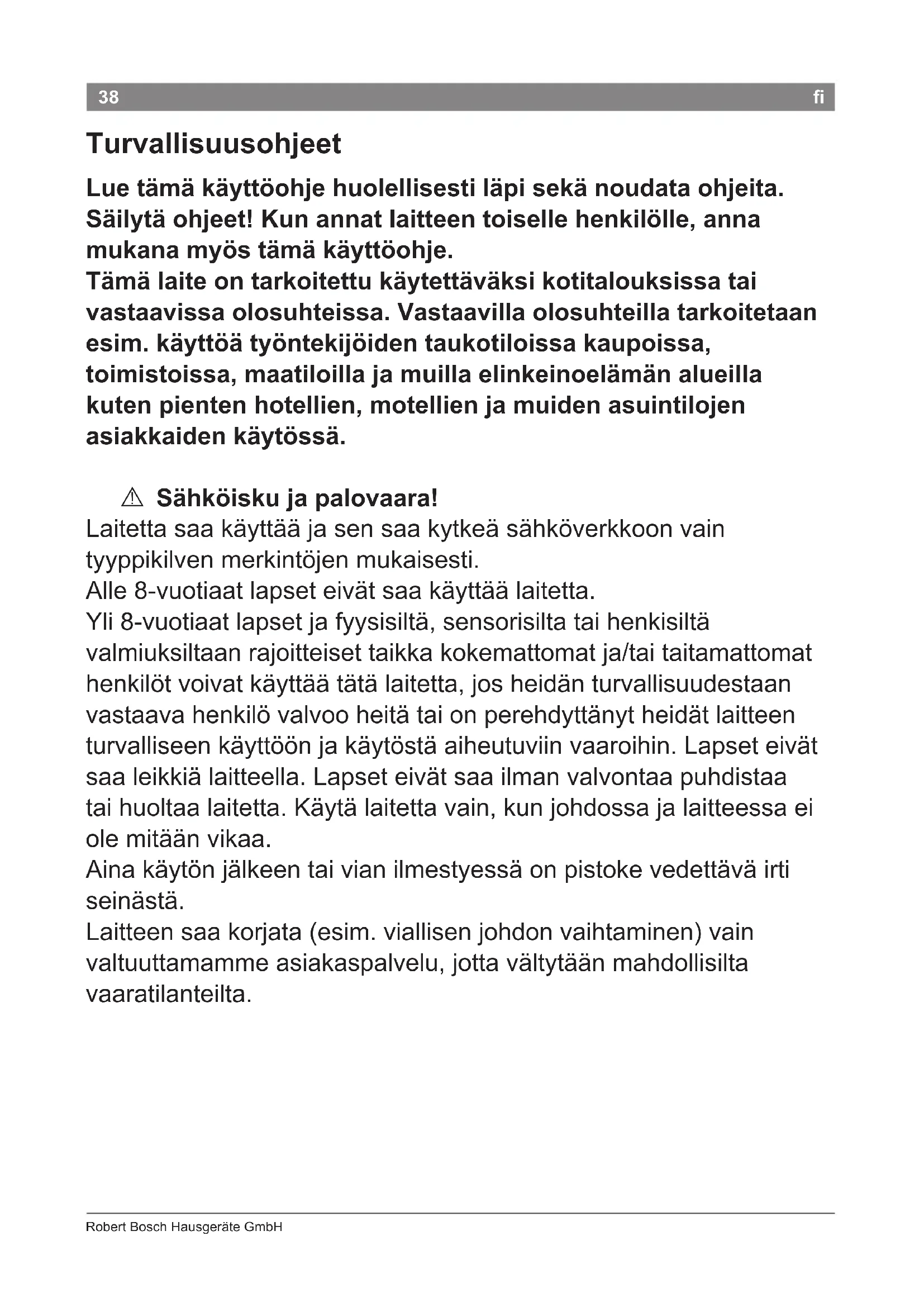 Älä käytä kylpyammeessa tai pesualtaassa olevan veden läheisyydessä. A Hengenvaara! Laite ei saa koskaan olla kosketuksessa veden kanssa. Vaara on olemassa, vaikka virta olisi pois päältä. Pistoke on otettava irti seinästä, kun laitetta ei käytetä. Lisäsuoja saadaan suojaamalla asunnon tai talon sähköverkko 30 mA:n vikavirta-suojakytkimellä. Lisätietoja ja neuvoja saa valtuutetuilta sähköasentajilta. A Tukehtumisvaara! Älä anna lasten leikkiä pakkausmateriaalilla. A Palovamman vaara! Anna muotoilusuuttimen ja volyymisuuttimen jäähtyä ennen kuin irrotat ne, sillä ne voivat kuumentua.40 Robert Bosch Hausgeräte GmbH