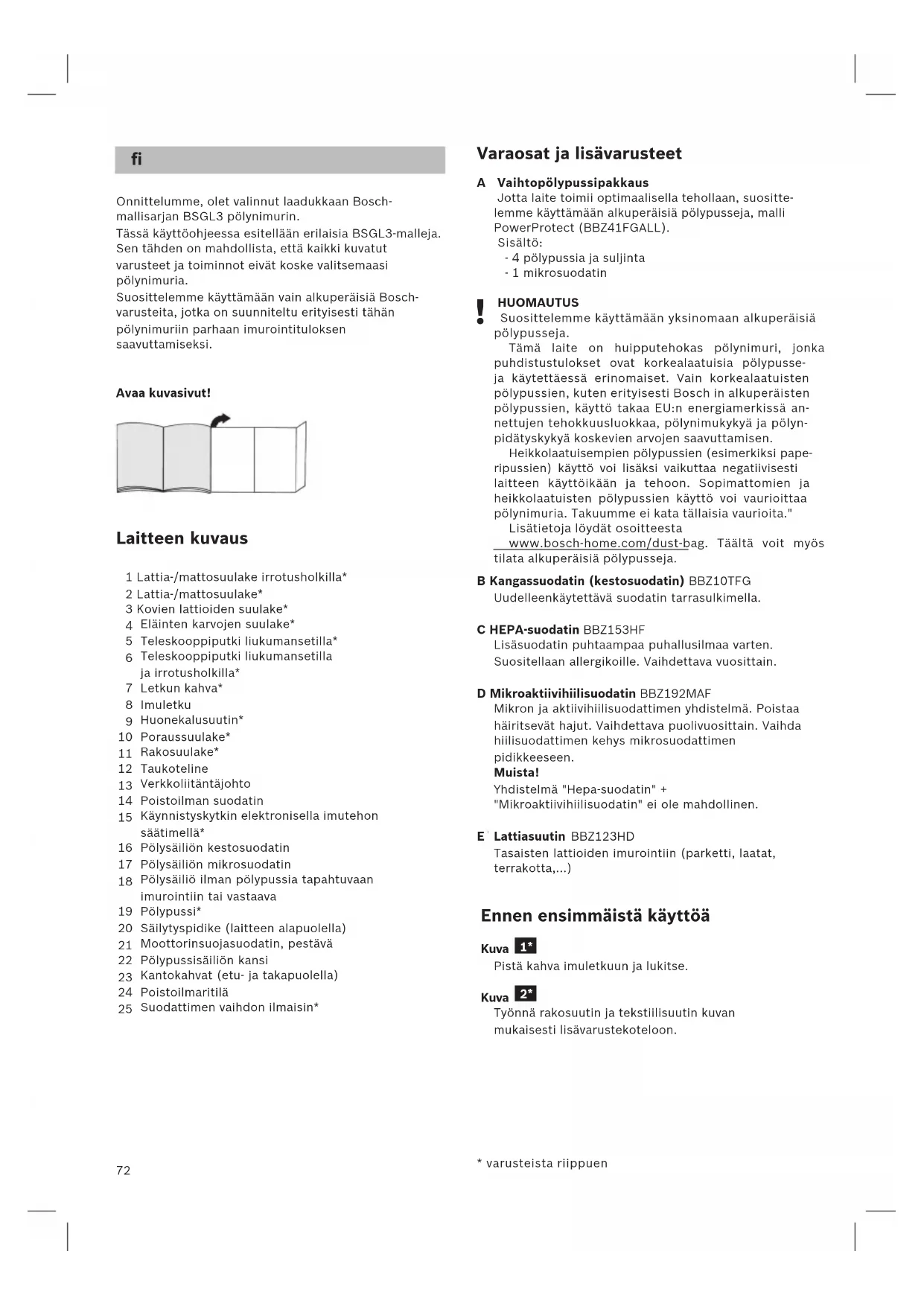 Onnittelumme, olet valinnut laadukkaan Bosch- mallisarjan BSGL3 pölynimurin. Tässä käyttöohjeessa esitellään erilaisia BSGL3-malleja. Sen tähden on mahdollista, että kaikki kuvatut varusteet ja toiminnot eivät koske valitsemaasi pölynimuria. Suosittelemme käyttämään vain alkuperäisiä Bosch- varusteita, jotka on suunniteltu erityisesti tähän pölynimuriin parhaan imurointituloksen saavuttamiseksi. Avaa kuvasivut! Laitteen kuvaus 1 Lattia-/mattosuulake irrotusholkilla* 2 Lattia-/mattosuulake* 3 Kovien lattioiden suulake* 4 TURBO-UNIVERSAL