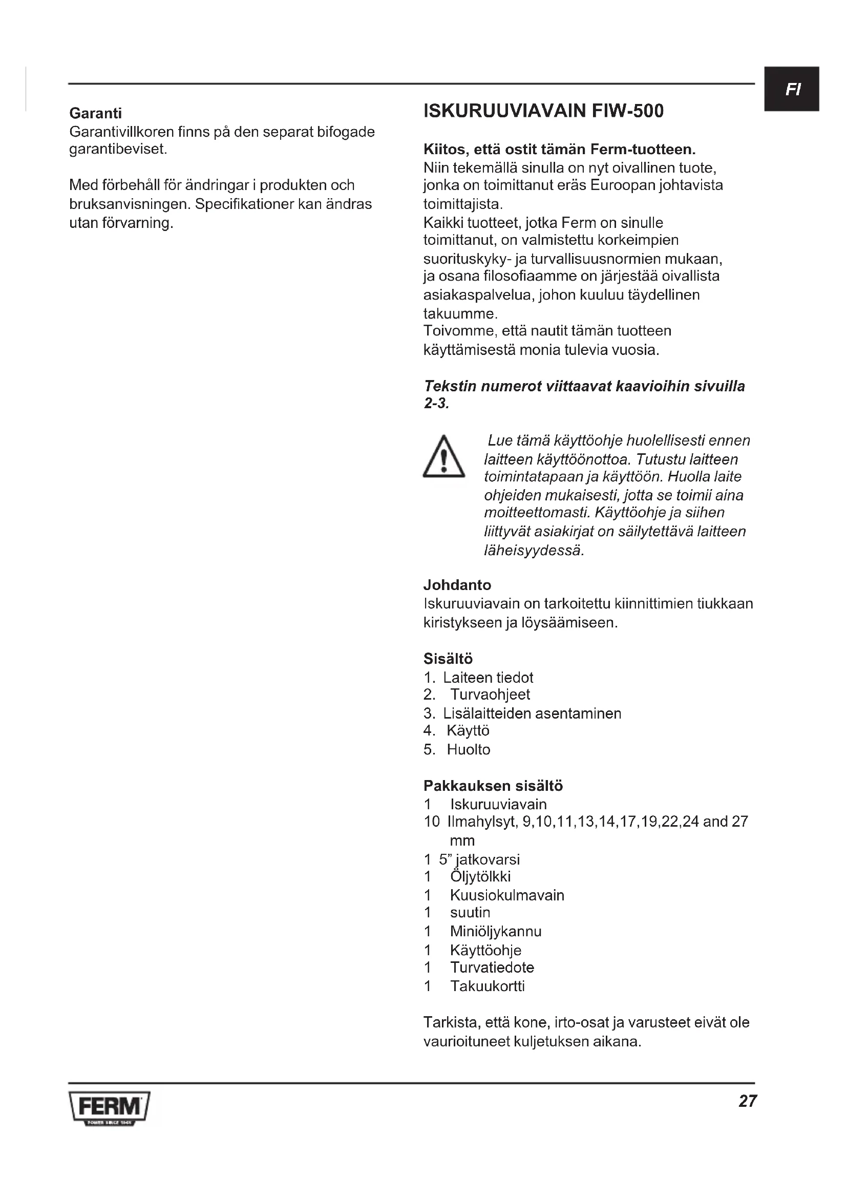 Garanti Garantivillkoren finns på den separat bifogade garantibeviset. Med förbehåll för ändringar i produkten och bruksanvisningen. Specifikationer kan ändras utan förvarning. ISKURUUVIAVAIN FIW-500 Kiitos, että ostit tämän Ferm-tuotteen. Niin tekemällä sinulla on nyt oivallinen tuote, jonka on toimittanut eräs Euroopan johtavista toimittajista. Kaikki tuotteet, jotka Ferm on sinulle toimittanut, on valmistettu korkeimpien suorituskyky- ja turvallisuusnormien mukaan, ja osana filosofiaamme on järjestää oivallista asiakaspalvelua, johon kuuluu täydellinen takuumme. Toivomme, että nautit tämän tuotteen käyttämisestä monia tulevia vuosia. Tekstin numerot viittaavat kaavioihin sivuilla 2-3. Lue tämä käyttöohje huolellisesti ennen laitteen käyttöönottoa. Tutustu laitteen toimintatapaan ja käyttöön. Huolla laite ohjeiden mukaisesti, jotta se toimii aina moitteettomasti. Käyttöohje ja siihen liittyvät asiakirjat on säilytettävä laitteen läheisyydessä. johdanto Iskuruuviavain on tarkoitettu kiinnittimien tiukkaan kiristykseen ja löysäämiseen. Sisältö