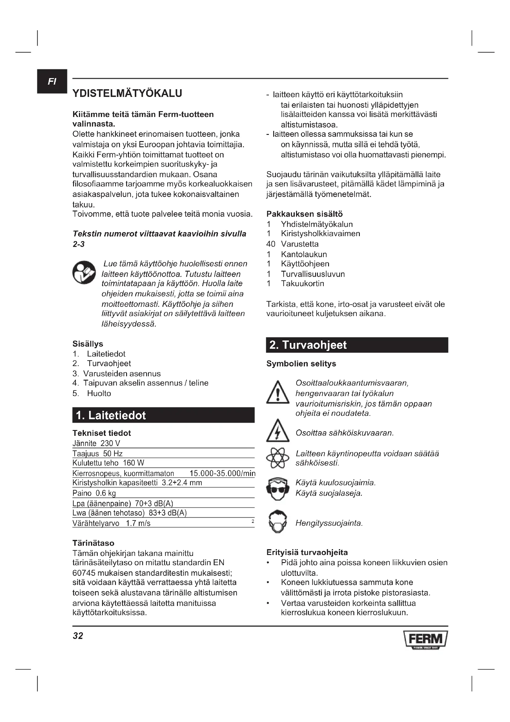 Kiitämme teitä tämän Ferm-tuotteen valinnasta. Olette hankkineet erinomaisen tuotteen, jonka valmistaja on yksi Euroopan johtavia toimittajia. Kaikki Ferm-yhtiön toimittamat tuotteet on valmistettu korkeimpien suorituskyky- ja turvallisuusstandardien mukaan. Osana filosofiaamme tarjoamme myös korkealuokkaisen asiakaspalvelun, jota tukee kokonaisvaltainen takuu. Toivomme, että tuote palvelee teitä monia vuosia. Tekstin numerot viittaavat kaavioihin sivulla 2-3 Lue tämä käyttöohje huolellisesti ennen laitteen käyttöönottoa. Tutustu laitteen toimintatapaan ja käyttöön. Huolla laite ohjeiden mukaisesti, jotta se toimii aina moitteettomasti. Käyttöohje ja siihen liittyvät asiakirjat on säilytettävä laitteen läheisyydessä. Sisällys