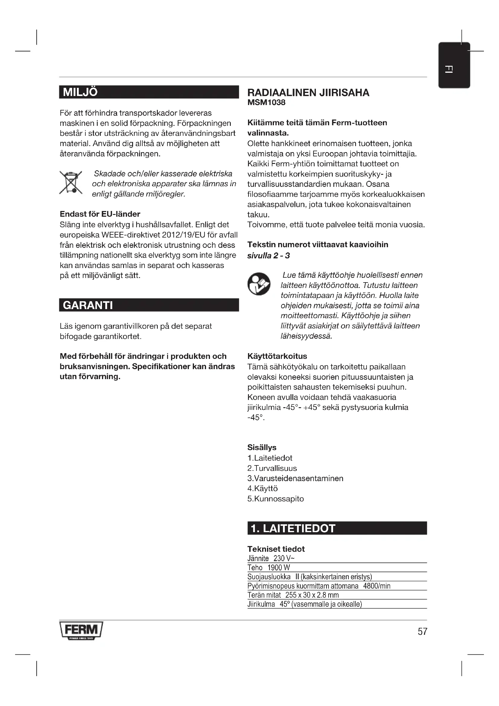 MILJÖ För att förhindra transportskador levereras maskinen i en solid förpackning. Förpackningen består i stor utsträckning av återanvändningsbart material. Använd dig alltså av möjligheten att återanvända förpackningen. Skadade och/eller kasserade elektriska och elektroniska apparater ska lämnas in enligt gällande miljöregler. Endast för EU-länder Släng inte elverktyg i hushållsavfallet. Enligt det europeiska WEEE-direktivet 2012/19/EU för avfall från elektrisk och elektronisk utrustning och dess tillämpning nationellt ska elverktyg som inte längre kan användas samlas in separat och kasseras på ett miljövänligt sätt. GARANTI Läs igenom garantivillkoren på det separat bifogade garantikortet. Med förbehåll för ändringar i produkten och bruksanvisningen. Specifikationer kan ändras utan förvarning. RADIAALINEN JIIRISAHA MSM1038 Kiitämme teitä tämän Ferm-tuotteen valinnasta. Olette hankkineet erinomaisen tuotteen, jonka valmistaja on yksi Euroopan johtavia toimittajia. Kaikki Ferm-yhtiön toimittamat tuotteet on valmistettu korkeimpien suorituskyky- ja turvallisuusstandardien mukaan. Osana filosofiaamme tarjoamme myös korkealuokkaisen asiakaspalvelun, jota tukee kokonaisvaltainen takuu. Toivomme, että tuote palvelee teitä monia vuosia. Tekstin numerot viittaavat kaavioihin sivulla 2 - 3 Lue tämä käyttöohje huolellisesti ennen laitteen käyttöönottoa. Tutustu laitteen toimintatapaan ja käyttöön. Huolla laite ohjeiden mukaisesti, jotta se toimii aina moitteettomasti. Käyttöohje ja siihen liittyvät asiakirjat on säilytettävä laitteen läheisyydessä. Käyttötarkoitus Tämä sähkötyökalu on tarkoitettu paikallaan olevaksi koneeksi suorien pituussuuntaisten ja poikittaisten sahausten tekemiseksi puuhun. Koneen avulla voidaan tehdä vaakasuoria jiirikulmia -45°- +45° sekä pystysuoria kulmia -45°. Sisällys