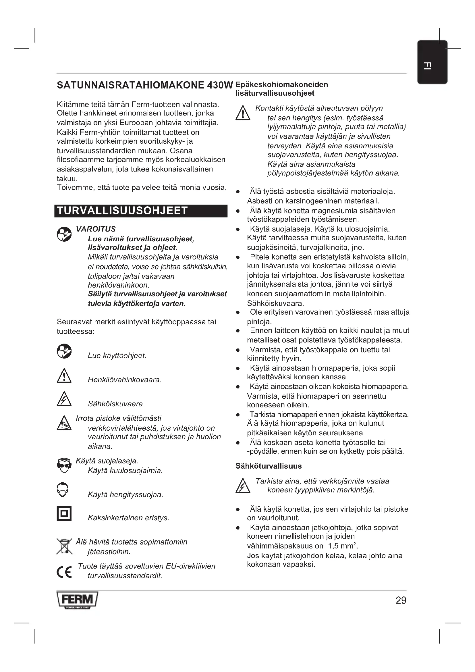 SATUNNAISRATAHIOMAKONE 430W KiitämmeteitätämänFerm-tuotteenvalinnasta. Olettehankkineeterinomaisentuotteen,jonka valmistaja on yksi Euroopan johtavia toimittajia. KaikkiFerm-yhtiöntoimittamattuotteeton valmistettukorkeimpiensuorituskyky-ja turvallisuusstandardienmukaan.Osana losoaammetarjoammemyöskorkealuokkaisen asiakaspalvelun, jota tukee kokonaisvaltainen takuu. Toivomme,ettätuotepalveleeteitämoniavuosia. TURVALLISUUSOHJEET