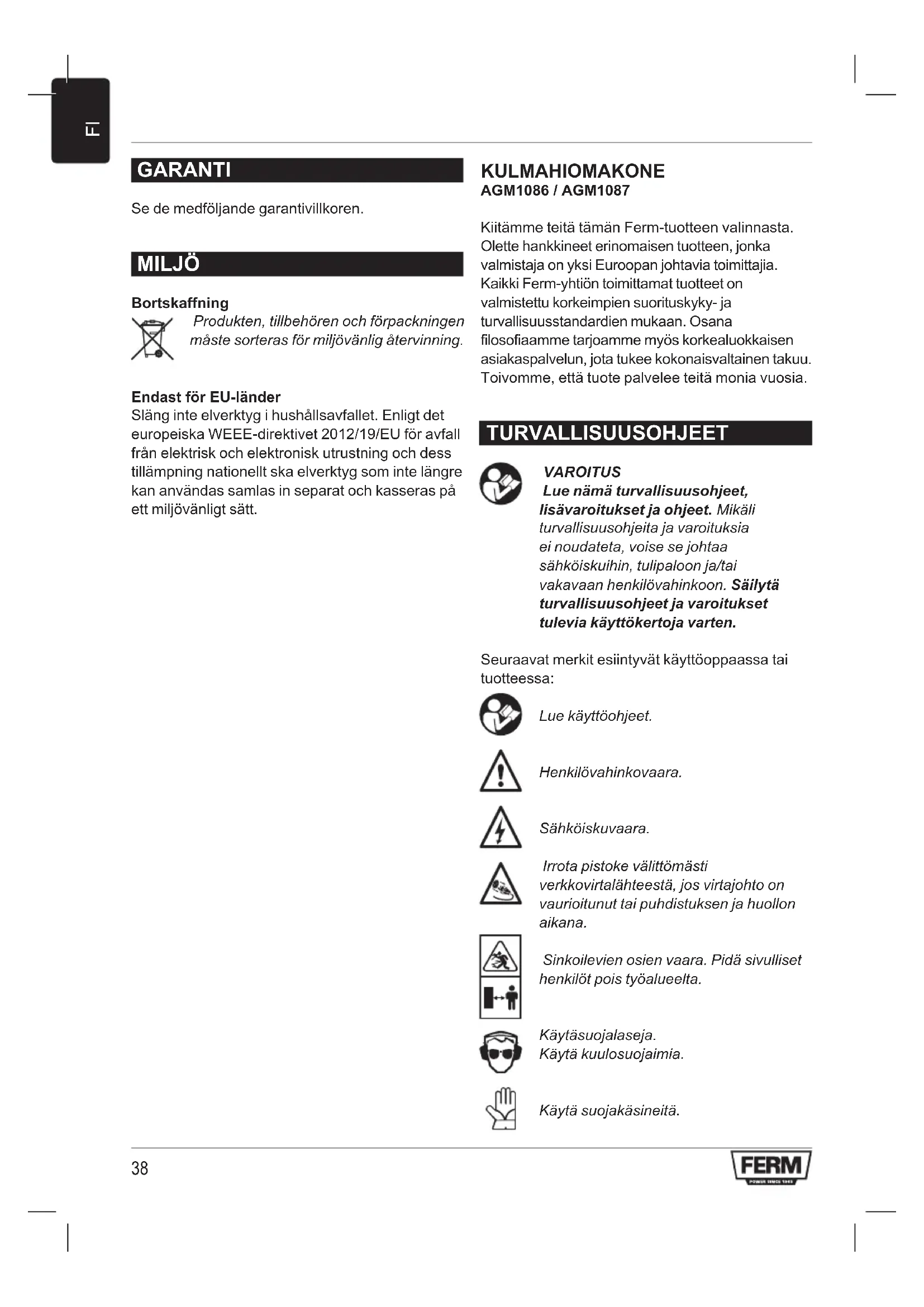 GARANTI Se de medföljande garantivillkoren. MILJÖ Bortskaffning Produkten, tillbehören och förpackningen måste sorteras för miljövänlig återvinning. Endast för EU-länder Släng inte elverktyg i hushållsavfallet. Enligt det europeiska WEEE-direktivet 2012/19/EU för avfall från elektrisk och elektronisk utrustning och dess tillämpning nationellt ska elverktyg som inte längre kan användas samlas in separat och kasseras på ett miljövänligt sätt. KULMAHIOMAKONE AGM1086 / AGM1087 Kiitämme teitä tämän Ferm-tuotteen valinnasta. Olette hankkineet erinomaisen tuotteen, jonka valmistaja on yksi Euroopan johtavia toimittajia. Kaikki Ferm-yhtiön toimittamat tuotteet on valmistettu korkeimpien suorituskyky- ja turvallisuusstandardien mukaan. Osana filosofiaamme tarjoamme myös korkealuokkaisen asiakaspalvelun, jota tukee kokonaisvaltainen takuu. Toivomme, että tuote palvelee teitä monia vuosia. TURVALLISUUSOHJEET VAROITUS Lue nämä turvallisuusohjeet, lisävaroitukset ja ohjeet. Mikäli turvallisuusohjeita ja varoituksia ei noudateta, voise se johtaa sähköiskuihin, tulipaloon ja/tai vakavaan henkilövahinkoon. Säilytä turvallisuusohjeet ja varoitukset tulevia käyttökertoja varten. Seuraavat merkit esiintyvät käyttöoppaassa tai tuotteessa: Lue käyttöohjeet. Henkilövahinkovaara. Sähköiskuvaara. Irrota pistoke välittömästi verkkovirtalähteestä, jos virtajohto on vaurioitunut tai puhdistuksen ja huollon aikana. Sinkoilevien osien vaara. Pidä sivulliset henkilöt pois työalueelta. Käytä suojalaseja. Käytä kuulosuojaimia. Käytä suojakäsineitä.39