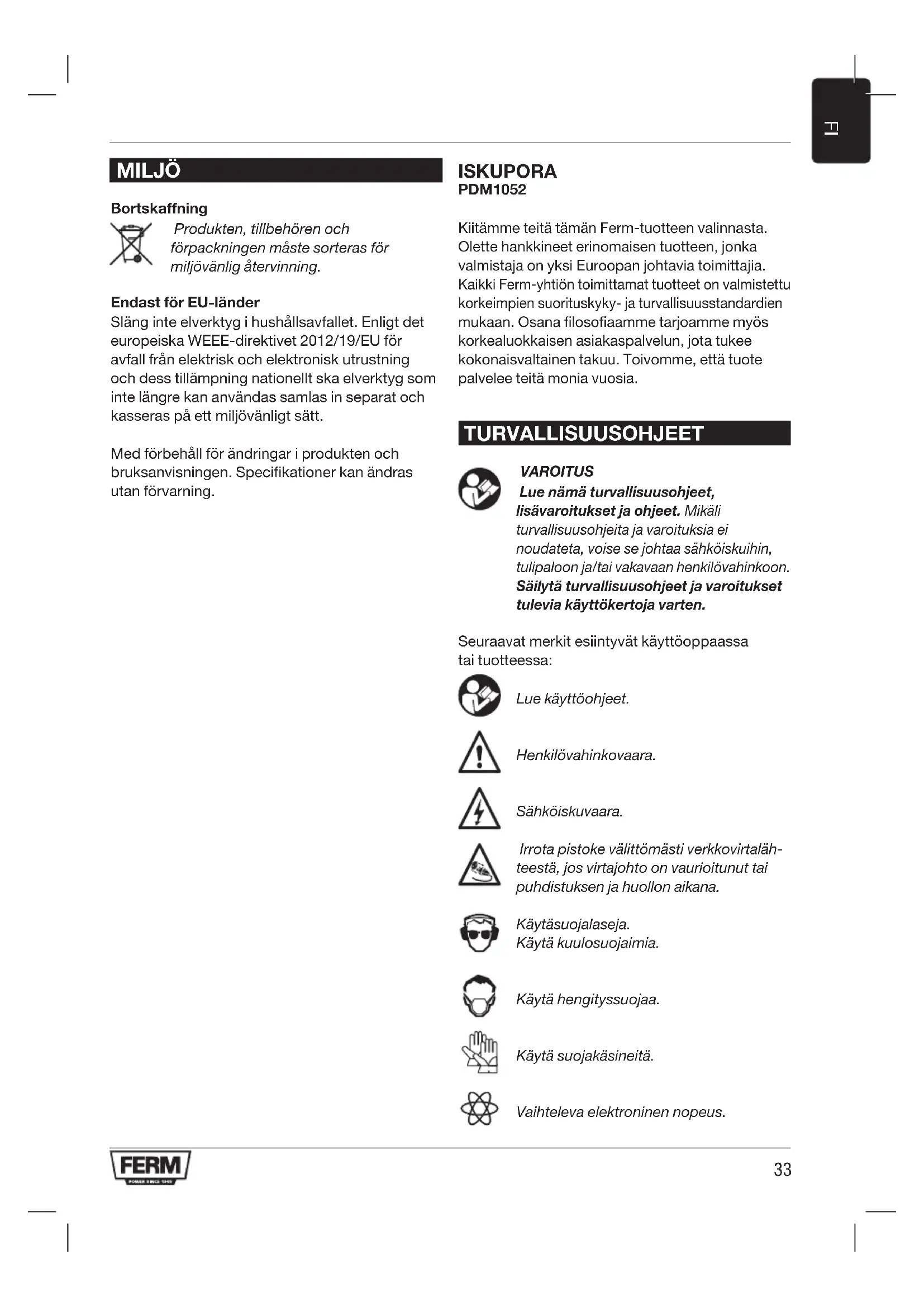 MILJÖ Bortskaffning Produkten, tillbehören och förpackningen måste sorteras för miljövänlig återvinning. Endast för EU-länder Släng inte elverktyg i hushållsavfallet. Enligt det europeiska WEEE-direktivet 2012/19/EU för avfall från elektrisk och elektronisk utrustning och dess tillämpning nationellt ska elverktyg som inte längre kan användas samlas in separat och kasseras på ett miljövänligt sätt. Med förbehåll för ändringar i produkten och bruksanvisningen. Specifikationer kan ändras utan förvarning. ISKUPORA PDM1052 Kiitämme teitä tämän Ferm-tuotteen valinnasta. Olette hankkineet erinomaisen tuotteen, jonka valmistaja on yksi Euroopan johtavia toimittajia. Kaikki Ferm-yhtiön toimittamat tuotteet on valmistettu korkeimpien suorituskyky- ja turvallisuusstandardien mukaan. Osana filosofiaamme tarjoamme myös korkealuokkaisen asiakaspalvelun, jota tukee kokonaisvaltainen takuu. Toivomme, että tuote palvelee teitä monia vuosia. TURVALLISUUSOHJEET VAROITUS Lue nämä turvallisuusohjeet, lisävaroitukset ja ohjeet. Mikäli turvallisuusohjeita ja varoituksia ei noudateta, voise se johtaa sähköiskuihin, tulipaloon ja/tai vakavaan henkilövahinkoon. Säilytä turvallisuusohjeet ja varoitukset tulevia käyttökertoja varten. Seuraavat merkit esiintyvät käyttöoppaassa tai tuotteessa: Lue käyttöohjeet. Henkilövahinkovaara. Sähköiskuvaara. Irrota pistoke välittömästi verkkovirtaläh- teestä, jos virtajohto on vaurioitunut tai puhdistuksen ja huollon aikana. Käytä suojalaseja. Käytä kuulosuojaimia. Käytä hengityssuojaa. Käytä suojakäsineitä. Vaihteleva elektroninen nopeus.34