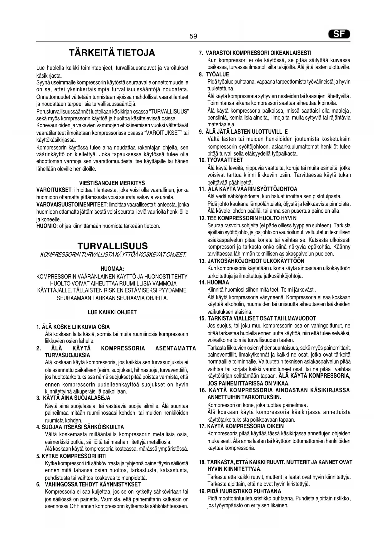 Kompressoria pitäa kayttä tassä kaskirjassa annettujen oheiden mukaisesti. Äl a anna lasten tai kayttöön tottumattomien henkilöiden kayttäk Kompressoria.