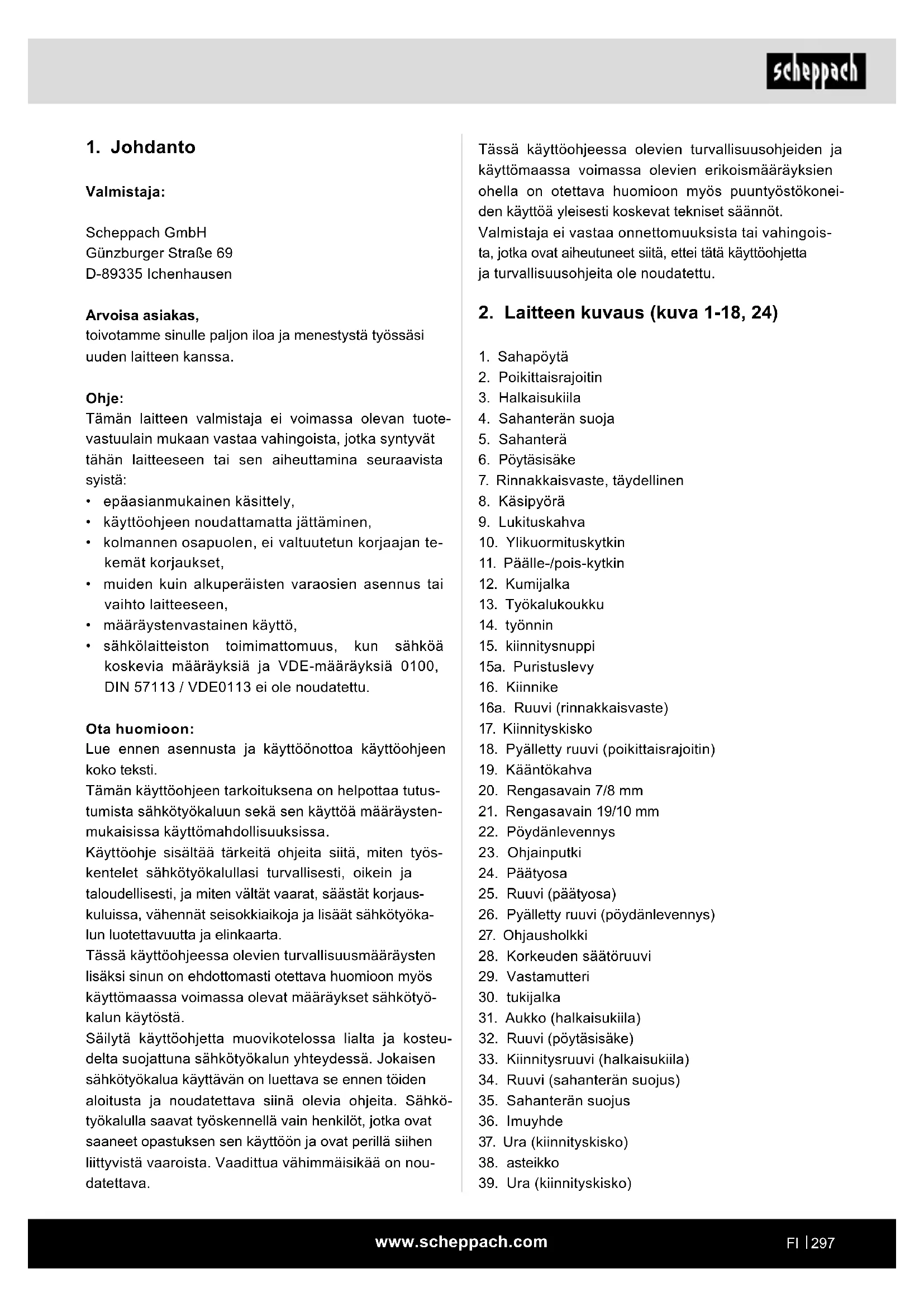 - sähkölaitteiston toimimattomuus, kun sähköä koskevia määräyksiä ja VDE-määräyksiä 0100, DIN 57113 / VDE0113 ei ole noudatettu. Ota huomioon: Lue ennen asennusta ja käyttöönottoa käyttöohjeen koko teksti. Tämän käyttöohjeen tarkoituksena on helpottaa tutus- tumista sähkötyökaluun sekä sen käyttöä määräysten- mukaisissa käyttömahdollisuuksissa. Käyttöohje sisältää tärkeitä ohjeita siitä, miten työs- kentelet sähkötyökalullasi turvallisesti, oikein ja taloudellisesti, ja miten vältät vaarat, säästät korjaus- kuluissa, vähennät seisokkiaikoja ja lisäät sähkötyöka- lun luotettavuutta ja elinkaarta. Tässä käyttöohjeessa olevien turvallisuusmääräysten lisäksi sinun on ehdottomasti otettava huomioon myös käyttömaassa voimassa olevat määräykset sähkötyö- kalun käytöstä. Säilytä käyttöohjetta muovikotelossa lialta ja kosteu- delta suojattuna sähkötyökalun yhteydessä. Jokaisen sähkötyökalua käyttävän on luettava se ennen töiden aloitusta ja noudatettava siinä olevia ohjeita. Sähkö- työkalulla saavat työskennellä vain henkilöt, jotka ovat saaneet opastuksen sen käyttöön ja ovat perillä siihen liittyvistä vaaroista. Vaadittua vähimmäisikää on nou- datettava.www.scheppach.com