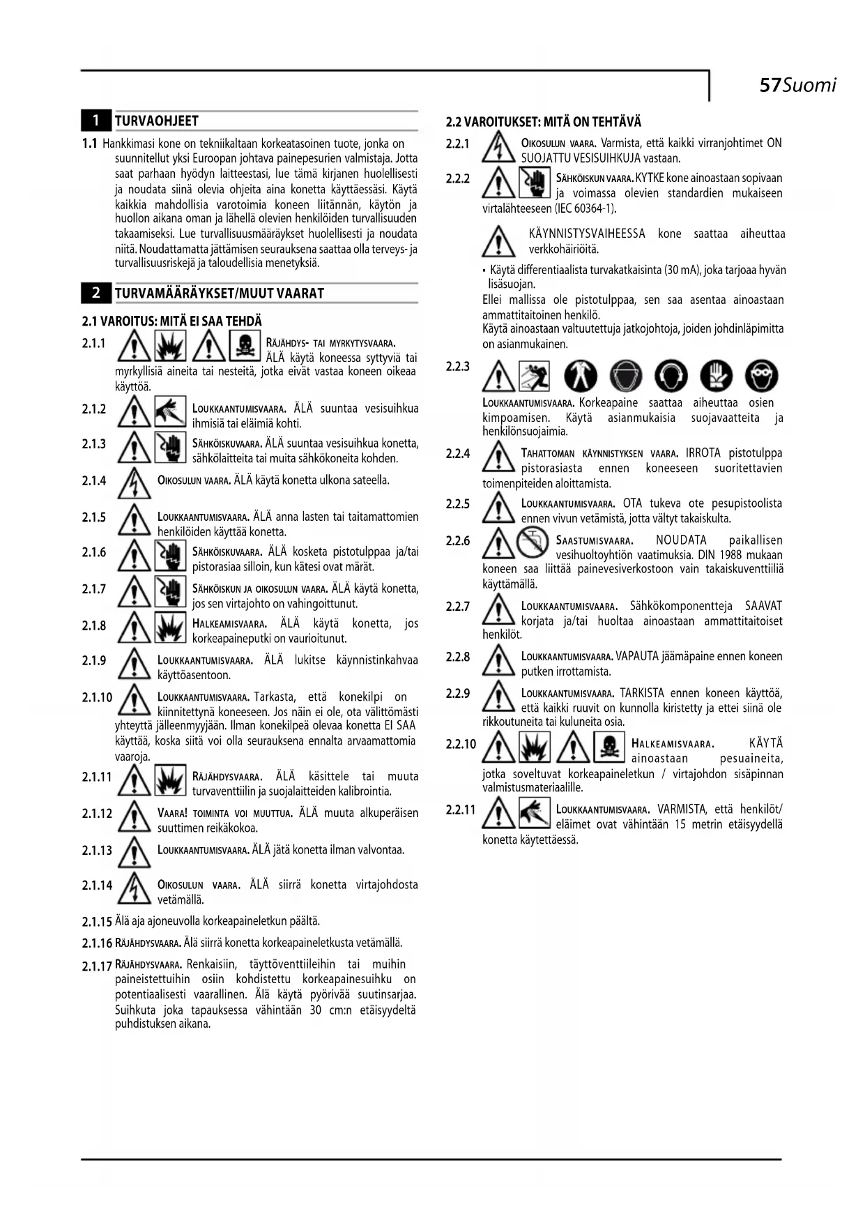 Koneen käyttö on kiellettyä henkilöiltä, jotka eivät tunne sen käyt-töä tai eivät ole lukeneet käyttöoppaan ohjeita huolellisesti.Älä käytä koneessa syttyviä, räjähdysvaarallisia tai myrkyllisiä nesteitä.Älä käytä konetta potentiaalisesti syttyvässä tai räjähdysvaaralli-sessa tilassa.Älä käytä ei-alkuperäisiä tai eri mallille tarkoitettuja varusteita.Älä muuta konetta; muutokset mitätöivät standardienmukaisuus-todistuksen ja vapauttavat valmistajan siviili- ja rikosoikeudellisesta vastuusta.