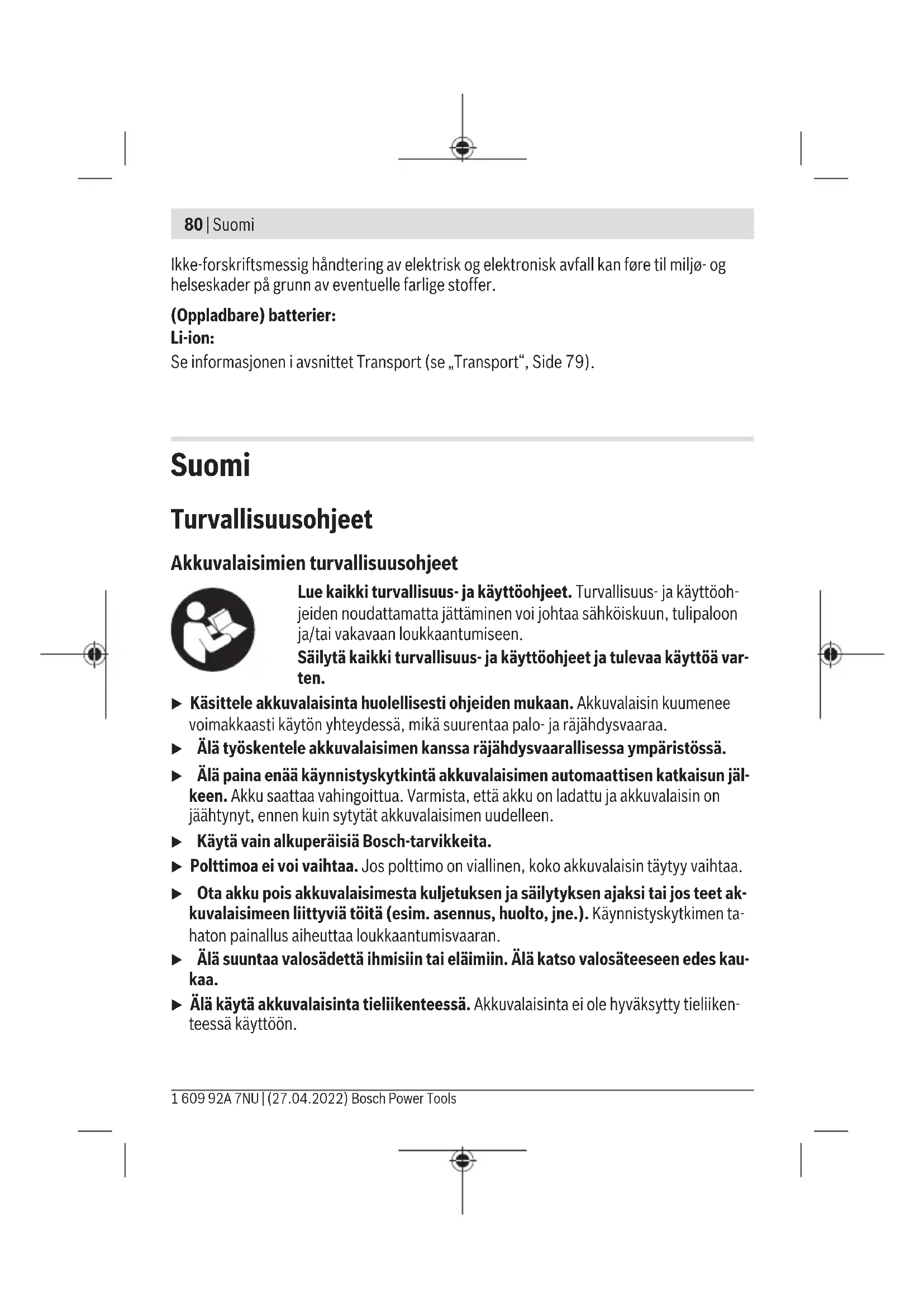 og ved lagring °C –20...+50 Anbefalte batterier GBA 18V... ProCORE18V... Anbefalte ladere GAL 18... GAX 18... GAL 36... A) Begrenset ytelse ved temperatur under 0°C Det kan hende at gjengivelsen av fargen på de belyste objektene ikke blir helt riktig. Montering Lading av batteri (tilbehør) u Bruk bare laderne som er oppført i de tekniske spesifikasjonene. Kun disse laderne er tilpasset til li-ion-batteriet som er brukt i din batteridrevne lampe. Merk: Batteriet er delvis ladet ved levering. For å sikre full effekt fra batteriet må du lade det helt opp i laderen før første gangs bruk. Litium-ion-batteriet kan lades opp til enhver tid uten at levetiden forkortes. Det skader ikke batteriet å avbryte oppladingen. Li-Ion-batteriet har "Electronic Cell Protection (ECP)" som beskytter mot dyputladning. Hvis batteriet blir utladet, sørger en beskyttelseskobling for at den batteridrevne lampen slås av. u Ikke trykk på av/på-bryteren etter at den batteridrevne lampen har blitt slått av automatisk. Batteriet kan ta skade. Kontroller at batteriet er ladet og at den batteridrevne lampen er avkjølt før du slår den på igjen. For å ta ut batteriet (4) trykker du på utløserknappen (5) og trekker batteriet ut av den batteridrevne lampen. Ikke bruk makt. Følg anvisningene for kassering. 1 609 92A 7NU | (27.04.2022) Bosch Power ToolsNorsk | 77 Bruk Igangsetting Sette inn batteriet Sett det oppladede batteriet(4) i lampehodet(3) til det låses hørbart og ligger helt inntil lampehodet. Sette opp Sett den batteridrevne lampen på et stabilt, jevnt underlag. Pass på at den står stødig. Slå på/av For å slå på den batteridrevne lampen trykker du på av/på-bryteren(2). For å slå av den batteridrevne lampen trykker du på av/på-bryteren(2) igjen. Temperaturavhengig overbelastningsvern Hvis tillatt kjøleelementtemperatur på 60°C overskrides, blinker den batteridrevne lampen 3 ganger og slås av. La den batteridrevne lampen avkjøles, og slå den på igjen. Indikator for batteriladenivå De grønne lysdiodene i batteriets ladenivåindikator viser batteriets ladenivå. Av sikkerhetsgrunner er det bare mulig å få vist ladenivået når elektroverktøyet er stoppet. Trykk på knappen for indikatoren for batteriets ladenivå eller for å se ladenivået. Dette er mulig også når batteriet er tatt ut. Hvis ingen lysdiode lyser etter at knappen for indikatoren for batteriets ladenivå er trykt inn, er batteriet defekt og må skiftes ut. Batteritype GBA 18V... Lysdioder Kapasitet Kontinuerlig lys 3× grønt 60−100% Kontinuerlig lys 2× grønt 30−60% Kontinuerlig lys 1× grønt 5−30% Blinker 1× grønt 0−5% Bosch Power Tools 1 609 92A 7NU | (27.04.2022)78 | Norsk Batteritype ProCORE18V... Lysdioder Kapasitet Kontinuerlig lys 5× grønt 80−100 % Kontinuerlig lys 4× grønt 60−80 % Kontinuerlig lys 3× grønt 40−60 % Kontinuerlig lys 2× grønt 20−40 % Kontinuerlig lys 1× grønt 5−20 % Blinker 1× grønt 0−5 % Arbeidshenvisninger Den batteridrevne lampen lyser svakere når batteritiden som gjenstår, er ≤10 minutter. Dreie lampehodet (se bildeA) Du kan svinge lampehodet(3) maksimalt 135° i trinn på 27°. Bærestropp (se bildeB) Med bærestroppen(7) kan den batteridrevne lampen bæres eller festes til en gjenstand. Service og vedlikehold Vedlikehold og rengjøring u Ta alltid ut batteriet før arbeid på den batteridrevne lampen (f.eks. montering eller vedlikehold), og før transport og oppbevaring av den batteridrevne lampen. Det er fare for skader hvis du trykker på av/på-bryteren ved en feiltagelse. Den batteridrevne lampen er vedlikeholdsfri og inneholder ingen deler som må skiftes eller vedlikeholdes. Plastglasset til den batteridrevne lampen må bare rengjøres med en tørr, myk klut, slik at det ikke skades. Bruk ikke rengjørings- eller løsemidler. Kundeservice og kundeveiledning Kundeservice hjelper deg ved spørsmål om reparasjon og vedlikehold av produktet ditt og reservedelene. Du finner også sprengskisser og informasjon om reservedeler på www.bosch-pt.com 1 609 92A 7NU | (27.04.2022) Bosch Power ToolsNorsk | 79 Boschs kundeveilederteam hjelper deg gjerne hvis du har spørsmål om våre produkter og tilbehør. Ved alle forespørsler og reservedelsbestillinger må du oppgi det 10‑sifrede produktnummeret som er angitt på produktets typeskilt. Norsk Robert Bosch AS Postboks 350 1402 Ski Tel.: 64 87 89 50 Faks: 64 87 89 55 Du finner adresser til andre verksteder på: www.bosch-pt.com/serviceaddresses Transport De anbefalte li-ion-batteriene underligger kravene for farlig gods. Batteriene kan transporteres på veier av brukeren uten ytterligere krav. Ved forsendelse gjennom tredje personer (f.eks.: lufttransport eller spedisjon) må det oppfylles spesielle krav til emballasje og merking. Du må konsultere en ekspert for farlig gods ved forberedelse av forsendelsen. Send batterier kun hvis huset ikke er skadet. Lim igjen de åpne kontaktene og pakk batteriet slik at det ikke beveger seg i emballasjen. Ta også hensyn til videreførende nasjonale forskrifter. Deponering Batterilamper, batterier, tilbehør og emballasje skal tilføres en miljøvennlig gjenvinning. Batterilamper og batterier må ikke kastes i vanlig søppel! Bare for land i EU: Ifølge det europeiske direktivet 2012/19/EU om brukt elektrisk og elektronisk utstyr og gjennomføringen av dette i nasjonalt lovverk må batteridrevne lamper som ikke lenger kan brukes, og ifølge det europeiske direktivet 2006/66/EF må defekte eller brukte oppladbare batterier / engangsbatterier, sorteres og gjenvinnes på en miljøvennlig måte. Bosch Power Tools 1 609 92A 7NU | (27.04.2022)80 | Suomi Ikke-forskriftsmessig håndtering av elektrisk og elektronisk avfall kan føre til miljø- og helseskader på grunn av eventuelle farlige stoffer. (Oppladbare) batterier: Li-ion: Se informasjonen i avsnittet Transport (se „Transport“, Side79). Suomi Turvallisuusohjeet Akkuvalaisimien turvallisuusohjeet 