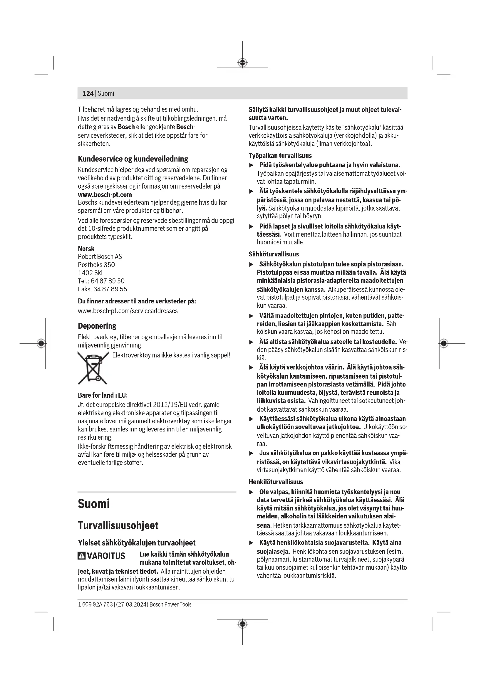 Ohuiden peltilevyjen tai muiden herkästi tärisevien suurialaisten ma- teriaalien hionta voi lisätä melutasoa jopa 15 dB:n verran. Melutasoa voi vähentää paksujen vaimennusmattojen avulla. Lisääntynyt melu- taso on huomioitava sekä melukuormituksen riskiarvioinnissa että so- pivien kuulosuojainten valinnassa. Näissä käyttöohjeissa ilmoitetut tärinä- ja melupäästötiedot on mitattu standardissa määritetyn mittausmenetelmän mu- kaan ja niitä voi käyttää sähkötyökalujen keskinäiseen vertai- luun. Ne soveltuvat myös tärinä- ja melupäästöjen alustavaan arviointiin. Ilmoitetut tärinä- ja melupäästöt vastaavat sähkötyökalun pääasiallisia käyttötapoja. Tärinä- ja melupäästöt saattavat kuitenkin poiketa ilmoitetuista arvoista, jos sähkötyökalua Bosch Power Tools 1 609 92A 763 | (27.03.2024)130 | Suomi käytetään toisiin töihin, muilla käyttötarvikkeilla tai riittämät- tömästi huollettuna. Tämä saattaa suurentaa koko työsken- telyajan tärinä- ja melupäästöjä huomattavasti. Tärinä- ja melupäästöjen tarkaksi arvioimiseksi on huomioi- tava myös ne ajat, jolloin laite on sammutettuna tai tyhjä- käynnillä. Tämä voi vähentää huomattavasti koko työskente- lyajan tärinä- ja melupäästöjä. Määrittele tarvittavat lisävarotoimenpiteet käyttäjän suojele- miseksi tärinän aiheuttamilta haitoilta (esimerkiksi sähkötyö- kalujen ja käyttötarvikkeiden huolto, käsien pitäminen lämpi- minä ja työprosessien organisointi). Pehmeä käynnistys Sähkötyökalun elektroninen pehmeä käynnistystoiminto ra- joittaa käynnistettäessä vääntömomenttia ja mahdollistaa työn tarkan aloituksen. Huomautus: jos sähkötyökalu kiihtyy käynnistettäessä heti täyteen nopeuteen, pehmeä käynnistystoiminto ja uudel- leenkäynnistyssuoja ovat epäkunnossa. Sähkötyökalu on lä- hetettävä viipymättä valtuutettuun huoltoon, katso osoitteet kohdasta "Huolto ja käyttöneuvonta". Uudelleenkäynnistyssuoja Uudelleenkäynnistyssuoja estää sähkötyökalun hallitsemat- toman käynnistymisen virtakatkoksen jälkeen. Kun haluat ottaa sähkötyökalun uudelleen käyttöön, kytke käynnistyskytkin (3) pois päältä ja käynnistä moottori uudel- leen. Tietyt häiriöimpulssit voivat joissakin harvoissa tapauksissa aktivoida uudelleenkäynnistyssuojan. Tässä tapauksessa sähkötyökalu sammuu ja pysyy kyseisessä käyttötilassa. Sähkötyökalun voi käynnistää uudelleen vapauttamalla käynnistyskytkimen(3) ja painamalla sitä uudelleen. Vakioelektroniikka