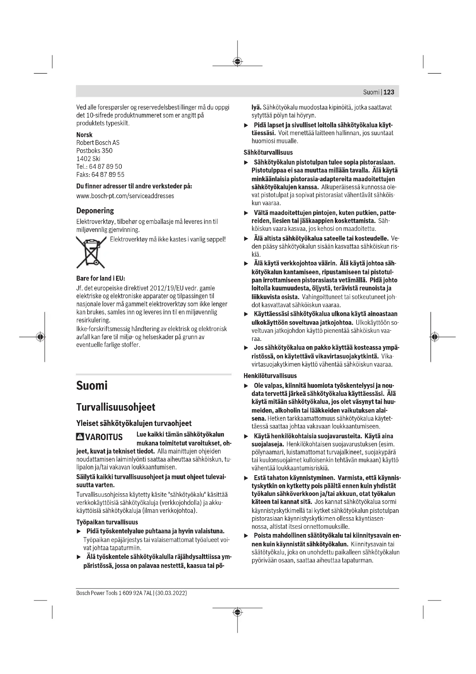 125 6 10 22,2 >0 11500 80 125 21 – 22,2 – 11500 80 Vaihteiston pään kääntäminen (katso kuvaE) u Irrota pistotulppa pistorasiasta ennen kaikkia sähkö- työkaluun kohdistuvia töitä. Vaihteiston päätä voi kääntää 90 astetta kerrallaan. Näin käynnistyskytkimen voi sijoittaa parempaan asentoon erilai- sia käyttötilanteita varten, esim. jos koneen käyttäjä on va- senkätinen. Kierrä 4 ruuvia kokonaan irti(➊). Käännä vaihteiston pää va- rovasti ja rungosta irrottamatta uuteen asentoon(➋). Ki- ristä 4 ruuvia(➌). Pölyn-/purunpoisto Työstettävistä materiaaleista syntyvä pöly (esimerkiksi lyijy- pitoinen pinnoite, tietyt puulaadut, kivi ja metalli) voi olla ter- veydelle vaarallista. Pölyn koskettaminen tai hengittäminen saattaa aiheuttaa käyttäjälle tai lähellä oleville henkilöille al- lergisia reaktioita ja/tai hengitystiesairauksia. Tiettyjen pölylaatujen (esimerkiksi tammi- tai pyökkipöly) katsotaan aiheuttavan syöpää, varsikin puunsuojaukseen käytettävien lisäaineiden yhteydessä (kromaatti, puunsuoja- aine). Asbestipitoisia materiaaleja saavat käsitellä vain asiantuntevat ammattilaiset. – Käytä mahdollisuuksien mukaan materiaalille soveltuvaa pölynpoistoa. – Huolehdi työkohteen hyvästä tuuletuksesta. – Suosittelemme käyttämään suodatusluokan P2 hengitys- suojanaamaria. Noudata käsiteltäviä materiaaleja koskevia maakohtaisia määräyksiä. u Estä pölyn kertyminen työpisteeseen. Pöly saattaa olla herkästi syttyvää. Bosch Power Tools 1 609 92A 7AL | (30.03.2022)132 | Suomi Käyttö u Älä kuormita sähkötyökalua niin voimakkaasti, että se pysähtyy. u Irrota pistotulppa pistorasiasta ennen kaikkia sähkö- työkaluun kohdistuvia töitä. u Noudata varovaisuutta leikatessasi kantavia seiniä, katso kappale "Statiikkaa koskevia ohjeita". u Kiinnitä työkappale, mikäli sen omapaino ei pidä sitä luotettavasti paikallaan. u Voimakkaan kuormituksen jälkeen sähkötyökalun on annettava käydä vielä muutaman minuutin ajan kuor- mittamatta, jotta käyttötarvike jäähtyy. u Älä käytä sähkötyökalua katkaisuhiontatelineessä. u Älä koske hioma- tai katkaisulaikkoihin, ennen kuin ne ovat jäähtyneet. Laikat kuumentuvat voimakkaasti käy- tön aikana. Työskentelyohjeita Karkea hionta u Käytä sidosteisella laikalla tehtävässä karkeahion- nassa aina hiomatöiden suojusta (8). u Älä missään tapauksessa käytä katkaisulaikkaa kar- keahiontaan. u Karkeissa hiomatöissä katkaisutöiden suojus (9) tai hiomatöiden suojus (8) ja siihen asennettu katkaisu- töiden suojain (27) saattavat osua työkappaleeseen, jolloin voit menettää työkalun hallinnan. Karkeahionnassa saat parhaat työtulokset laikan 30-40° työstökulmalla. Hio sähkötyökalulla edestakaisin liikkein ja paina sitä kevyesti pintaa vasten. Näin estät työkappaleen lii- allisen kuumenemisen sekä värjäytymien ja urien syntymi- sen. u Kun käytät sellaisia sidosteisia laikkoja, jotka on hyväk- sytty sekä katkaisu- että hiomatöihin, tällöin on käytettävä katkaisutöiden suojusta (9) tai hiomatöiden suojusta (8) ja siihen asennettua katkaisutöiden suojainta (27). Pintojen hiominen lamellilaikalla u Käytä lamellilaikalla tehtävissä hiomatöissä aina hio- matöiden suojusta(8). Lamellilaikan (lisätarvike) avulla voit hioa myös kaarevia pin- toja ja profiileita. Lamellilaikat takaavat huomattavasti pi- demmän käyttöiän, hiljaisemman käyttömelun ja viileämmän hionnan tavanomaisiin hiomalaikkoihin verrattuna. Pintojen hiominen hiomalautasella u Asenna kumisen hiomalautasen (22) käyttöä varten aina käsisuojus (21). Hiomalautasella tehtävät hiomatyöt voi tehdä ilman suojusta. Asennusjärjestys on esitetty kuvasivulla. Ruuvaa rengasmutteri(24) paikalleen ja kiristä se laikka- avaimen avulla. Kuppiharja/harjalaikka/kartioharja u Käytä harjalaikalla tehtävissä harjaustöissä aina hio- matöiden suojusta(8). Kuppiharjalla/kartioharjalla tehtävät harjaustyöt voi tehdä ilman suojusta. u Asenna kuppiharjan tai kartioharjan käyttöä varten aina käsisuojus (21). u Harjalaikkojen teräslangat saattavat tarttua suojuk- seen ja murtua, jos harjalaikan koko ylittää sallitut mi- tat. Asennusjärjestys on esitetty kuvasivulla. M14-kierteinen kuppiharja/kartioharja/harjalaikka täytyy ruuvata kunnolla kiinni hiomakaran laipan kierteen loppuun asti. Kiristä kuppiharja/kartioharja/harjalaikka kiintoavaimen avulla. Kun kiinnität halkaisijaltaan 22,22mm:n harjalaikan, asenna kiinnityslaippa O-renkaan (10) kanssa hiomakaraan (18), ruuvaa rengasmutteri (24) paikalleen ja kiristä se laikka- avaimella. Metallin katkaisutyöt u Kun katkaiset metalliosia sidosteisella katkaisulai- kalla tai timanttikatkaisulaikalla, käytä aina katkaisu- töiden suojusta (9) tai hiomatöiden suojusta (8) ja sii- hen asennettua katkaisutöiden suojainta (27). u Jos käytät hiomatöiden suojusta (8) sidosteisella kat- kaisulaikalla tehtävissä katkaisutöissä, tämä heiken- tää työturvallisuutta kipinöiden ja sirujen sekä lai- kasta murtuvien palojen takia. Katkaise työkappale kyseiselle materiaalille sopivalla työs- kentelynopeudella. Älä paina tai kallista katkaisulaikkaa äläkä liikuta sitä edestakaisin. Älä jarruta pysäytettävää katkaisulaikkaa laikan kylkiä vasten painamalla. Sähkötyökalua täytyy aina ohjata pyörimissuunnan vastaisesti. Muuten on vaara, että laikka tempau- tuu hallitsemattomasti ulos leikkausurasta. Aseta laikka profiilien ja nelikul- maputkien katkaisussa mie- luiten pienimmän poikki- leikkauksen kohdalle. Kiven katkaisutyöt u Kun katkaiset kiviosia sidosteisella katkaisulaikalla tai kivimateriaaleille/betonille tarkoitetulla timantti- katkaisulaikalla, käytä aina ohjaustuella varustettua katkaisutöiden suojusta (19) tai katkaisutöiden suo- justa (9) tai hiomatöiden suojusta (8) ja siihen asen- nettua katkaisutöiden suojainta (27). u Käytä riittävän tehokast