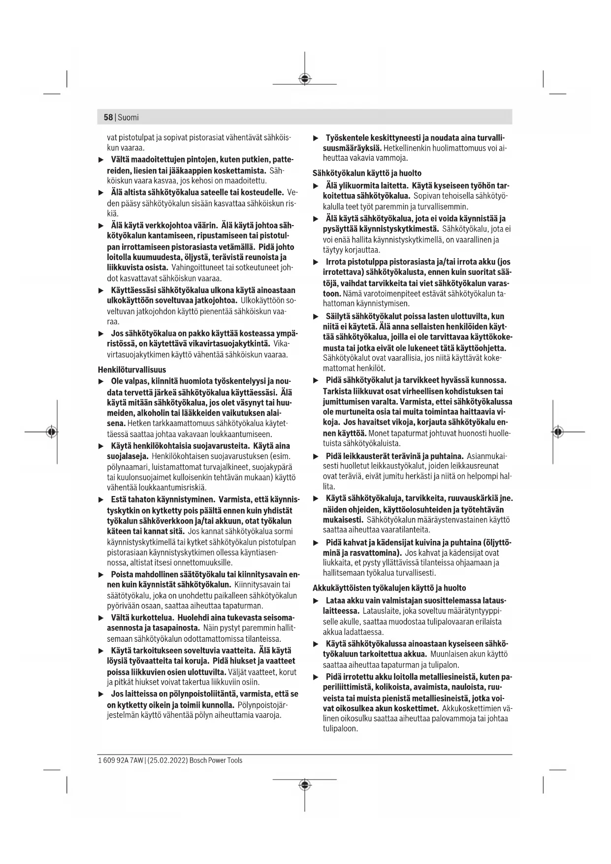 0,7 Aluminium 200 2,0 Smøring/kjøling av stempelet For å forlenge stempelets(8) levetid bør du bruke et smøremiddel med god kjølefunksjon (f.eks. skjæreolje). Påfør smøremiddel på oversiden av platen langs den planlagte skjærelinjen. Skjæring etter oppriss eller med mal Rette snitt er enklere hvis du fører elektroverktøyet langs et linjal. Konturer kan skjæres ved å føre elektroverktøyet langs et mal. Til innvendig utskjæring er det nødvendig å forbore med en diameter på 22mm. Temperaturavhengig overbelastningsvern Ved forskriftsmessig bruk kan ikke elektroverktøyet overbelastes. Hvis belastningen blir for stor eller batteritemperaturen ikke er i samsvar med spesifikasjonene, reduseres slagtallet, eller elektroverktøyet slås av. Ved redusert slagtall går ikke elektroverktøyet med fullt slagtall igjen før tillatt batteritemperatur er nådd. Ved automatisk utkobling slår du av elektroverktøyet, lar batteriet avkjøles og slår på elektroverktøyet igjen. Service og vedlikehold Vedlikehold og rengjøring u Ta alltid batteriet ut av elektroverktøyet før arbeider på elektroverktøyet utføres (f.eks. vedlikehold, verktøyskifte osv.) og før transport og oppbevaring. Det er fare for skader hvis du trykker på av/på-bryteren ved en feiltagelse. u Hold selve elektroverktøyet og ventilasjonsslissene alltid rene, for å kunne arbeide bra og sikkert. Rengjør stempelet(8) og matrisen(9) hver 3. driftstime. Skift stempelet og matrisen i god tid ved slitasje, for kun skarpe verktøy skjærer bra og skåner elektroverktøyet. Stempelet(8) og matrisen(9) skal ikke etterslipes. Utskifting av matrisen Skru fingerskruen(11) ut av matriseholderen(7). Ta ut matrisen(9). 1 609 92A 7AW | (25.02.2022) Bosch Power ToolsSuomi | 57 Rengjør eventuelt matriseholderen(7). Sett en ny, godt smurt matrise(9) i matriseholderen. Pass da på retningen til den flate siden. Stram fingerskruen(11) med påsatt gummiring(10) igjen. Trekk til skruen mot motstanden til gummiringen ved hjelp av en unbrakonøkkel (3−4Nm). Utskifting av stempelet Løsne skruen(4) til matriseholderen, og trekk matriseholderen(7) helt ut av huset. Skyv stempelet(8) ut av festet på siden, og trekk det ned og ut. Sett et nytt stempel(8) som er godt smurt med olje, i sporet til festet, og sentrer det. Skyv matriseholderen(7) forsiktig tilbake i huset over stempelet. Drei matriseholderen til en av de tre mulige posisjonene avhengig av ønsket skjæreretning. Stram skruen(4) til matriseholderen godt. Kundeservice og kundeveiledning Kundeservice hjelper deg ved spørsmål om reparasjon og vedlikehold av produktet ditt og reservedelene. Du finner også sprengskisser og informasjon om reservedeler på www.bosch-pt.com Boschs kundeveilederteam hjelper deg gjerne hvis du har spørsmål om våre produkter og tilbehør. Ved alle forespørsler og reservedelsbestillinger må du oppgi det 10‑sifrede produktnummeret som er angitt på produktets typeskilt. Norsk Robert Bosch AS Postboks 350 1402 Ski Tel.: 64 87 89 50 Faks: 64 87 89 55 Du finner adresser til andre verksteder på: www.bosch-pt.com/serviceaddresses Transport De anbefalte li-ion-batteriene underligger kravene for farlig gods. Batteriene kan transporteres på veier av brukeren uten ytterligere krav. Ved forsendelse gjennom tredje personer (f.eks.: lufttransport eller spedisjon) må det oppfylles spesielle krav til emballasje og merking. Du må konsultere en ekspert for farlig gods ved forberedelse av forsendelsen. Send batterier kun hvis huset ikke er skadet. Lim igjen de åpne kontaktene og pakk batteriet slik at det ikke beveger seg i emballasjen. Ta også hensyn til videreførende nasjonale forskrifter. Deponering Elektroverktøy, batterier, tilbehør og emballasje må leveres inn til miljøvennlig gjenvinning. Elektroverktøy og batterier må ikke kastes i vanlig søppel! Bare for land i EU: Ifølge det europeiske direktivet 2012/19/EU om brukt elektrisk og elektronisk utstyr og gjennomføringen av dette i nasjonalt lovverk må elektroverktøy som ikke lenger kan brukes, og ifølge det europeiske direktivet 2006/66/EC må defekte eller brukte oppladbare batterier / engangsbatterier, sorteres og gjenvinnes på en miljøvennlig måte. Ikke-forskriftsmessig håndtering av elektrisk og elektronisk avfall kan føre til miljø- og helseskader på grunn av eventuelle farlige stoffer. (Oppladbare) batterier: Li-ion: Se informasjonen i avsnittet Transport (se „Transport“, Side57). Suomi Turvallisuusohjeet Yleiset sähkötyökalujen turvaohjeet VAROITUS Lue kaikki tämän sähkötyökalun mukana toimitetut varoitukset, oh- jeet, kuvat ja tekniset tiedot. Alla mainittujen ohjeiden noudattamisen laiminlyönti saattaa aiheuttaa sähköiskun, tu- lipalon ja/tai vakavan loukkaantumisen. Säilytä kaikki turvallisuusohjeet ja muut ohjeet tulevai- suutta varten. Turvallisuusohjeissa käytetty käsite "sähkötyökalu" käsittää verkkokäyttöisiä sähkötyökaluja (verkkojohdolla) ja akku- käyttöisiä sähkötyökaluja (ilman verkkojohtoa). Työpaikan turvallisuus u Pidä työskentelyalue puhtaana ja hyvin valaistuna. Työpaikan epäjärjestys tai valaisemattomat työalueet voi- vat johtaa tapaturmiin. u Älä työskentele sähkötyökalulla räjähdysalttiissa ym- päristössä, jossa on palavaa nestettä, kaasua tai pö- lyä. Sähkötyökalu muodostaa kipinöitä, jotka saattavat sytyttää pölyn tai höyryn. u Pidä lapset ja sivulliset loitolla sähkötyökalua käyt- täessäsi. Voit menettää laitteen hallinnan, jos suuntaat huomiosi muualle. Sähköturvallisuus u Sähkötyökalun pistotulpan tulee sopia pistorasiaan. Pistotulppaa ei saa muuttaa millään tavalla. Älä käytä minkäänlaisia pistorasia-adaptereita maadoitettujen sähkötyökalujen kanssa. Alkuperäisessä kunnossa ole- Bosch Power Tools 1 609 92A 7AW | (25.02.2022)58 | Suomi vat pistotulpat ja sopivat pistorasiat vähentävät sähköis- kun vaaraa. u Vältä maadoitettujen pintojen, kute