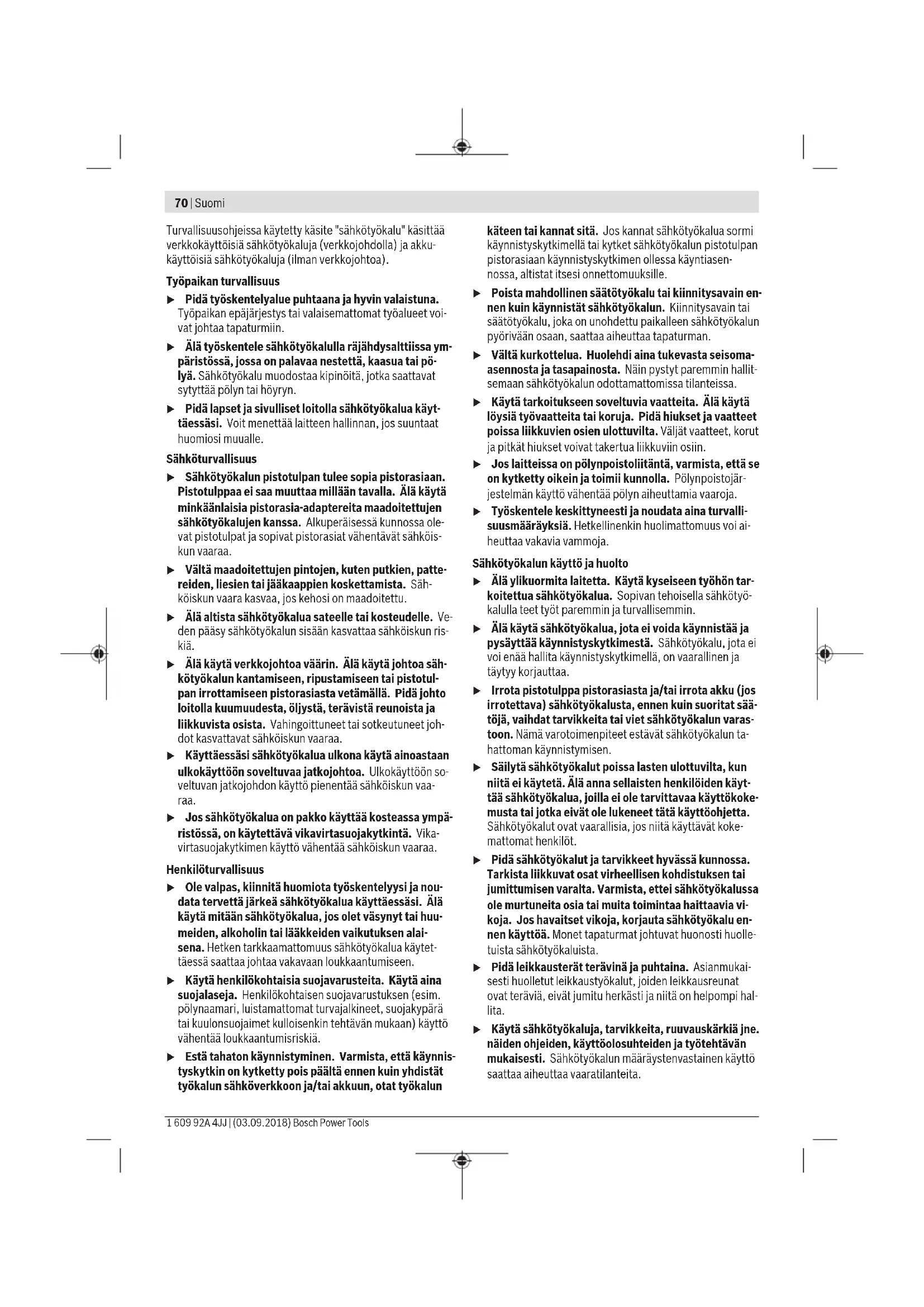 M16 55 73 92 98 110 122 147 165 196 275 330 Tips Før innskruing av større, lengre skruer i harde materialer bør du forbore med kjernediameteren til gjengene til ca. 2/3 av skruelengden. Merknad: Pass på at det ikke kommer metalliske smådeler inn i elektroverktøyet. Belteklips (se bilde E) Med belteklipset (17) kan du f.eks. henge elektroverktøyet i et belte. Du har da begge hender ledig og elektroverktøyet er alltid lett tilgjengelig. Fargeklips (se bilde F) Med fargeklipset (18) kan du merke elektroverktøyet individuelt. Råd om optimal bruk av det oppladbare batteriet Beskytt batteriet mot fuktighet og vann. Batteriet må oppbevares ved temperatur fra –20 til 50 °C. Du må for eksempel ikke la det ligge i bilen om sommeren. Rengjør ventilasjonsslissene på batteriet regelmessig med en myk, ren og tørr pensel. En vesentlig kortere driftstid etter oppladingen er et tegn på at batteriet er oppbrukt og må skiftes ut. Følg informasjonene om kassering. Service og vedlikehold Vedlikehold og rengjøring u Ta alltid batteriet ut av elektroverktøyet før arbeider på elektroverktøyet utføres (f.eks. vedlikehold, verktøyskifte osv.) og før transport og oppbevaring. Det er fare for skader hvis du trykker på av/på-bryteren ved en feiltagelse. u Hold selve elektroverktøyet og ventilasjonsslissene alltid rene, for å kunne arbeide bra og sikkert. Kundeservice og kundeveiledning Kundeservice hjelper deg ved spørsmål om reparasjon og vedlikehold av produktet ditt og reservedelene. Du finner også sprengskisser og informasjon om reservedeler på www.bosch-pt.com Boschs kundeveilederteam hjelper deg gjerne hvis du har spørsmål om våre produkter og tilbehør. Ved alle forespørsler og reservedelsbestillinger må du oppgi det 10‑sifrede produktnummeret som er angitt på produktets typeskilt. Norsk Robert Bosch AS Postboks 350 1402 Ski Tel.: 64 87 89 50 Faks: 64 87 89 55 Transport Li-ion-batteriene i verktøyet underligger kravene for farlig gods. Batteriene kan transporteres på veier av brukeren uten ytterligere krav. Ved forsendelse gjennom tredje personer (f.eks.: lufttransport eller spedisjon) må det oppfylles spesielle krav til emballasje og merking. Du må konsultere en ekspert for farlig gods ved forberedelse av forsendelsen. Send batterier kun hvis huset ikke er skadet. Lim igjen de åpne kontaktene og pakk batteriet slik at det ikke beveger seg i emballasjen. Ta også hensyn til videreførende nasjonale forskrifter. Deponering Elektroverktøy, batterier, tilbehør og emballasje må leveres inn til miljøvennlig gjenvinning. Elektroverktøy og batterier må ikke kastes i vanlig søppel! Bare for land i EU: Iht. det europeiske direktivet 2012/19/EU om brukt elektrisk utstyr og iht. det europeiske direktivet 2006/66/ EC må defekte eller brukte batterier/oppladbare batterier samles adskilt og leveres inn for miljøvennlig resirkulering. (Oppladbare) batterier: Li-ion: Se informasjonen i avsnittet Transport (se „Transport“, Side69). Suomi Turvallisuusohjeet Yleiset sähkötyökalujen turvaohjeet VAROITUS Lue kaikki tämän sähkötyökalun mukana toimitetut varoitukset, oh- jeet, kuvat ja tekniset tiedot. Alla mainittujen ohjeiden noudattamisen laiminlyönti saattaa aiheuttaa sähköiskun, tu- lipalon ja/tai vakavan loukkaantumisen. Säilytä kaikki turvallisuusohjeet ja muut ohjeet tulevai- suutta varten. Suomi | 69 Bosch Power Tools 1 609 92A 4JJ | (03.09.2018)70 | Suomi 1 609 92A 4JJ | (03.09.2018) Bosch Power Tools Turvallisuusohjeissa käytetty käsite "sähkötyökalu" käsittää verkkokäyttöisiä sähkötyökaluja (verkkojohdolla) ja akku- käyttöisiä sähkötyökaluja (ilman verkkojohtoa). Työpaikan turvallisuus u Pidä työskentelyalue puhtaana ja hyvin valaistuna. Työpaikan epäjärjestys tai valaisemattomat työalueet voi- vat johtaa tapaturmiin. u Älä työskentele sähkötyökalulla räjähdysalttiissa ym- päristössä, jossa on palavaa nestettä, kaasua tai pö- lyä. Sähkötyökalu muodostaa kipinöitä, jotka saattavat sytyttää pölyn tai höyryn. u Pidä lapset ja sivulliset loitolla sähkötyökalua käyt- täessäsi. Voit menettää laitteen hallinnan, jos suuntaat huomiosi muualle. Sähköturvallisuus u Sähkötyökalun pistotulpan tulee sopia pistorasiaan. Pistotulppaa ei saa muuttaa millään tavalla. Älä käytä minkäänlaisia pistorasia-adaptereita maadoitettujen sähkötyökalujen kanssa. Alkuperäisessä kunnossa ole- vat pistotulpat ja sopivat pistorasiat vähentävät sähköis- kun vaaraa. u Vältä maadoitettujen pintojen, kuten putkien, patte- reiden, liesien tai jääkaappien koskettamista. Säh- köiskun vaara kasvaa, jos kehosi on maadoitettu. u Älä altista sähkötyökalua sateelle tai kosteudelle. Ve- den pääsy sähkötyökalun sisään kasvattaa sähköiskun ris- kiä. u Älä käytä verkkojohtoa väärin. Älä käytä johtoa säh- kötyökalun kantamiseen, ripustamiseen tai pistotul- pan irrottamiseen pistorasiasta vetämällä. Pidä johto loitolla kuumuudesta, öljystä, terävistä reunoista ja liikkuvista osista. Vahingoittuneet tai sotkeutuneet joh- dot kasvattavat sähköiskun vaaraa. u Käyttäessäsi sähkötyökalua ulkona käytä ainoastaan ulkokäyttöön soveltuvaa jatkojohtoa. Ulkokäyttöön so- veltuvan jatkojohdon käyttö pienentää sähköiskun vaa- raa. u Jos sähkötyökalua on pakko käyttää kosteassa ympä- ristössä, on käytettävä vikavirtasuojakytkintä. Vika- virtasuojakytkimen käyttö vähentää sähköiskun vaaraa. Henkilöturvallisuus u Ole valpas, kiinnitä huomiota työskentelyysi ja nou- data tervettä järkeä sähkötyökalua käyttäessäsi. Älä käytä mitään sähkötyökalua, jos olet väsynyt tai huu- meiden, alkoholin tai lääkkeiden vaikutuksen alai- sena. Hetken tarkkaamattomuus sähkötyökalua käytet- täessä saattaa johtaa vakavaan loukkaantumiseen. u Käytä henkilökohtaisia suojavarusteita. Käytä aina suojalaseja. Henkilökohtaisen suojavarustu