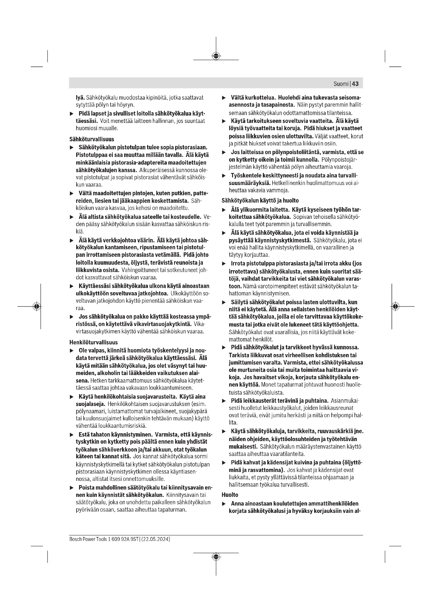 0,7 Aluminium 200 2,0 Bosch Power Tools 1 609 92A 9ST | (22.05.2024)42 | Suomi Smøring/kjøling av stempelet For å forlenge stempelets(6) levetid bør du bruke et smøremiddel med god kjølefunksjon (f.eks. skjæreolje). Påfør smøremiddel på oversiden av platen langs den planlagte skjærelinjen. Skjæring etter oppriss eller med mal Rette snitt er enklere hvis du fører elektroverktøyet langs et linjal. Konturer kan skjæres ved å føre elektroverktøyet langs et mal. Til innvendig utskjæring er det nødvendig å forbore med en diameter på 21mm. Service og vedlikehold Vedlikehold og rengjøring u Før alle arbeider på elektroverktøyet utføres må støpselet trekkes ut av stikkontakten. u Hold selve elektroverktøyet og ventilasjonsslissene alltid rene, for å kunne arbeide bra og sikkert. Hvis det er nødvendig å skifte ut tilkoblingsledningen, må dette gjøres av Bosch eller godkjente Bosch- serviceverksteder, slik at det ikke oppstår fare for sikkerheten. Rengjør stempelet(6) og matrisen(7) hver 3. driftstime. Skift stempelet og matrisen i god tid ved slitasje, for kun skarpe verktøy skjærer bra og skåner elektroverktøyet. Stempelet(6) og matrisen(7) skal ikke etterslipes. Utskifting av matrisen Skru fingerskruen(9) ut av matriseholderen(5). Ta ut matrisen(7). Rengjør eventuelt matriseholderen(5). Sett en ny, godt smurt matrise(7) i matriseholderen. Pass da på retningen til den flate siden. Stram fingerskruen(9) med påsatt gummiring(8) igjen. Trekk til skruen mot motstanden til gummiringen ved hjelp av en unbrakonøkkel (3−4Nm). Utskifting av stempelet Løsne skruen(2) til matriseholderen, og trekk matriseholderen(5) helt ut av huset. Skyv stempelet(6) ut av festet på siden, og trekk det ned og ut. Sett et nytt stempel(6) som er godt smurt med olje, i sporet til festet, og sentrer det. Skyv matriseholderen(5) forsiktig tilbake i huset over stempelet. Drei matriseholderen til en av de tre mulige posisjonene avhengig av ønsket skjæreretning. Stram skruen(2) til matriseholderen godt. Kundeservice og kundeveiledning Kundeservice hjelper deg ved spørsmål om reparasjon og vedlikehold av produktet ditt og reservedelene. Du finner også sprengskisser og informasjon om reservedeler på www.bosch-pt.com Boschs kundeveilederteam hjelper deg gjerne hvis du har spørsmål om våre produkter og tilbehør. Ved alle forespørsler og reservedelsbestillinger må du oppgi det 10‑sifrede produktnummeret som er angitt på produktets typeskilt. Norsk Robert Bosch AS Postboks 350 1402 Ski Tel.: 64 87 89 50 Faks: 64 87 89 55 Du finner adresser til andre verksteder på: www.bosch-pt.com/serviceaddresses Deponering Elektroverktøy, tilbehør og emballasje må leveres inn til miljøvennlig gjenvinning. Elektroverktøy må ikke kastes i vanlig søppel! Bare for land i EU: Elektroverktøy som ikke lenger er i brukbar stand, skal leveres til kildesortering. Bruk innsamlingssystemene som er beregnet for dette formålet. Ikke-forskriftsmessig håndtering av elektrisk og elektronisk avfall kan føre til miljø- og helseskader på grunn av eventuelle farlige stoffer. Suomi Turvallisuusohjeet Yleiset sähkötyökalujen turvaohjeet VAROITUS Lue kaikki tämän sähkötyökalun mukana toimitetut varoitukset, oh- jeet, kuvat ja tekniset tiedot. Alla mainittujen ohjeiden noudattamisen laiminlyönti saattaa aiheuttaa sähköiskun, tu- lipalon ja/tai vakavan loukkaantumisen. Säilytä kaikki turvallisuusohjeet ja muut ohjeet tulevai- suutta varten. Turvallisuusohjeissa käytetty käsite "sähkötyökalu" käsittää verkkokäyttöisiä sähkötyökaluja (verkkojohdolla) ja akku- käyttöisiä sähkötyökaluja (ilman verkkojohtoa). Työpaikan turvallisuus u Pidä työskentelyalue puhtaana ja hyvin valaistuna. Työpaikan epäjärjestys tai valaisemattomat työalueet voi- vat johtaa tapaturmiin. u Älä työskentele sähkötyökalulla räjähdysalttiissa ym- päristössä, jossa on palavaa nestettä, kaasua tai pö- 1 609 92A 9ST | (22.05.2024) Bosch Power ToolsSuomi | 43 lyä. Sähkötyökalu muodostaa kipinöitä, jotka saattavat sytyttää pölyn tai höyryn. u Pidä lapset ja sivulliset loitolla sähkötyökalua käyt- täessäsi. Voit menettää laitteen hallinnan, jos suuntaat huomiosi muualle. Sähköturvallisuus u Sähkötyökalun pistotulpan tulee sopia pistorasiaan. Pistotulppaa ei saa muuttaa millään tavalla. Älä käytä minkäänlaisia pistorasia-adaptereita maadoitettujen sähkötyökalujen kanssa. Alkuperäisessä kunnossa ole- vat pistotulpat ja sopivat pistorasiat vähentävät sähköis- kun vaaraa. u Vältä maadoitettujen pintojen, kuten putkien, patte- reiden, liesien tai jääkaappien koskettamista. Säh- köiskun vaara kasvaa, jos kehosi on maadoitettu. u Älä altista sähkötyökalua sateelle tai kosteudelle. Ve- den pääsy sähkötyökalun sisään kasvattaa sähköiskun ris- kiä. u Älä käytä verkkojohtoa väärin. Älä käytä johtoa säh- kötyökalun kantamiseen, ripustamiseen tai pistotul- pan irrottamiseen pistorasiasta vetämällä. Pidä johto loitolla kuumuudesta, öljystä, terävistä reunoista ja liikkuvista osista. Vahingoittuneet tai sotkeutuneet joh- dot kasvattavat sähköiskun vaaraa. u Käyttäessäsi sähkötyökalua ulkona käytä ainoastaan ulkokäyttöön soveltuvaa jatkojohtoa. Ulkokäyttöön so- veltuvan jatkojohdon käyttö pienentää sähköiskun vaa- raa. u Jos sähkötyökalua on pakko käyttää kosteassa ympä- ristössä, on käytettävä vikavirtasuojakytkintä. Vika- virtasuojakytkimen käyttö vähentää sähköiskun vaaraa. Henkilöturvallisuus u Ole valpas, kiinnitä huomiota työskentelyysi ja nou- data tervettä järkeä sähkötyökalua käyttäessäsi. Älä käytä mitään sähkötyökalua, jos olet väsynyt tai huu- meiden, alkoholin tai lääkkeiden vaikutuksen alai- sena. Hetken tarkkaamattomuus sähkötyökalua käytet- täessä saattaa johtaa vakavaan loukkaantumiseen. u Käytä henkilökohtaisia suojavarusteita.