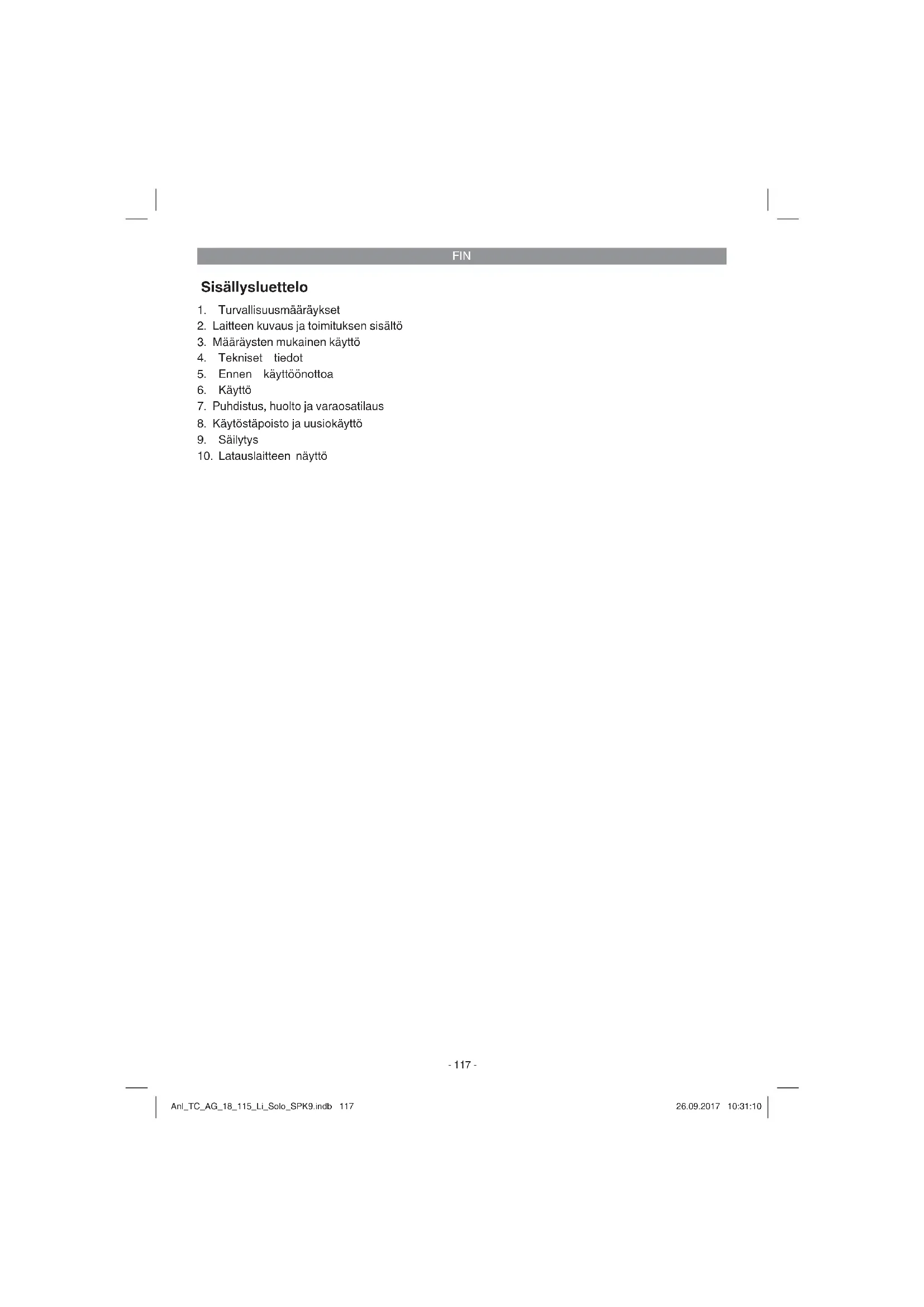 Koskee ainoastaan EU-maita Älä heitä sähkötyökaluja kotitalousjätteisiin! Euroopan direktiivin 2012/19/EY loppuunkäytetyistä sähkö- ja elektronisista laitteista ja sen kansallisek- si laiksi muuntamisen mukaan tulee käytetyt sähkötyökalut koota erikseen ja toimittaa ne ympäristöystä- välliseen kierrätykseen. Kierrätysvaihtoehto takaisinlähetykselle: Sähkölaitteen omistaja on velvoitettu laitteen palauttamisen vaihtoehtona vaikuttamaan siihen, että hänen luovuttamansa omaisuus hävitetään asianmukaisesti. Loppuun käytetty laite voidaan tätä varten luovuttaa myös keräyspisteeseen, joka suorittaa sen käytöstäpoiston kansallisten kierrätystalous- ja jätehuoltolakien tarkoittamalla tavalla. Tämä ei koske käytettyihin laitteisiin liitettyjä lisävarusteita ja apu- välineitä, joissa ei ole sähköosia. Tuotedokumentaation ja tuotteen mukana toimitettujen papereiden osittainenkin kopiointi tai muu monis- taminen on sallittu ainoastaan iSC GmbH:n nimenomaisella luvalla. Oikeus teknisiin muutoksiin pidätetään Anl_TC_AG_18_115_Li_Solo_SPK9.indb 125Anl_TC_AG_18_115_Li_Solo_SPK9.indb 125 26.09.2017 10:31:1126.09.2017 10:31:11FIN