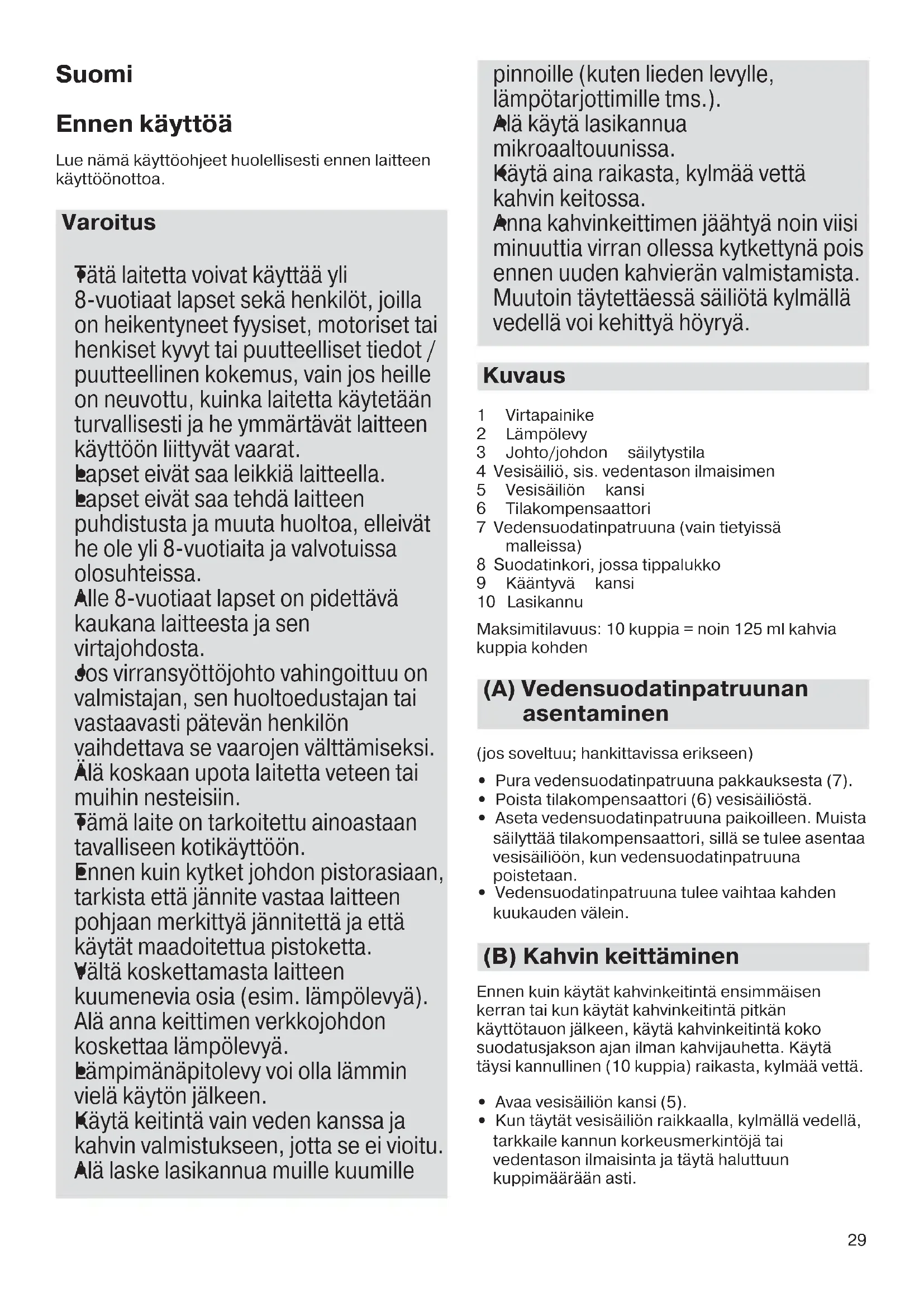 Anna kahvinkeittimen jäähtyä noin viisi minuuttia virran ollessa kytkettynä pois ennen uuden kahvierän valmistamista. Muutoin täytettäessä säiliötä kylmällä vedellä voi kehittyä höyryä. Kuvaus 1 Virtapainike 2 Lämpölevy 3 Johto/johdon säilytystila 4 Vesisäiliö, sis. vedentason ilmaisimen 5 Vesisäiliön kansi 6 Tilakompensaattori 7 Vedensuodatinpatruuna (vain tietyissä malleissa) 8 Suodatinkori, jossa tippalukko 9 Kääntyvä kansi 10 Lasikannu Maksimitilavuus: 10 kuppia = noin 125 ml kahvia kuppia kohden (A) Vedensuodatinpatruunan asentaminen (jos soveltuu; hankittavissa erikseen)