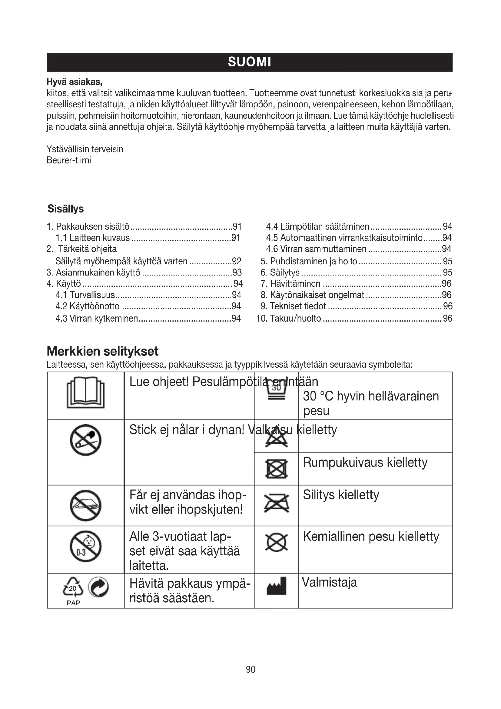 steellisesti testattuja, ja niiden käyttöalueet liittyvät lämpöön, painoon, verenpaineeseen, kehon lämpötilaan, pulssiin, pehmeisiin hoitomuotoihin, hierontaan, kauneudenhoitoon ja ilmaan. Lue tämä käyttöohje huolellisesti ja noudata siinä annettuja ohjeita. Säilytä käyttöohje myöhempää tarvetta ja laitteen muita käyttäjiä varten. Ystävällisin terveisin Beurer-tiimi