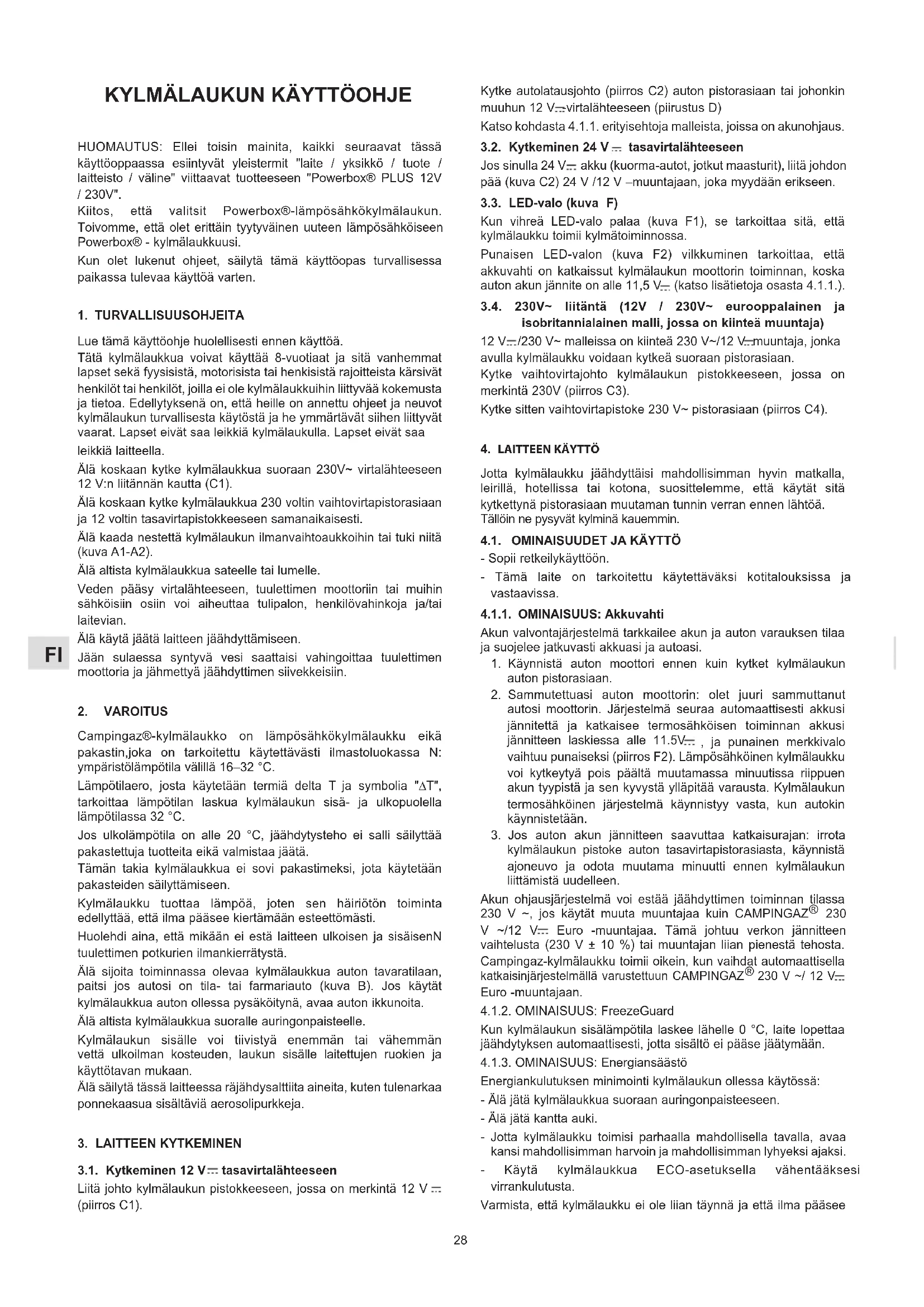 3.1. Kytkeminen 12 V tasavirtalähteeseen Liitä johto kylmälaukun pistokkeeseen, jossa on merkintä 12 V (piirros C1).29
