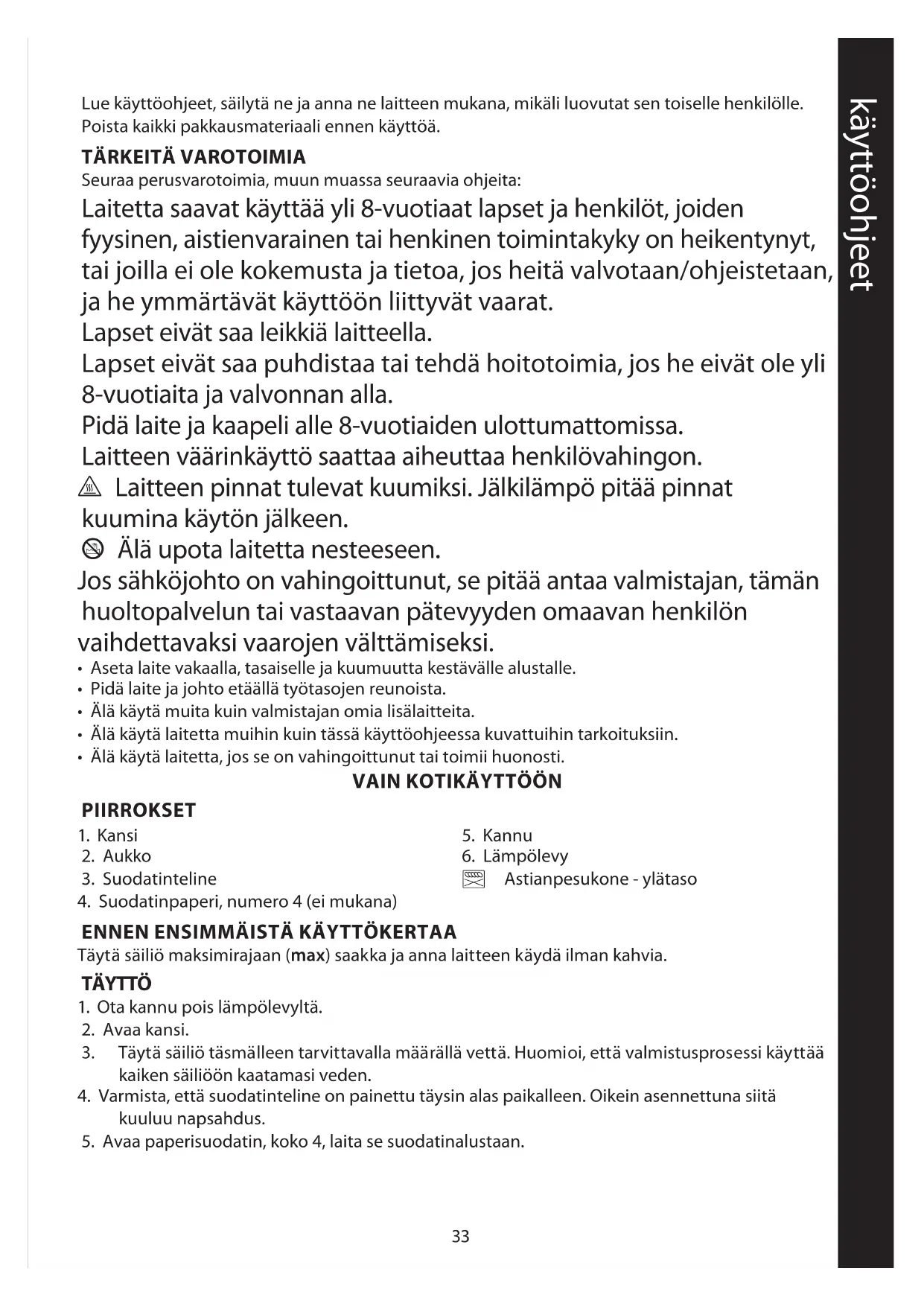 Seuraa perusvarotoimia, muun muassa seuraavia ohjeita: Laitetta saavat käyttää yli 8-vuotiaat lapset ja henkilöt, joiden fyysinen, aistienvarainen tai henkinen toimintakyky on heikentynyt, tai joilla ei ole kokemusta ja tietoa, jos heitä valvotaan/ohjeistetaan, ja he ymmärtävät käyttöön liittyvät vaarat. Lapset eivät saa leikkiä laitteella. Lapset eivät saa puhdistaa tai tehdä hoitotoimia, jos he eivät ole yli 8-vuotiaita ja valvonnan alla. Pidä laite ja kaapeli alle 8-vuotiaiden ulottumattomissa. Laitteen väärinkäyttö saattaa aiheuttaa henkilövahingon. h Laitteen pinnat tulevat kuumiksi. Jälkilämpö pitää pinnat kuumina käytön jälkeen. l Älä upota laitetta nesteeseen. Jos sähköjohto on vahingoittunut, se pitää antaa valmistajan, tämän huoltopalvelun tai vastaavan pätevyyden omaavan henkilön vaihdettavaksi vaarojen välttämiseksi.